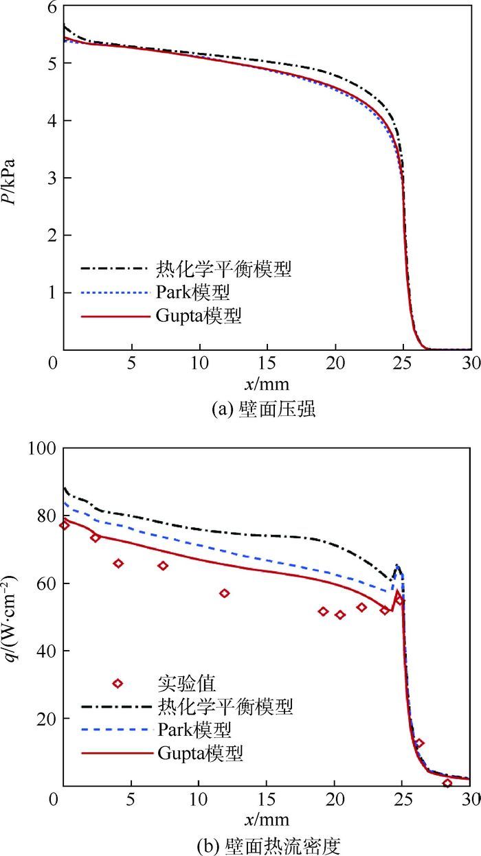 高超声速气动加热严重,考虑热化学非平衡对气动热环境影响,可以为热防护系统设计提供有效保障。采用Park和Gupta热化学非平衡模型,数值计算研究5组元(N2,O2,N,O,NO),17组化学反应的热化学非平衡效应对高超声速飞行器气动热环境影响,并与完全气体和热化学平衡模型进行对比分析。热化学非平衡模型流场温度及激波距离均比完全气体模型小。激波后气体密度因离解、化学反应而增大,且气体密度越大,激波距离越小,热化学平衡模型激波距离最小。完全气体和热化学平衡模型热流载荷计算值均比实验值偏大。Park和Gupta热化学非平衡模型数值计算激波距离及气动力载荷差别小。Park模型热流载荷计算值偏大,Gupta模型与实验结果相符,它可对气动热环境可靠预测。