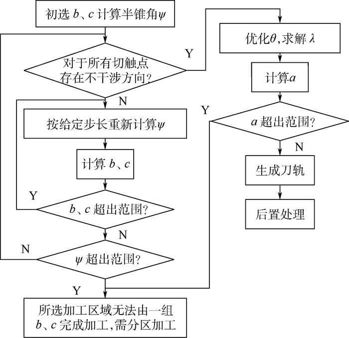 为扩展4轴机床的加工能力,使4轴机床具有使用鼓形刀具加工叶轮类零件的能力,将4轴机床扩展至4+2轴机床。从机构学角度对4+2轴机床进行运动学分析,证明了4+2轴加工方法的刀具姿态具有一个可优化的角度。根据机床运动链模型,推导了机床半联动轴参数与刀具姿态角度、联动轴运动参数之间的运动变换关系,得到了求解切触点处刀位信息的方法。根据对复杂曲面的几何分析、刀具干涉和机床运动范围,给出了一种4+2轴加工叶片的2个半联动轴参数选择方法。推导了4+2轴加工方法的刀轨生成算法。通过4+2轴叶轮加工实验,验证了4+2轴加工方法的可行性。实验结果表明,4+2轴加工方法生成的刀轨可用,使用4+2轴加工方法加工叶轮叶片的方案是可行的,具有生产应用价值。
