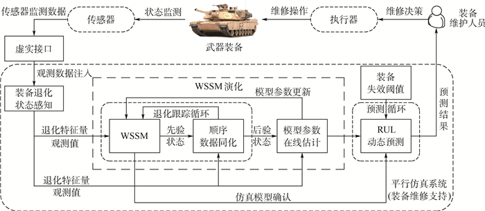 装备平行仿真是系统建模与仿真领域的新兴仿真技术,已经成为研究热点。在装备维修保障领域中,分析了装备剩余寿命(RUL)预测存在的突出问题,即模型参数固定、不具备自适应演化能力,成为阻碍实现装备剩余寿命自适应预测的首要因素。结合装备平行仿真理论,在建模分析的基础上提出了面向装备剩余寿命预测的平行仿真框架,该框架以Wiener状态空间模型为基础仿真模型,在动态注入的装备退化观测数据驱动下,利用期望最大化(EM)算法在线更新模型参数,并利用卡尔曼滤波(KF)算法实现仿真输出数据与观测数据的同化(DA),从而实现仿真模型动态演化,使得仿真输出不断逼近装备真实退化状态,为准确预测剩余寿命提供高逼真度仿真模型和数据输出。以某轴承性能退化数据为数据驱动源,对该框架进行了验证,仿真结果表明平行仿真方法能准确仿真装备性能退化过程,在提高预测精度的基础上实现了装备剩余寿命的自适应预测,有力证明了平行仿真方法的可行性和有效性。