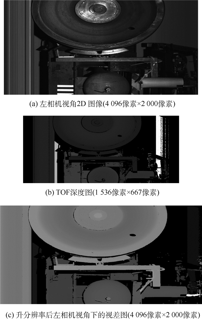 为了解决铁路火车等结构单一环境的三维重建问题,提出了置信度的概念,将TOF系统与双目系统的互补性特点有效结合。通过联合标定,建立起TOF系统与双目系统的坐标关系,将TOF中的点映射到左相机视角下,得出双目系统左相机视角下的TOF测量视差图,再利用图像分割以及曲面拟合对其上采样处理至双目图像的分辨率大小。根据各系统特点定义置信度,确定数据融合的不同系统权重。利用Middlebury的数据集处理结果,融合后的匹配精度较双目系统精度提高一倍以上,且视差图的分辨率提升至与双目系统相同大小。