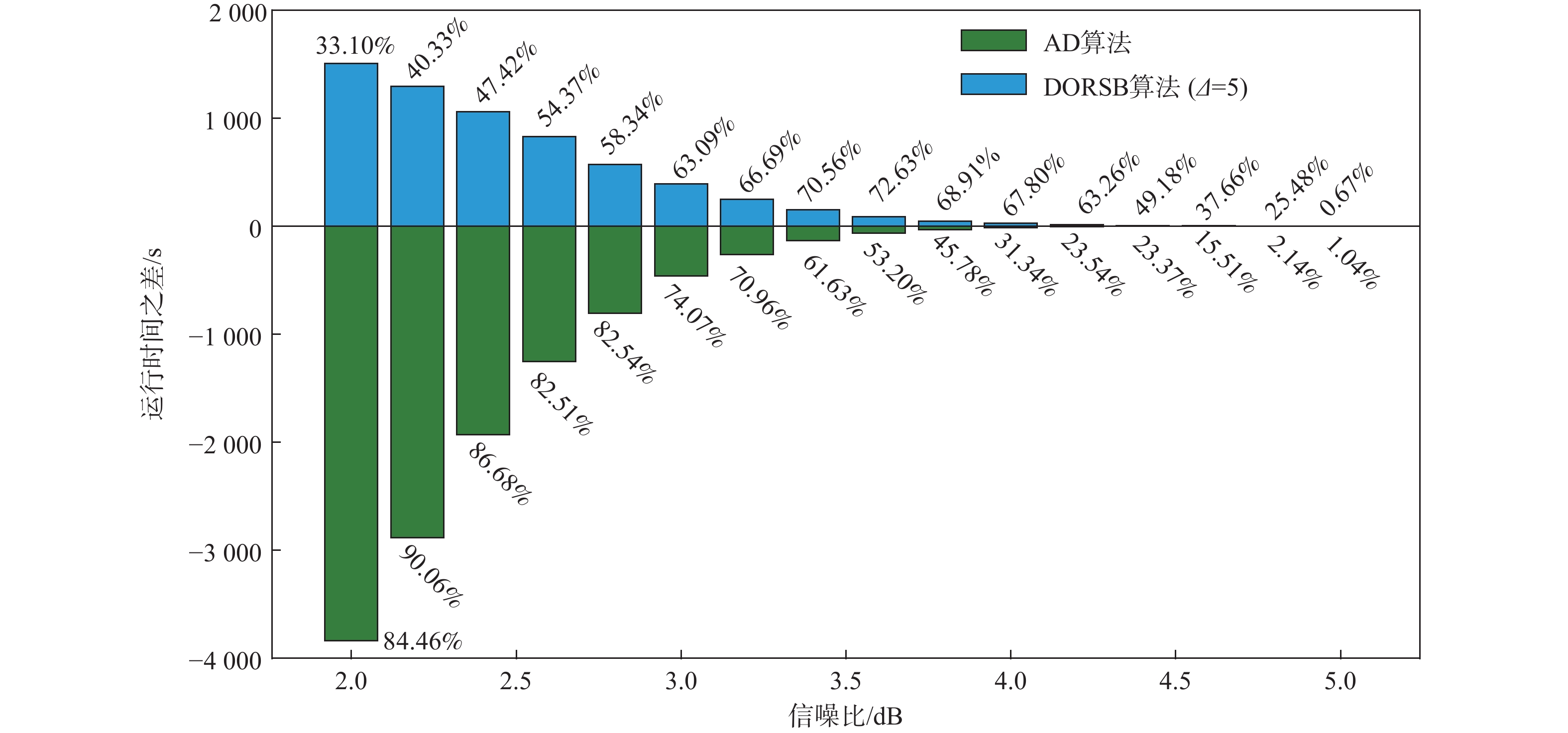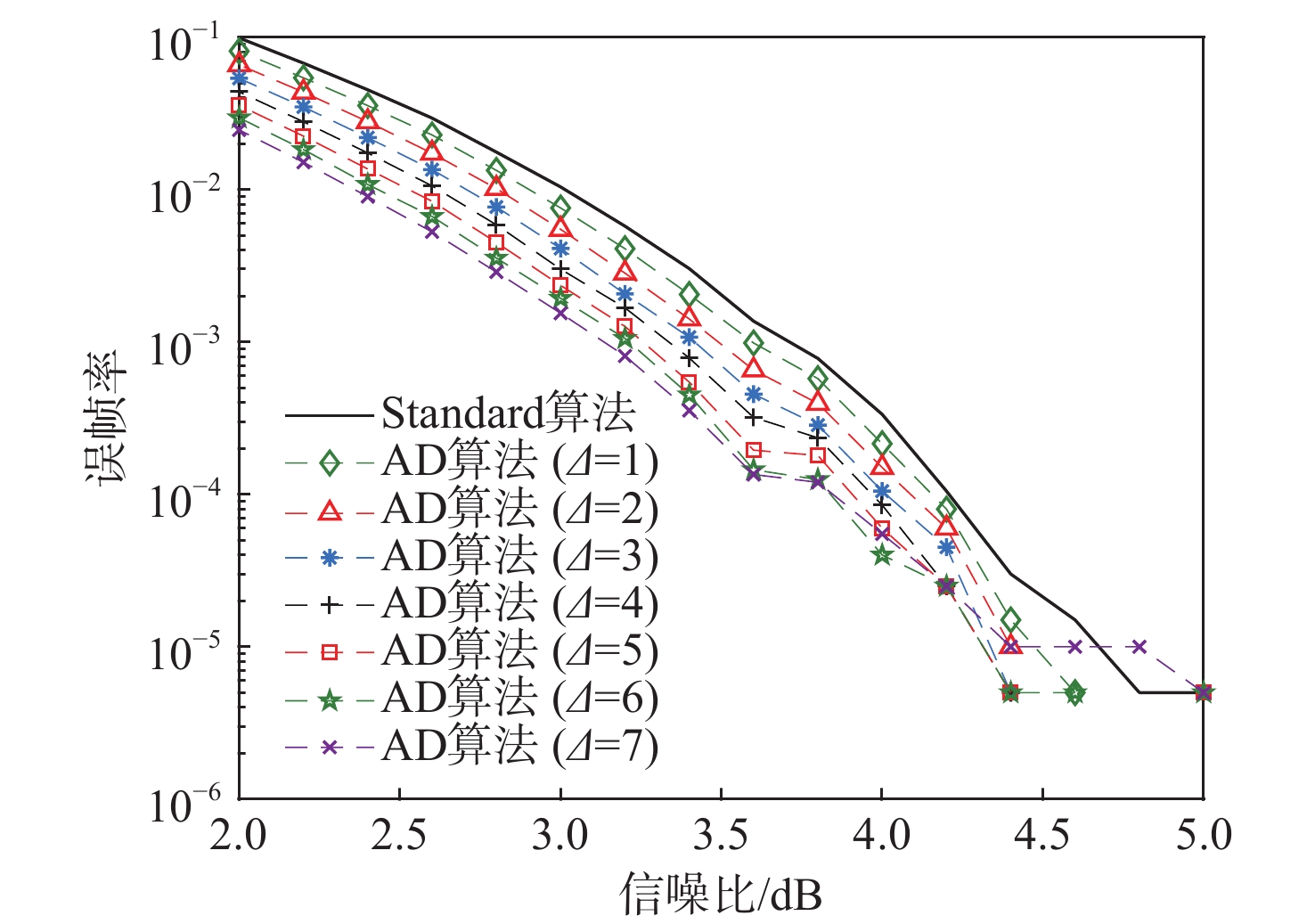 大约束长度卷积码具有抗干扰性强,难以破译等优点,被应用于卫星通信等领域。但低信噪比环境下,存在空间利用率低和译码复杂度高的缺点。针对此问题,提出一种基于动态寻优调节的卷积码堆栈-桶(DORSB)算法。所提算法采用新参数深度因子辅助路径存取,能够增大接近码树终点的路径优势,降低译码复杂度;并在堆栈溢出时,对桶的尺寸进行调节,对桶空间进行复用的同时降低误帧率,可有效提升空间利用率。仿真结果表明:在深度因子增量适当且误帧率为10−5的情况下,相比于标准堆栈-桶算法,所提算法误帧性能提高了约0.6 dB,并且时间复杂度最多能改善72.63%。