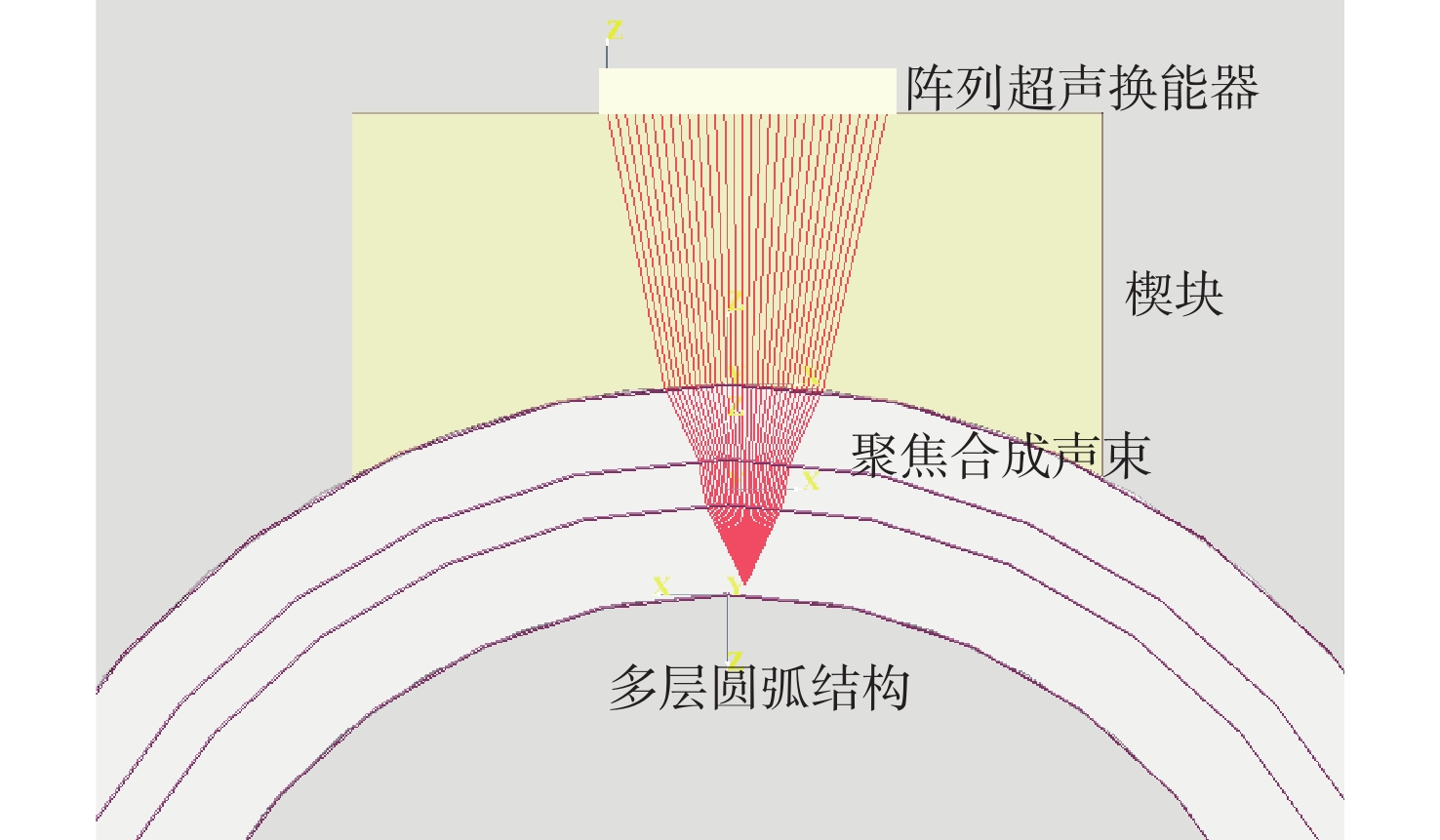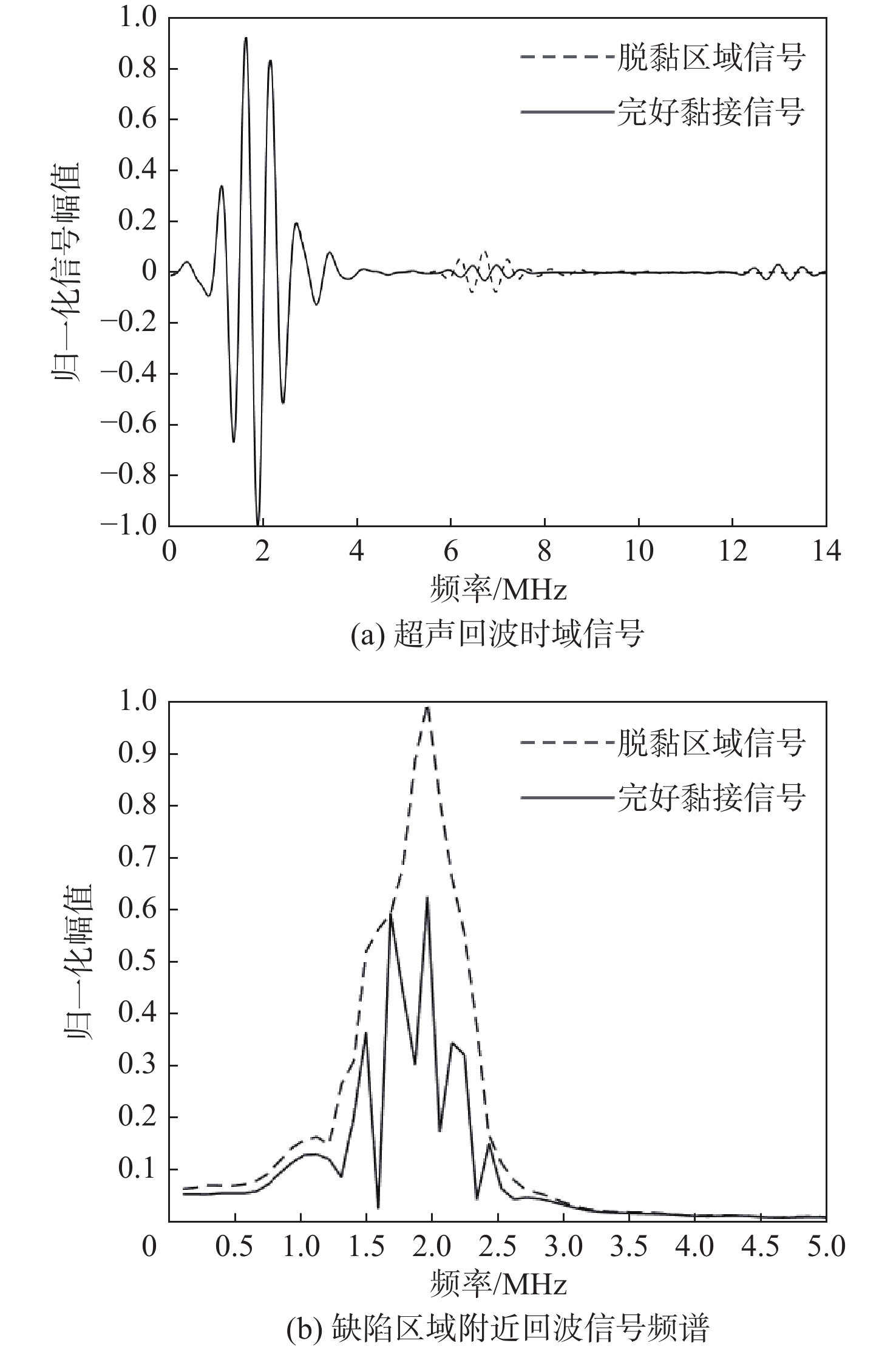 在金属与橡胶等非金属材料的多层黏接结构的超声检测中,介质间声阻抗差异和超声衰减显著,致使脱黏缺陷检测信噪比低,缺陷识别困难。为了提高多层黏接结构中脱黏缺陷的检出能力,提出了基于线性阵列超声换能器的超声检测评价方法。分析了声波在黏接界面的传播特性,得出声波在多介质层系的反射系数频谱关系;基于多层黏接结构的三维CAD检测模型,建立多层结构的阵列超声声束路径通用计算方法,依据多层介质的刚度矩阵传递模型,构建数值仿真分析模型,实现阵列超声聚焦方案和检测工艺的设计;分析了不同黏接状态下界面回波信号的幅度谱,提出采用幅度谱特征进行C扫描成像的方法。实验结果表明:所提阵列超声检测评价方法可有效提升多层黏接结构的检测效率,提高检测信噪比,降低脱黏缺陷C扫描成像表征的复杂度。