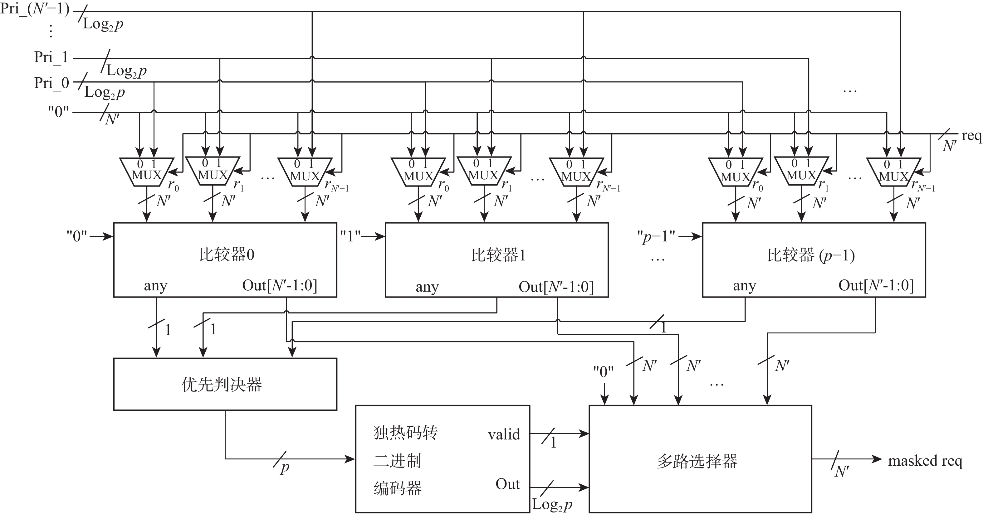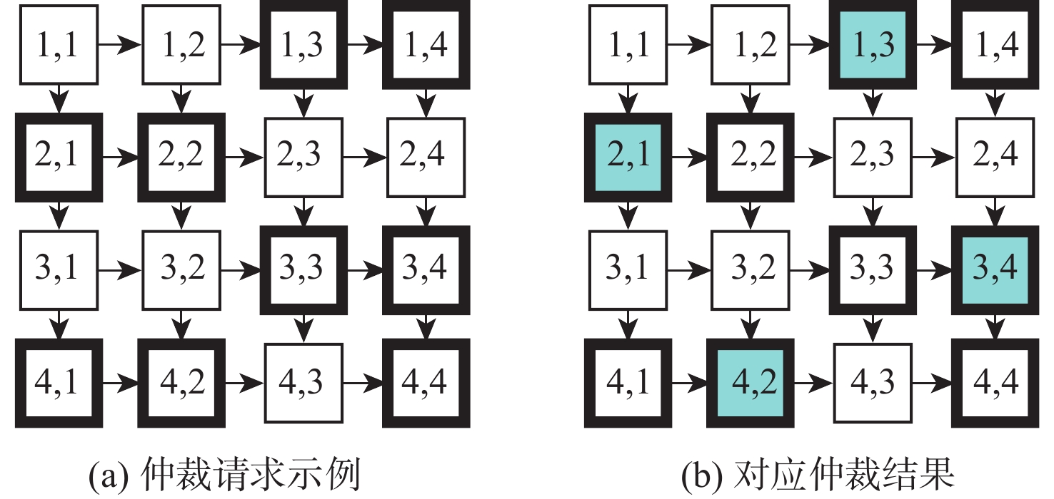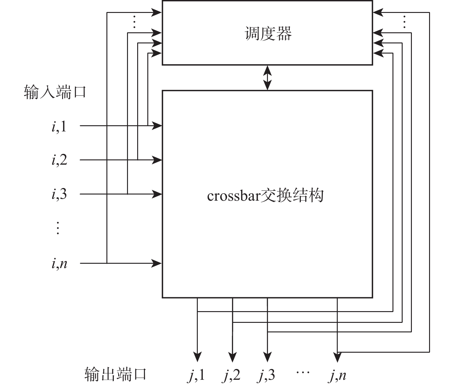 SpaceWire(SpW)路由是SpW网络的关键设备之一,采用纵横式交叉开关(crossbar switch)结构,由于SpW网络数据分组最大长度不固定,经典的滑动迭代轮询匹配(iSlip)调度算法并不适用。研究二维行波进位交换结构,提出一种多优先级分层调度的crossbar switch实现结构,为不同业务流量类型赋予不同优先级可以提高网络服务质量(QoS),采用基于仲裁反馈轮询(FBP)算法,在群组路由时具有良好输出公平性。通过向环型行波进位(CRCS)仲裁结构中插入寄存器分割组合逻辑组成流水结构降低组合延迟,提高最高系统频率,解决路由端口数量扩展的问题。使用可编程逻辑语言实现优先级数量和端口数量可配置的crossbar,CRCS结构具有资源占用少、仲裁速度快和易于扩展的特点。以4×4规模的crossbar switch为例,采用二维CRCS结构相比于线性扩展结构,仲裁逻辑单元数量节省67.3%,仲裁延迟降低约60%,在Xilinx V7系列现场可编程门阵列(FPGA)进行逻辑综合,行列各插入2级寄存器,即可满足最大规模下的SpW路由应用需求。