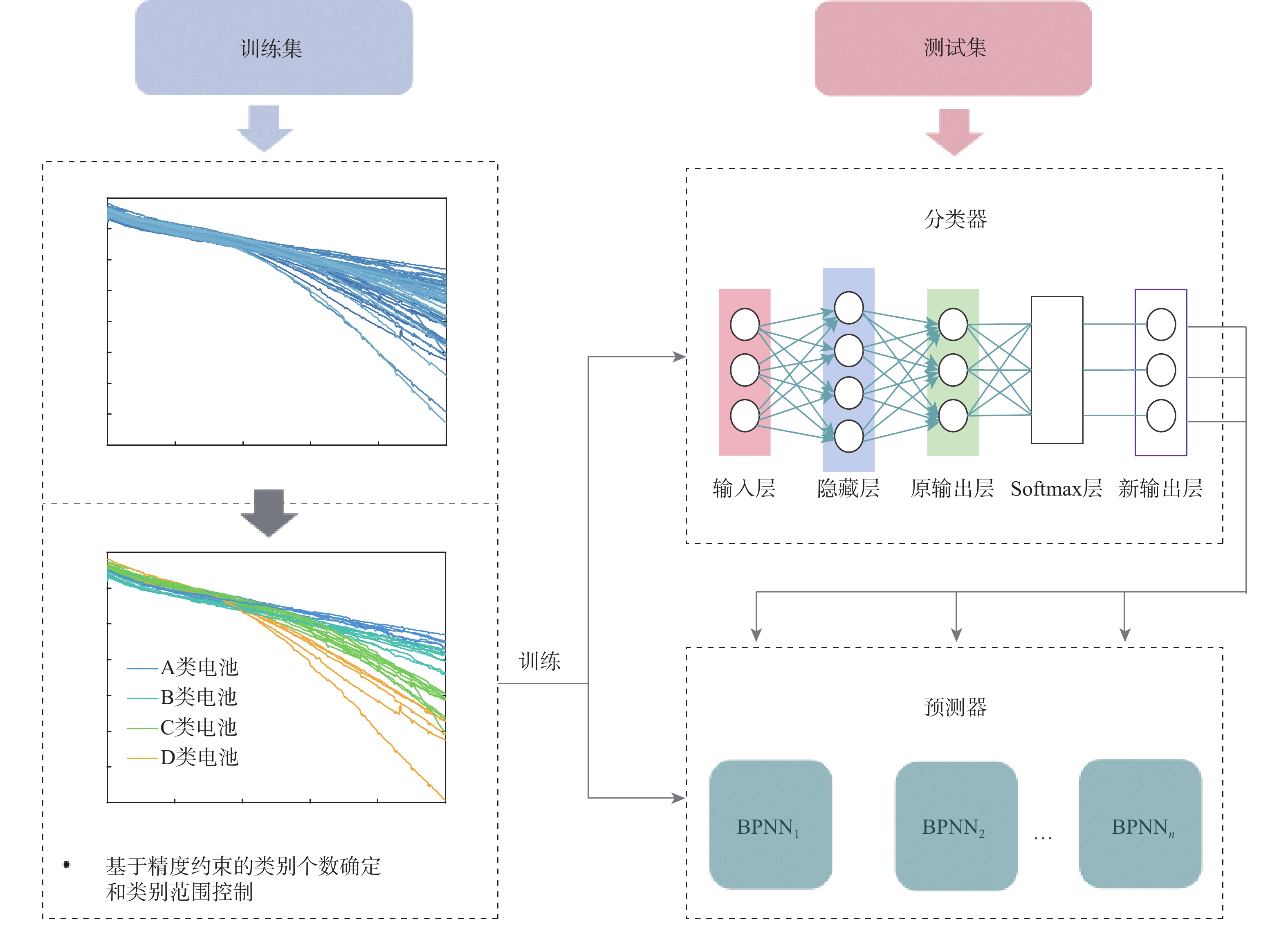对锂离子电池进行准确的健康状态(SOH)预测是电池应用中的一项关键技术。由于锂离子电池内部复杂的电化学反应体系,多样的失效机理及生产差异,锂离子电池的退化往往呈现出较大的分散性,为锂离子电池SOH的准确预测造成了较大的困难。为此,提出一种基于机器学习的锂离子电池SOH分类与预测方法,基于精度约束,利用双子群优化算法确定训练集数据合适的类别个数及类别范围;基于Softmax分类模型根据锂离子电池早期退化数据进行SOH分类,使得退化趋势较为接近的电池被分为一类;对每一类电池分别利用神经网络构建其SOH预测模型,从而减小锂离子电池数据的大分散性的影响,提升锂离子电池的SOH预测精度。所提方法相比传统方法预测误差降低了34%以上,验证了所提方法的有效性和优越性。