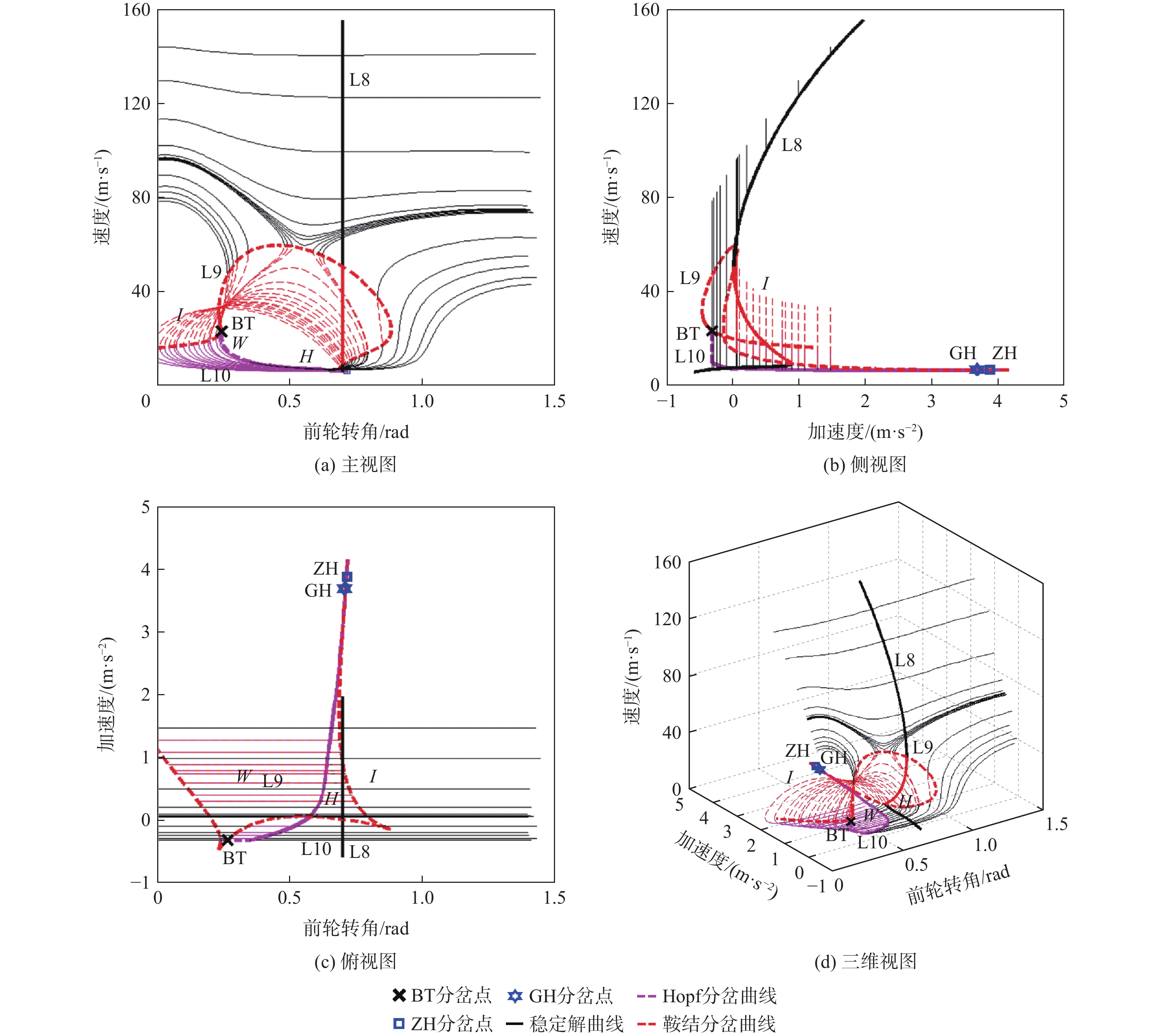 高速起降无人机地面滑跑过程中受到轮胎力、气动力、舵面力等多个非线性因素的影响,容易发生转弯失控,在地面打转甚至冲出跑道等严重事故。目前利用分岔理论分析飞机地面滑跑非线性转弯系统稳定性时,都是基于匀速滑跑的平衡态系统,无法分析加减速对非线性非自治飞机地面滑跑系统稳定性的影响。对此,提出利用达朗贝尔原理将非线性动态系统转化为等效非线性平衡态系统进行分岔特性研究。在MATLAB/Simulink中建立无人机非线性地面变速滑跑动力学模型,并基于达朗贝尔原理在系统模型中引入惯性力,将系统转化为等效平衡态系统,进而利用数值延拓法对系统全局稳定性及分岔特性进行求解,分析了无人机变速滑跑过程中加速度对无人机转弯方向稳定性的影响,并对系统出现的鞍结分岔现象、Hopf分岔现象进行分析。通过对3种典型工况下无人机的运动状态和受力进行分析,揭示了无人机地面变速滑跑转弯时发生方向失稳的本质与机理。同时,在加速度单参数分岔分析的基础上,采用开折方法,将前轮转角作为附加参数引入无人机地面滑跑动力学模型,进行双参数分岔分析,讨论了双参数组合对无人机地面滑跑方向稳定性的影响规律,并就双参数分岔过程中新出现的BT分岔、GH分岔和ZH分岔现象进行了讨论。