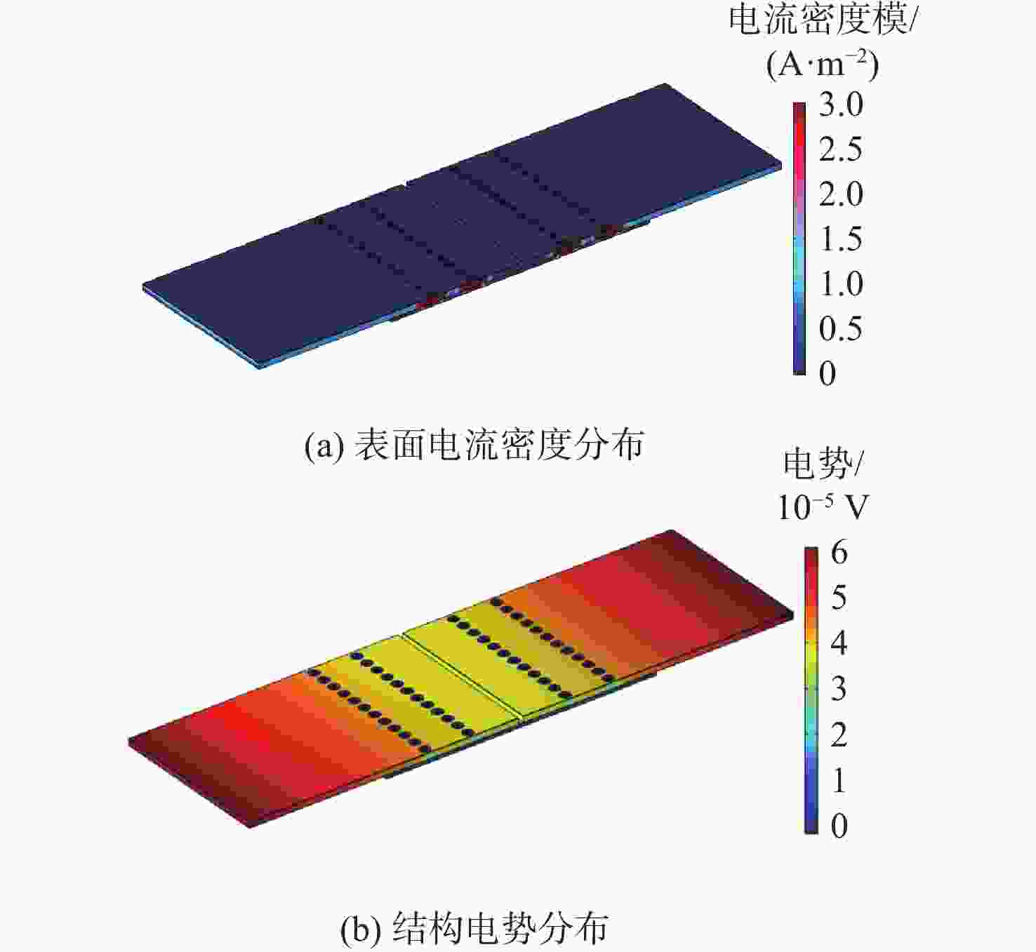 参数 阻值/Ω 参数 阻值/Ω Rcop 3.96×10−5 RAl_1 1.10×10−5 Rcop_by_1~Rcop_by_10 1.58×10−5 RAl_by_1~RAl_by_10 1.89×10−5 RCFRP 3.17×10−2 RAl_2 5.96×10−6 Rcop_by_2~ Rcop_by_9 3.96×10−5 RAl_by_2~ RAl_by_9 4.72×10−6 Rsteel 2.04×10−5 Rcop_by_11~ Rcop_by_18 1.25×10−5 表 5 金属连接件材质及对应电导率