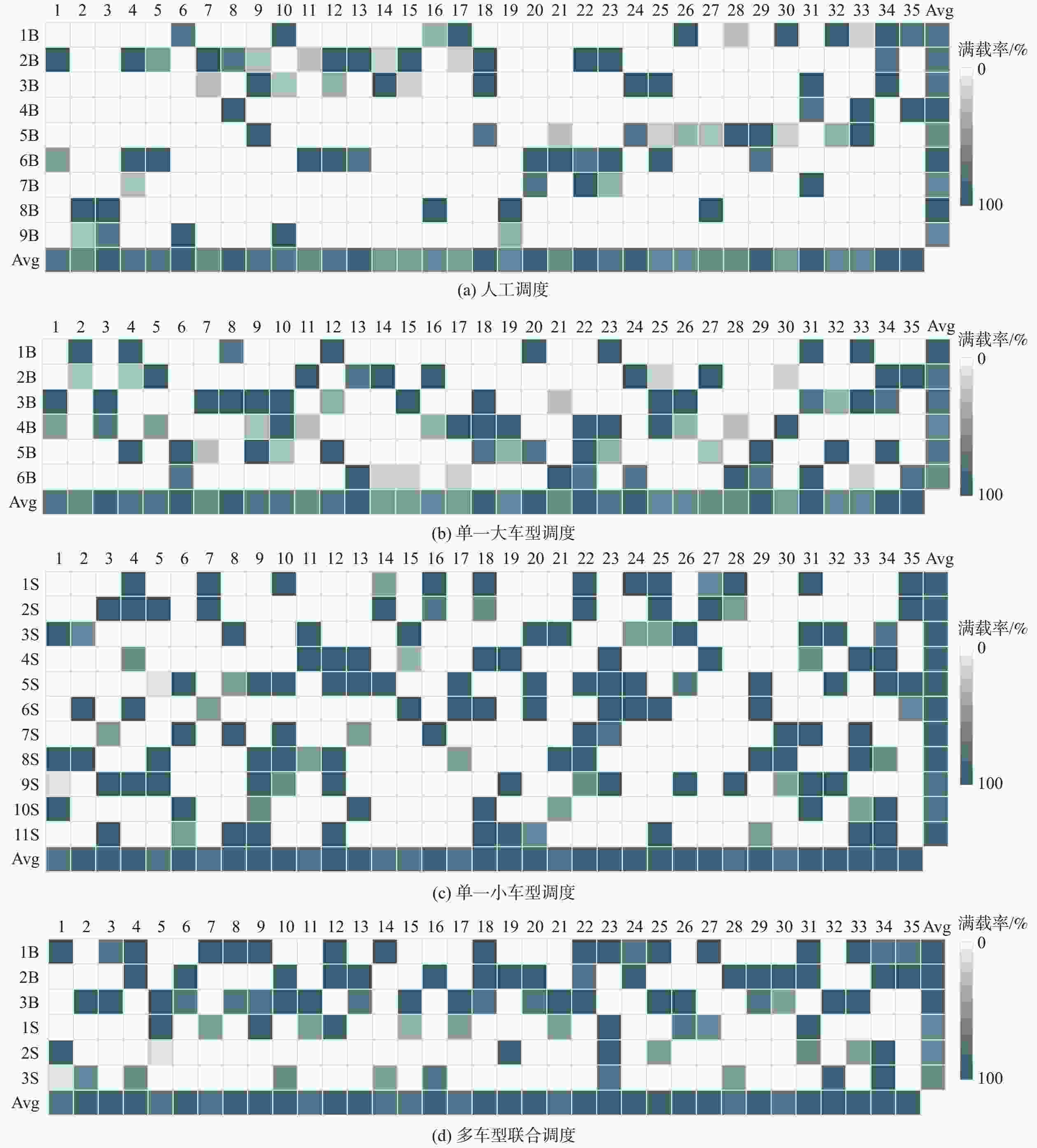 (人·单位容量−1)大车 小车 总体 人工调度 82.05 7.17 7.17 单一大车型调度 82.05 10.83 10.83 单一小车型调度 90.78 11.64 11.64 多车型联合调度 90.78 18.33 10.33 14.22 -