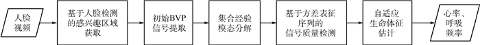 在面部视频中提取生命体征相关的生理信号时易受环境光和受试者头部运动的影响,为了降低外界干扰并提高生命体征检测的准确度,提出了一种联合集合经验模态分解(EEMD)算法与信号质量检测的面部视频分析方法,用于精确检测人体的心率与呼吸频率等生命体征。通过公开数据集进行实验验证,实验结果表明,所提方法相较于目前已有的常用信号处理方法能够得到更精确的心率与呼吸频率的估计值,所得估计值与标准值的相关系数分别高于0.9和0.8。同时,所提方法将为实时活体人脸识别提供一种思路,也有助于丰富监控视频智能分析的应用研究。