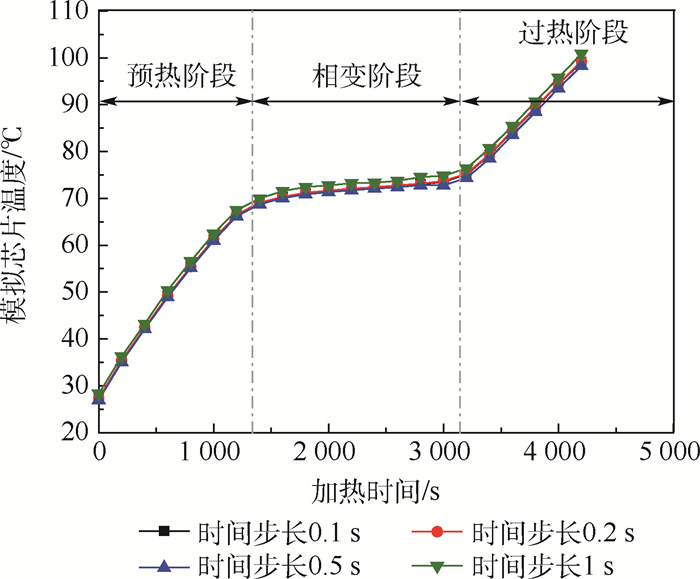 为研究泡沫铜/低熔点合金(LMPA)复合相变材料在间歇放热工作环境下恢复至初始状态的能力及不同孔隙率泡沫铜的添加对其凝固放热过程的影响,通过数值模拟对比分析了47合金、正二十三烷与泡沫铜复合前后的凝固放热过程,并调节泡沫铜/47合金复合材料孔隙率计算模拟芯片温度在凝固放热过程中温度随时间变化曲线。结果表明:泡沫铜的添加对2类材料凝固过程均有促进作用,模拟芯片恢复至目标温度所需时间分别被缩短6.6%和47.7%。因体积潜热值的差距,泡沫铜/47合金凝固时需放出更多热量,恢复至目标温度的时间较长,是正二十三烷复合相变材料的1.52倍。随着孔隙率的增大,复合相变材料恢复至室温状态所用时长变化不大,考虑到孔隙率对相变热控过程中的影响,实际使用时应综合考虑。