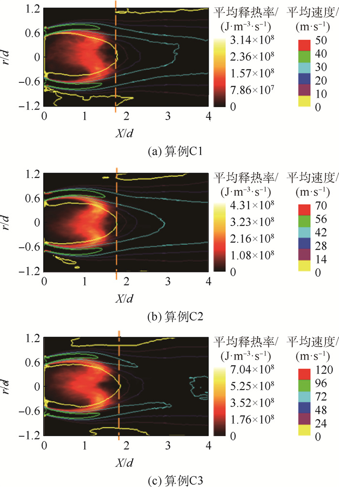 针对锥形钝体稳定的甲烷-空气预混湍流火焰复杂的熄火过程,采用大涡模拟(LES)与输运方程概率密度函数(TPDF)湍流燃烧模型相结合的模拟方法,研究远离熄火、近熄火及熄火点的火焰和释热率(HRR)数值变化情况,定量分析熄火判据。结果表明:冷态速度模拟结果和实验的相对均方根误差在10%以内,热态误差在20%以内;释热率是否出现在OH和CH2O重叠的区域,是判断熄火的一个重要参数;远离熄火时,释热率高的区域主要沿内侧剪切层出现;近熄火工况下,释热率在流向轴上闭合,回流区下游也出现较大的释热率;熄火点工况下,较大释热率的区域在回流区下游和上游均有出现;模拟预测的熄火情况和实验PLIF结果一致;平均释热率可作为判断熄火的定量依据,即当钝体后方0.2d处内侧剪切层平均释热率与回流区平均释热率的比值小于4时,发生熄火。