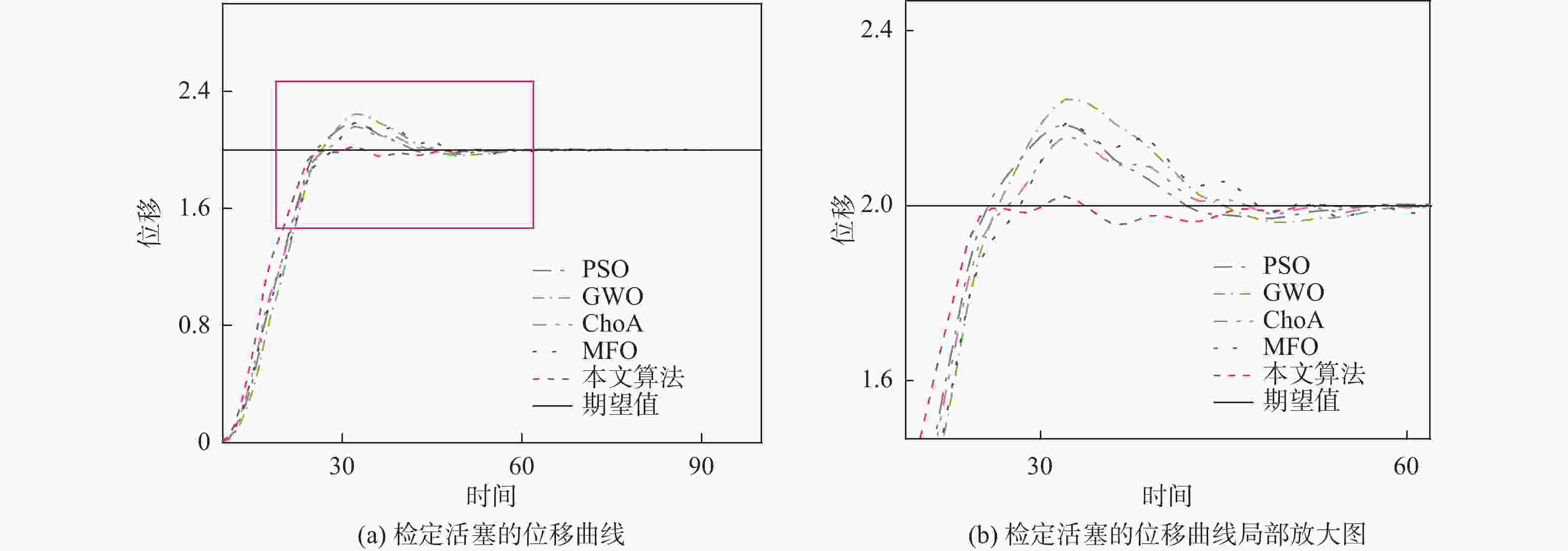 算法 Ts Th M L 适应度值 PSO 1.9841 0.8452 69.1476 84.1523 14321.1522 GWO 2.1425 0.7854 78.1463 63.1789 9542.1896 本文算法 1.2454 0.4251 65.1789 54.3254 7854.2547 ChoA 1.5748 0.8745 78.1245 66.1385 9854.1245 MFO 1.8254 0.5623 49.1278 78.3569 12412.1247 表 5 不同算法优化PID控制器得出的整定参数