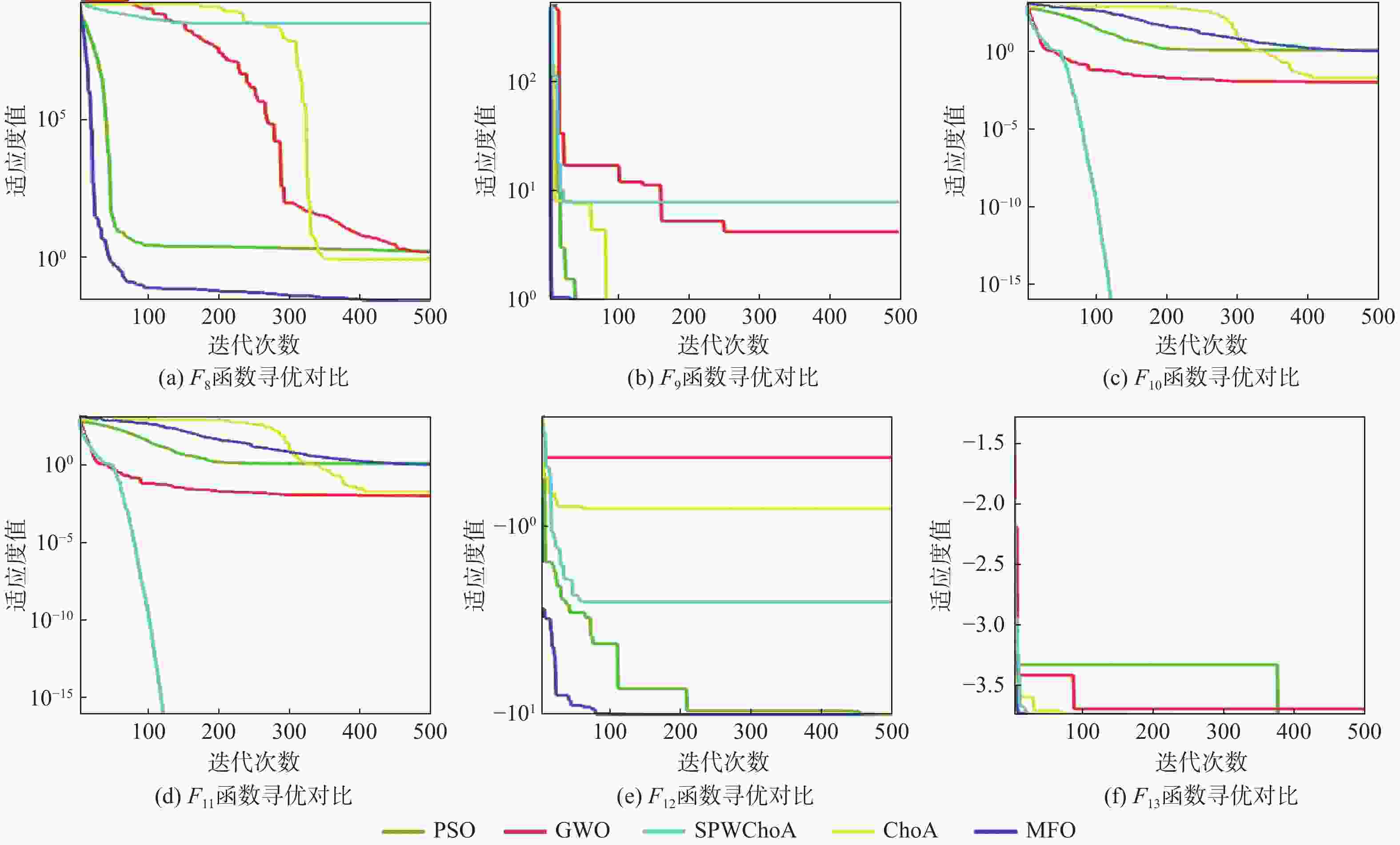 函数 算法 最优值 平均值 标准差 F1 PSO 1.2781 ×1021.5311 ×1034.3431 ×103GWO 2.0584 ×10−318.8881 ×1026.9157 ×103本文算法 0 8.0417 ×1026.3995 ×103ChoA 3.1555 ×10−75.2731 ×1044.8132 ×104MFO 1.6961 ×1001.5902 ×1042.7030 ×104F2 PSO 1.2720 ×1021.2561 ×1081.9841 ×1010GWO 3.2013 ×10−183.1168 ×10176.9157 ×1014本文算法 0 1.8601 ×1034.2861 ×108ChoA 3.0828 ×10−63.5033 ×10114.8132 ×1014MFO 2.1091 ×1013.0726 ×1042.6503 ×1012F4 PSO 1.1627 ×10−11.3258 ×1017.7210 ×100GWO 3.2850 ×10−59.5806 ×1002.5107 ×101本文算法 7.2961 ×10−2142.0326 ×1009.4542 ×100ChoA 3.5794 ×10−06.4154 ×1013.9189 ×101MFO 7.2761 ×10−17.7294 ×1016.2757 ×101F6 PSO 4.0547 ×1011.1066 ×1036.8445 ×103GWO 2.4012 ×1005.3471 ×1026.0318 ×103本文算法 2.500×10−1 6.2878 ×1025.3597 ×103ChoA 4.0429 ×1004.9726 ×1044.7985 ×104MFO 1.4837 ×1032.5441 ×1042.5183 ×104F9 PSO 2.5862 ×1006.6511 ×1001.6784 ×101GWO 1.4830 ×10−31.8595 ×1002.1531 ×101本文算法 1.7312 ×10−41.0989 ×1001.3083 ×101ChoA 3.0276 ×10−46.7608 ×1016.4684 ×101MFO 2.8249 ×10−12.5109 ×1015.4009 ×101F10 PSO 1.0908 ×1002.5820 ×1018.9543 ×101GWO 0 8.1280 ×1016.8696 ×101本文算法 0 9.9993 ×1016.7406 ×101ChoA 4.8961 ×10−94.6463 ×1024.5693 ×102MFO 9.6263 ×1011.4153 ×1022.3021 ×102F11 PSO 1.1879 ×1005.2039 ×1011.2443 ×102GWO 9.8189 ×10−39.1945 ×1006.8756 ×101本文算法 0 4.6855 ×1014.5370 ×101ChoA 1.9166 ×10−23.6548 ×1023.4025 ×102MFO 1.0202 ×1001.7967 ×1022.9490 ×102F12 PSO 1.4136 ×1011.3418 ×1061.9234 ×107GWO 1.3312 ×10−11.1371 ×1049.9317 ×107本文算法 6.5778 ×10−37.5367 ×1057.6992 ×106ChoA 8.7621 ×10−14.3885 ×1084.2037 ×107MFO 1.1178 ×1012.6872 ×1079.2986 ×107F18 PSO 3.0010 ×1004.5238 ×1001.4169 ×101GWO 3.0101 ×1001.2183 ×1001.2183 ×101本文算法 3.0000 ×1003.116×100 3.1160 ×100ChoA 3.1003 ×1004.3993 ×1004.3993 ×100MFO 3.0503 ×1002.2443 ×1011.7656 ×101F19 PSO − 3.8628 ×100− 3.8579 ×10−02.3883 ×10−2GWO − 3.8527 ×100− 3.6856 ×1006.6644 ×101本文算法 − 3.9857 ×100− 3.9856 ×1002.6140 ×10−3ChoA − 3.8542 ×100− 3.7941 ×1001.6723 ×10−1MFO − 3.8628 ×100− 3.8348 ×1002.0741 ×10−1F20 PSO − 3.3220 ×100− 3.2669 ×1002.3233 ×10−1GWO − 3.2006 ×100− 3.1586 ×1002.0946 ×10−1本文算法 − 3.8518 ×100− 3.8516 ×1002.0518 ×10−4ChoA − 3.0137 ×100− 2.7966 ×1005.0789 ×10−1MFO − 3.2031 ×100− 3.1805 ×1001.5436 ×10−1F21 PSO − 2.6305 ×100− 2.5943 ×10−02.1477 ×10−1GWO − 4.2547 ×10−1− 4.2544 ×10−13.2649 ×100本文算法 − 1.0153 ×101− 6.6549 ×1007.3892 ×10−4ChoA − 4.9728 ×10−1− 4.9222 ×10−12.3510 ×10−2MFO − 5.0552 ×100− 4.8147 ×1009.3764 ×10−1F22 PSO − 6.3216 ×10−1− 6.3212 ×10−15.5567 ×10−16GWO − 3.7308 ×10−1− 3.7308 ×10−13.6373 ×10−1本文算法 − 5.0877 ×100− 4.9420 ×10−12.672×10−16 ChoA − 4.9733 ×100− 2.1872 ×10−11.9431 ×100MFO − 5.0877 ×100− 4.8186 ×10−19.6067 ×10−1表 3 Wilcoxon 秩和检验结果
