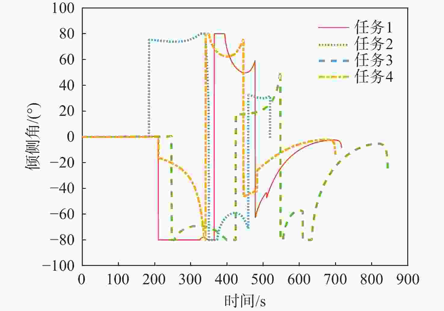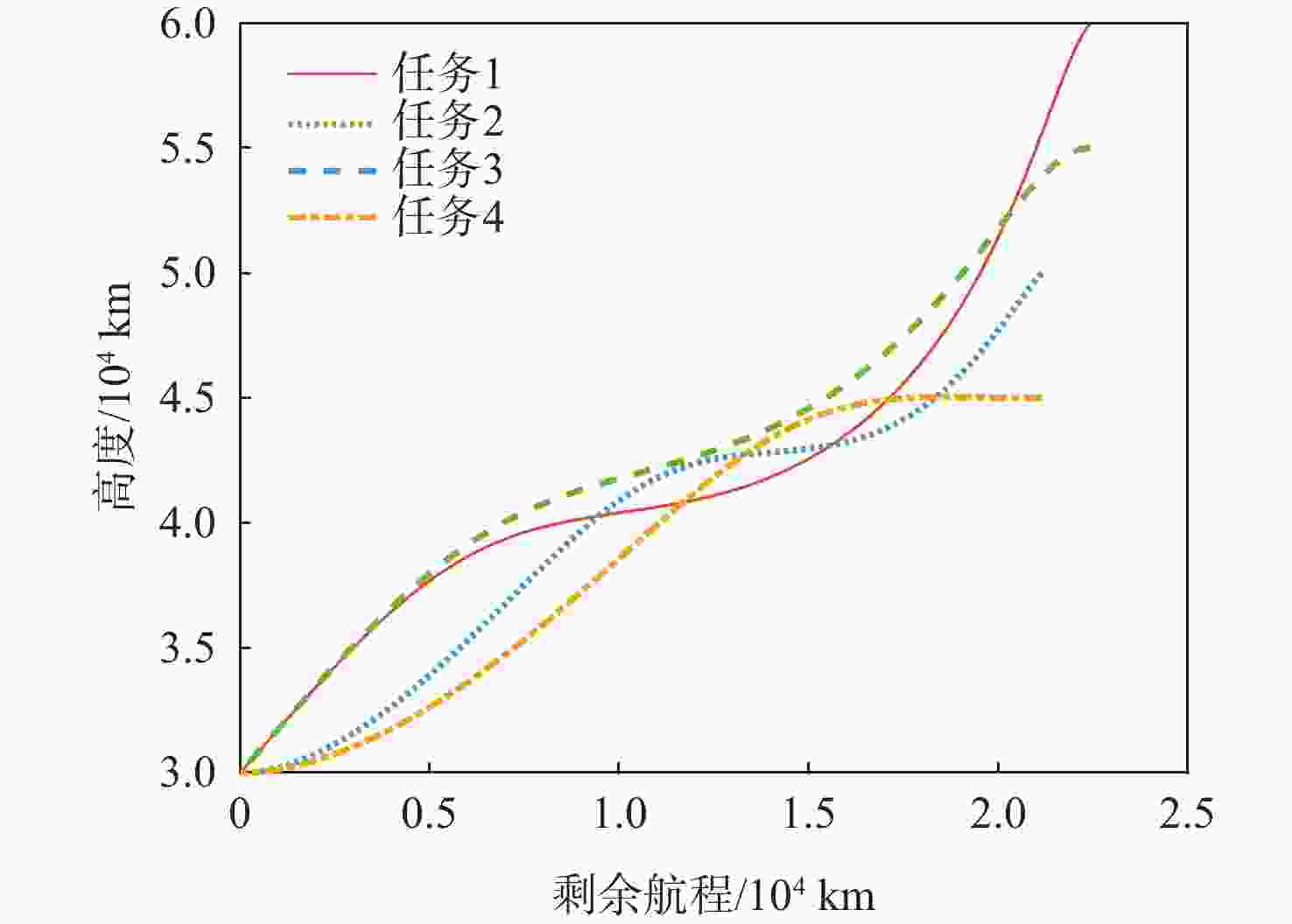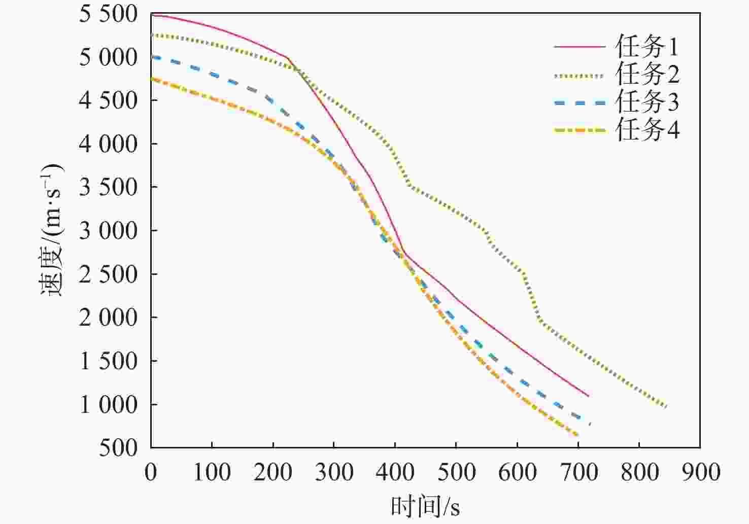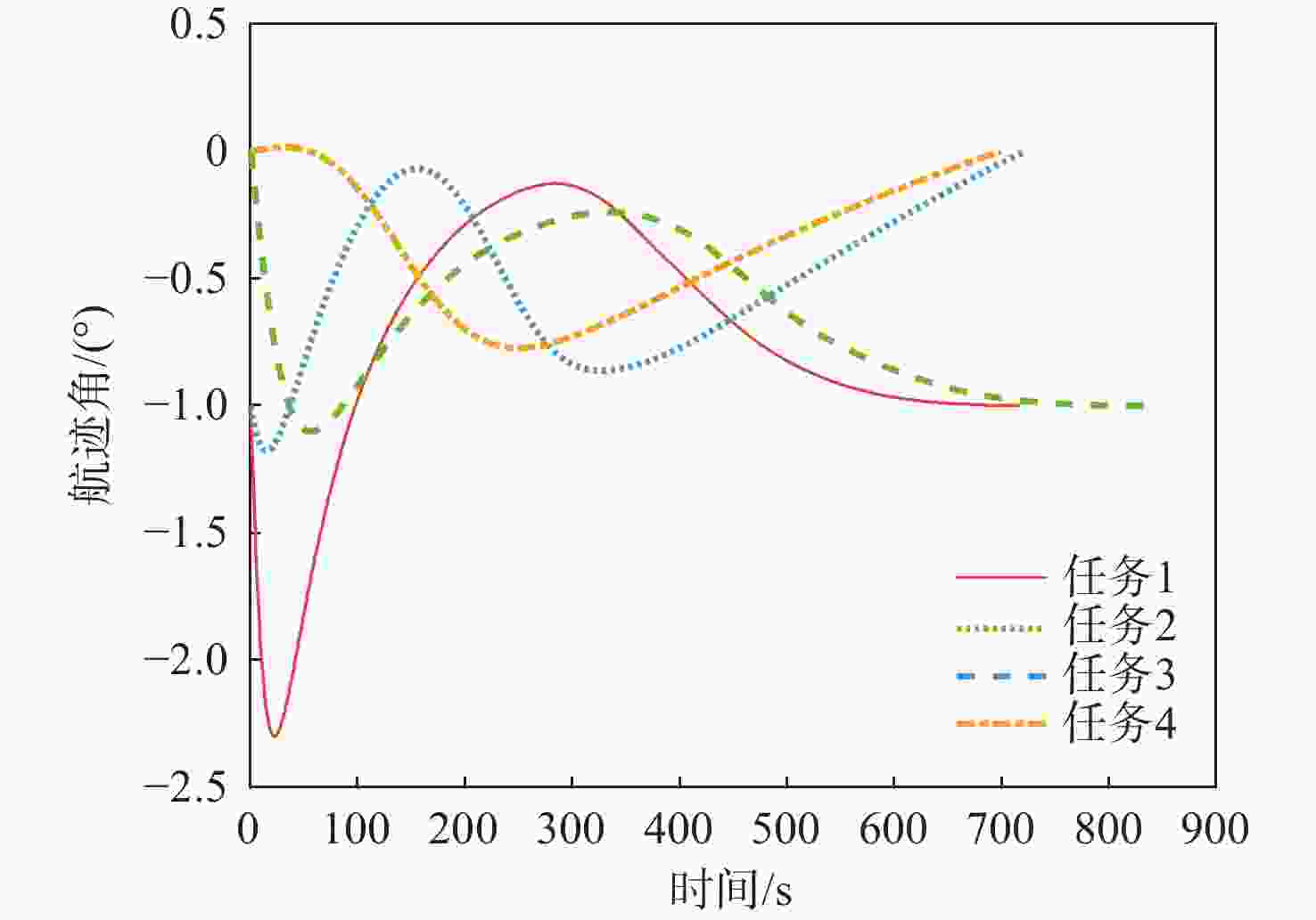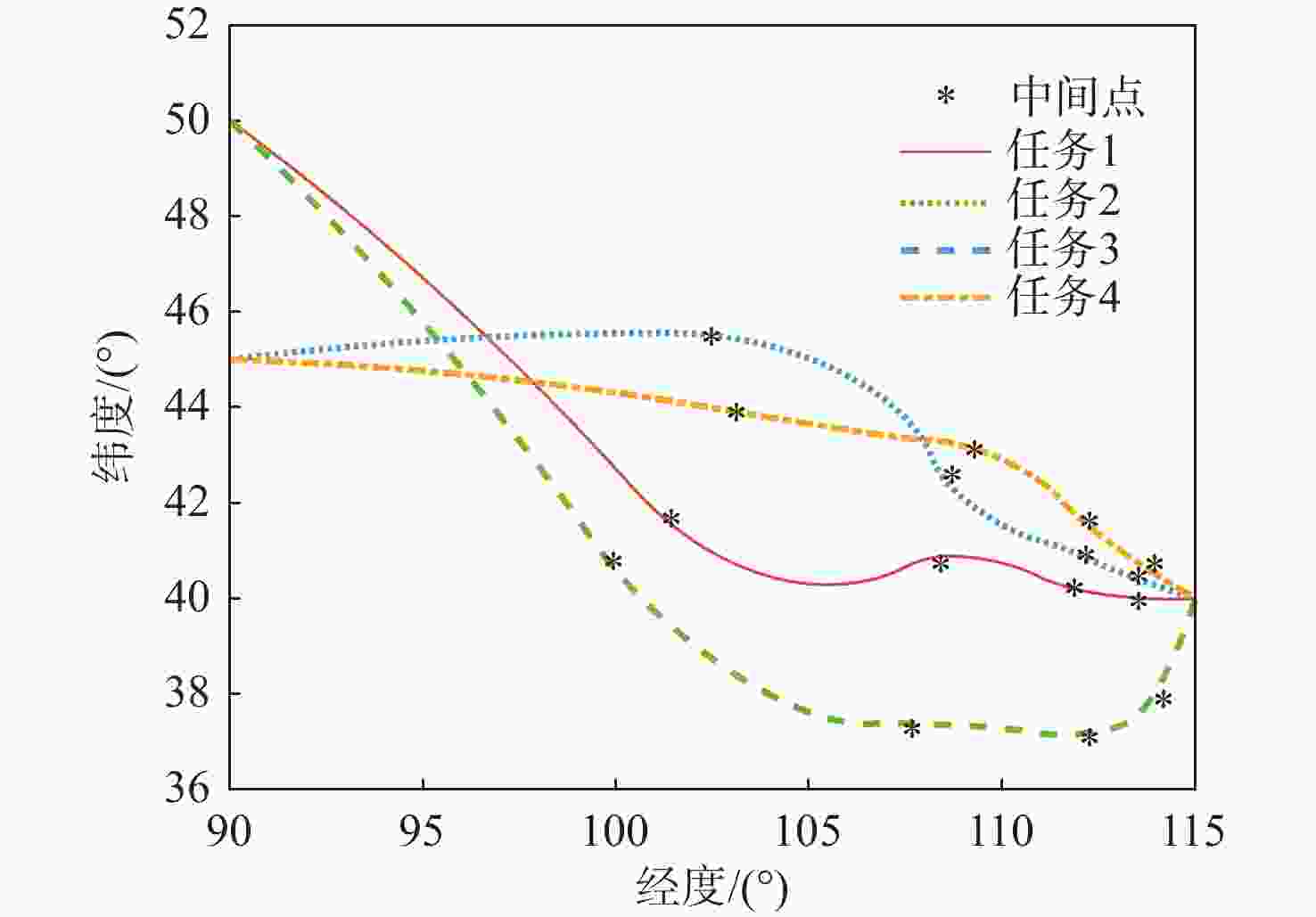 任务 初始位置/(°) 高度/km 速度/(m·s−1) 路径角/(°) 1 (E 90, N 50) 60|30 5500|1100 −1|−1 2 (E 90, N 50) 55|30 5250|950 0|−1 3 (E 90, N 45) 50|30 5000|800 −1|0 4 (E 90, N 45) 45|30 4750|650 0|0 表 2 仿真结果