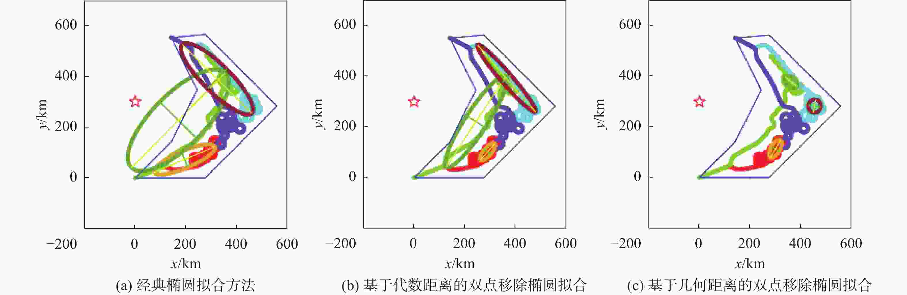 中心点/km长轴长/km 短轴长/km 偏转角/rad 1 (344.0,424.5) (318.1,432.9) 14.6 13.9 0.46 (308.8,407.2) (292.1,441.3) (327.4,458.5) 2 (390.5,323.2) (348.9,315.1) 30.2 18.7 0.79 (340.8,273.4) (307.3,306.9) (357.0,356.7) 3 (460.6,293.5) (437.4,260.2) 28.3 18.2 1.57 (460.6,226.9) (414.2,226.9) (414.2,293.5) 4 (369.8,238.0) (370.3,201.6) 23.1 18.1 2.27 (406.1,195.2) (370.8,165.2) (334.5,208.0) 5 (334.7,118.0) (308.2,107.1) 16.2 14.6 1.12 (316.4,79.7) (281.7,96.3) (300.1,134.6) -