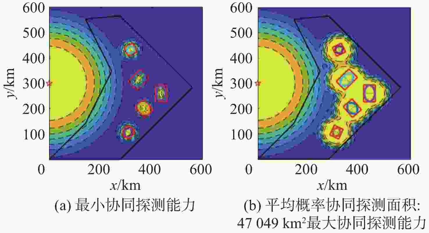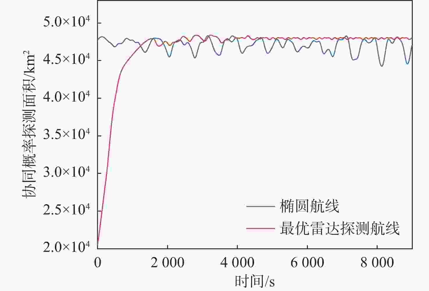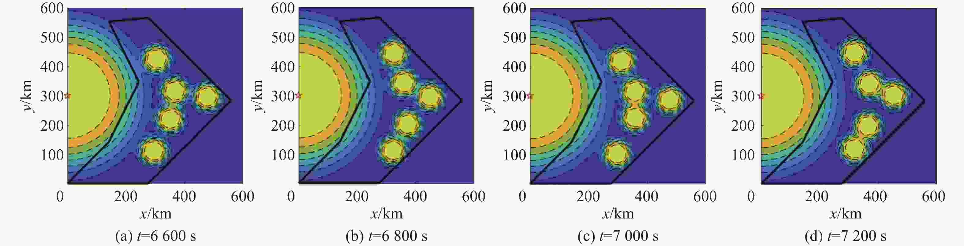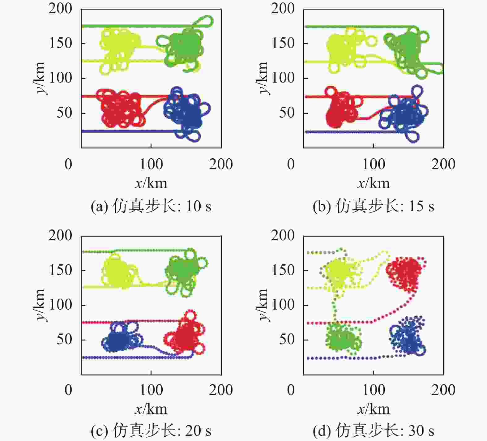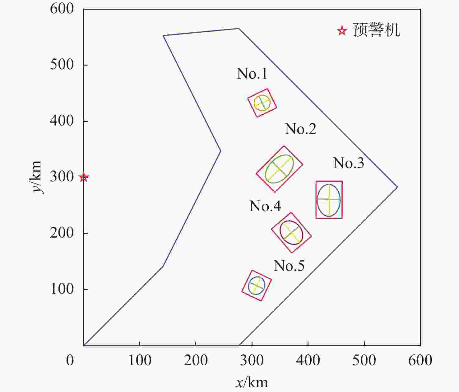 数量 初始位置/km 初始角度/rad 2 [0,0;141.4,553] [0;0] 4 [0,0;0,0;141.4,553;141.4,553] [0;0;0;0] 5 [0,0;141.4,553;141.4,553;244.3,347.2;244.3,347.2] [0;0;0;0;0] 6 [0,0;0,0;141.4,553;141.4,553;244.3,347.2;244.3,347.2] [0;0;0;0;0;0] 表 5 巡逻空域及椭圆航线详细信息