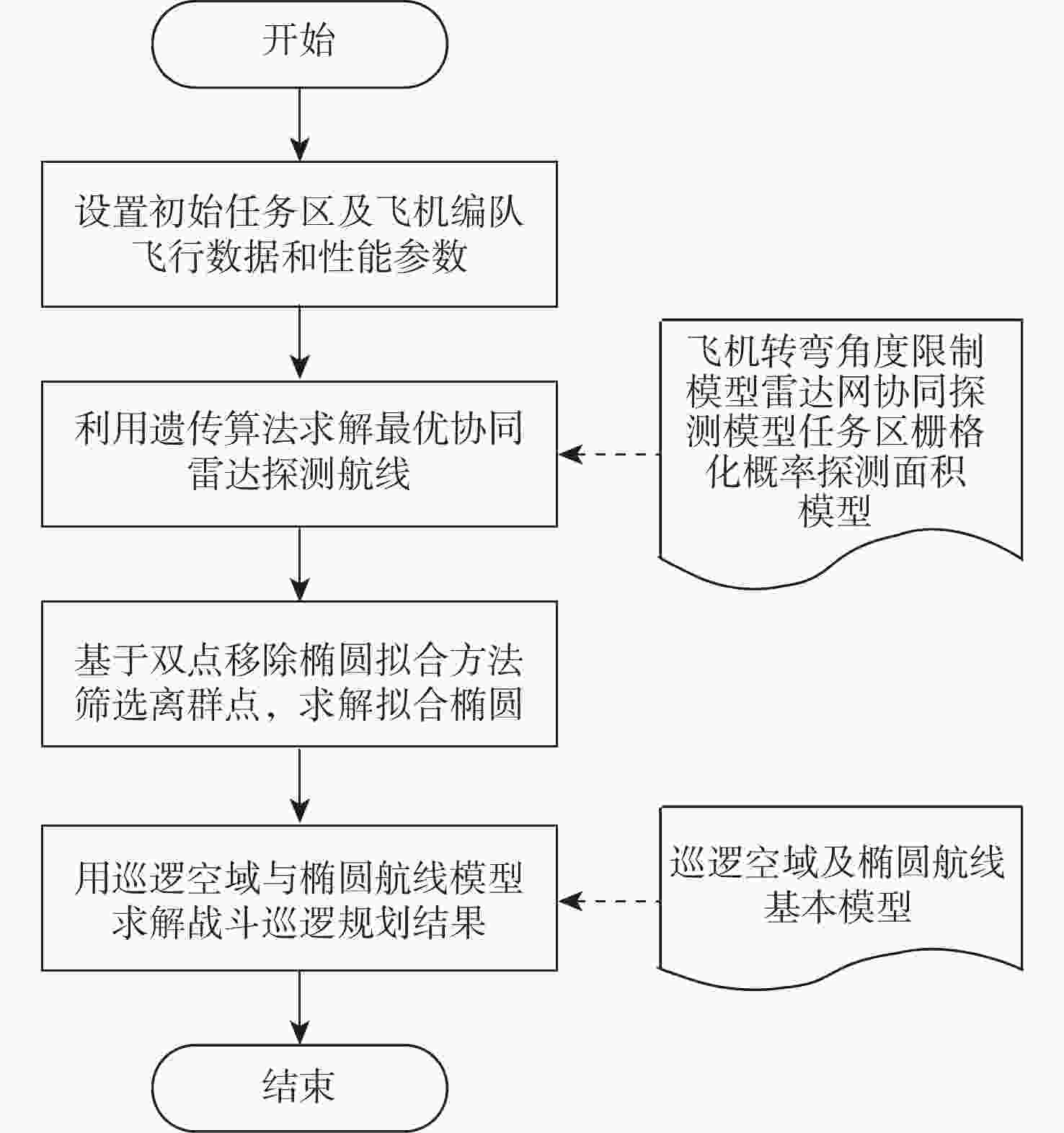 针对远海弱情报支援背景下的空中编队战斗巡逻规划问题,提出了一种新的基于最优探测航线椭圆拟合的巡逻空域规划方法。以协同概率探测面积作为遗传算法的适应度函数,求解最优飞机协同探测航线,根据初始航路点列的统计学特征,提出了基于几何距离的双点移除椭圆拟合方法,求解航空兵实际可用的椭圆航线及对应巡逻空域。仿真结果表明,编队按照规划的矩形巡逻空域和椭圆航线进行战斗巡逻,可保持对总任务区域82.16%的协同探测,与最优雷达探测航线的平均实时探测范围相比仅下降1.93%,且探测盲区时间空窗小。规划结果能显著降低飞行员的认知载荷,具有较好的实用价值和现实意义。