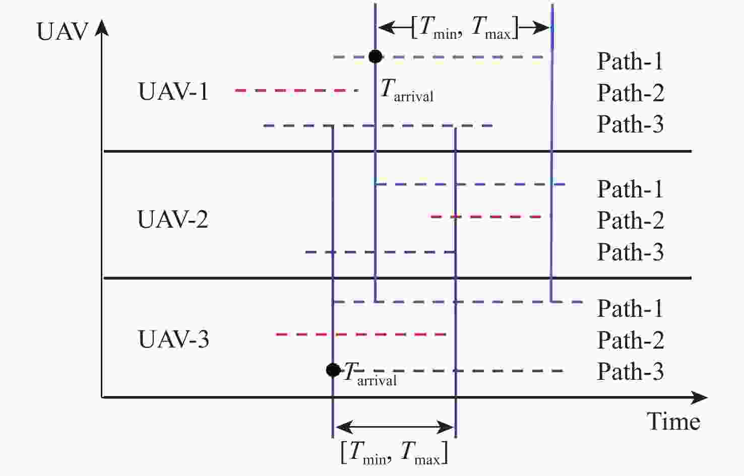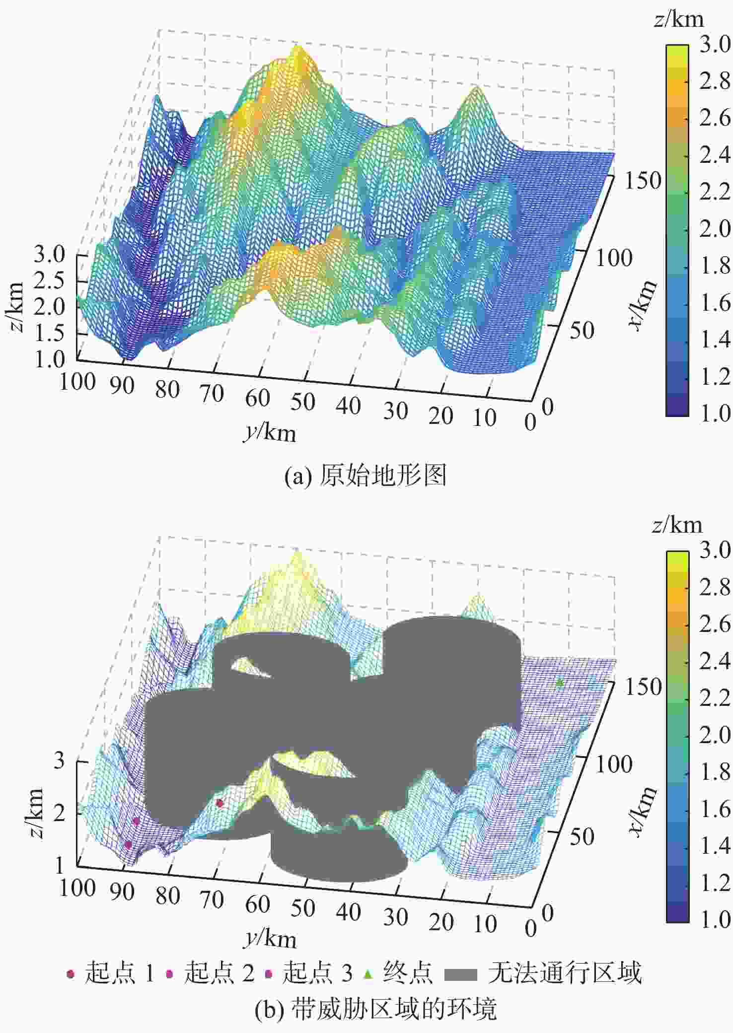 算法 UAV 航迹代价 航迹长度/km 到达时间/s 协同到达时间/s 协同代价 SSA UAV-1 115.78 215.32 [215.32,430.64] [215.32,297.18] 487.98 UAV-2 74.82 148.59 [148.59,297.18] UAV-3 82.07 160.35 [160.35,320.71] LASSA UAV-1 83.12 163.57 [163.57,327.14] [163.57,300.34] 411.03 UAV-2 75.79 150.17 [150.17,300.34] UAV-3 88.54 157.12 [157.12,314.24] GPSSA UAV-1 82.19 163.78 [163.78,327.56] [163.78,284.04] 399.90 UAV-2 82.63 162.86 [162.86,325.73] UAV-3 71.29 142.02 [142.02,284.04] -