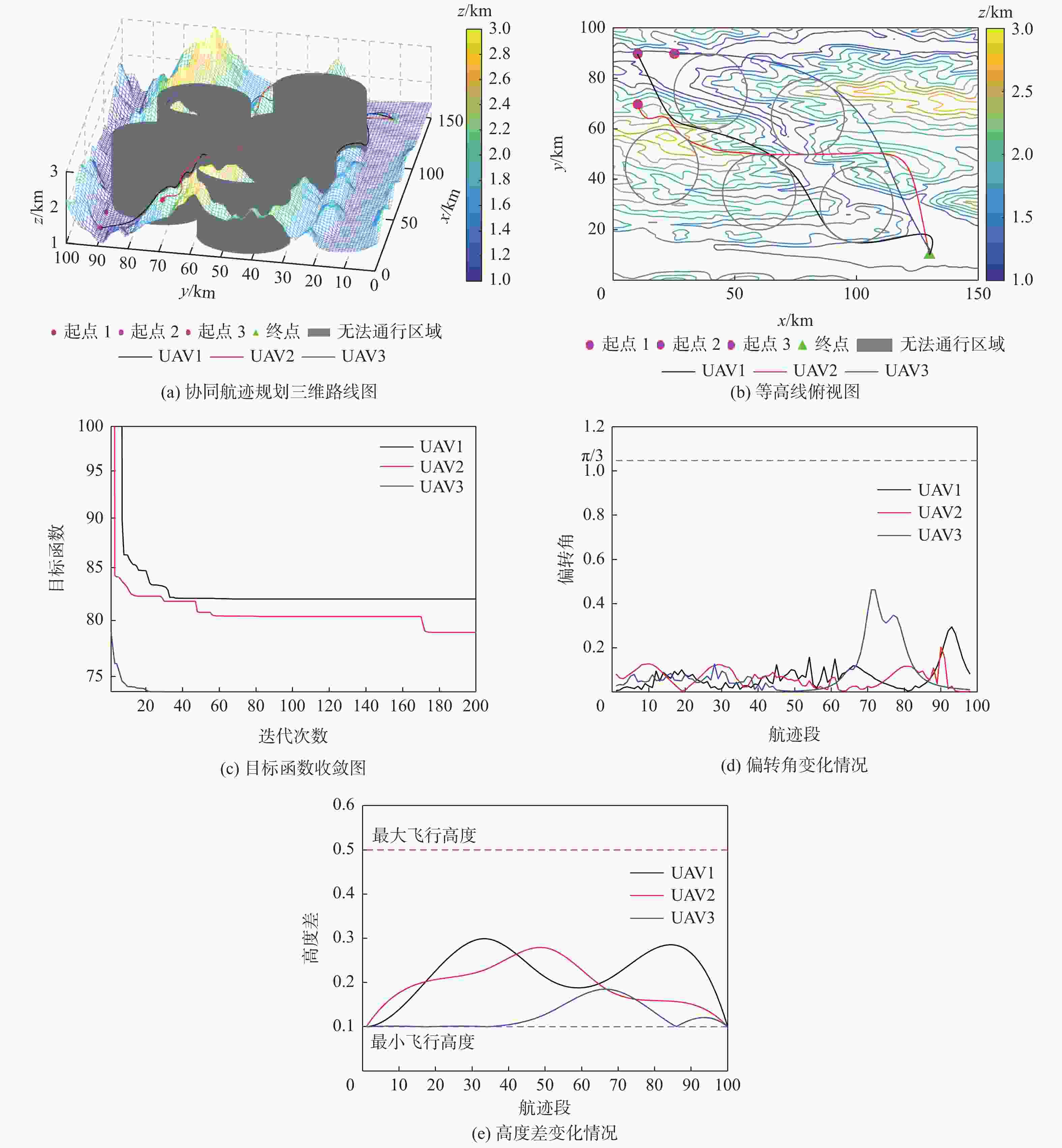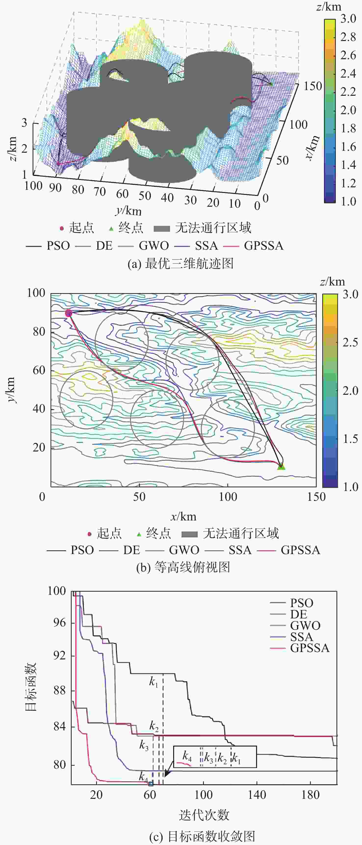 算法 算法平均耗时/s 最优值 最差值 平均值 标准差 PSO 35.635 4 80.824 0 105.188 7 88.608 0 9.129 1 DE 37.275 9 80.620 3 104.277 9 87.412 7 8.164 2 GWO 38.883 7 80.812 4 105.188 7 86.425 2 7.908 0 SSA 39.302 1 79.625 2 107.175 7 92.532 5 9.319 7 GPSSA 40.165 2 76.098 8 89.349 8 82.408 4 3.687 2 表 3 单UAV航迹规划层结果