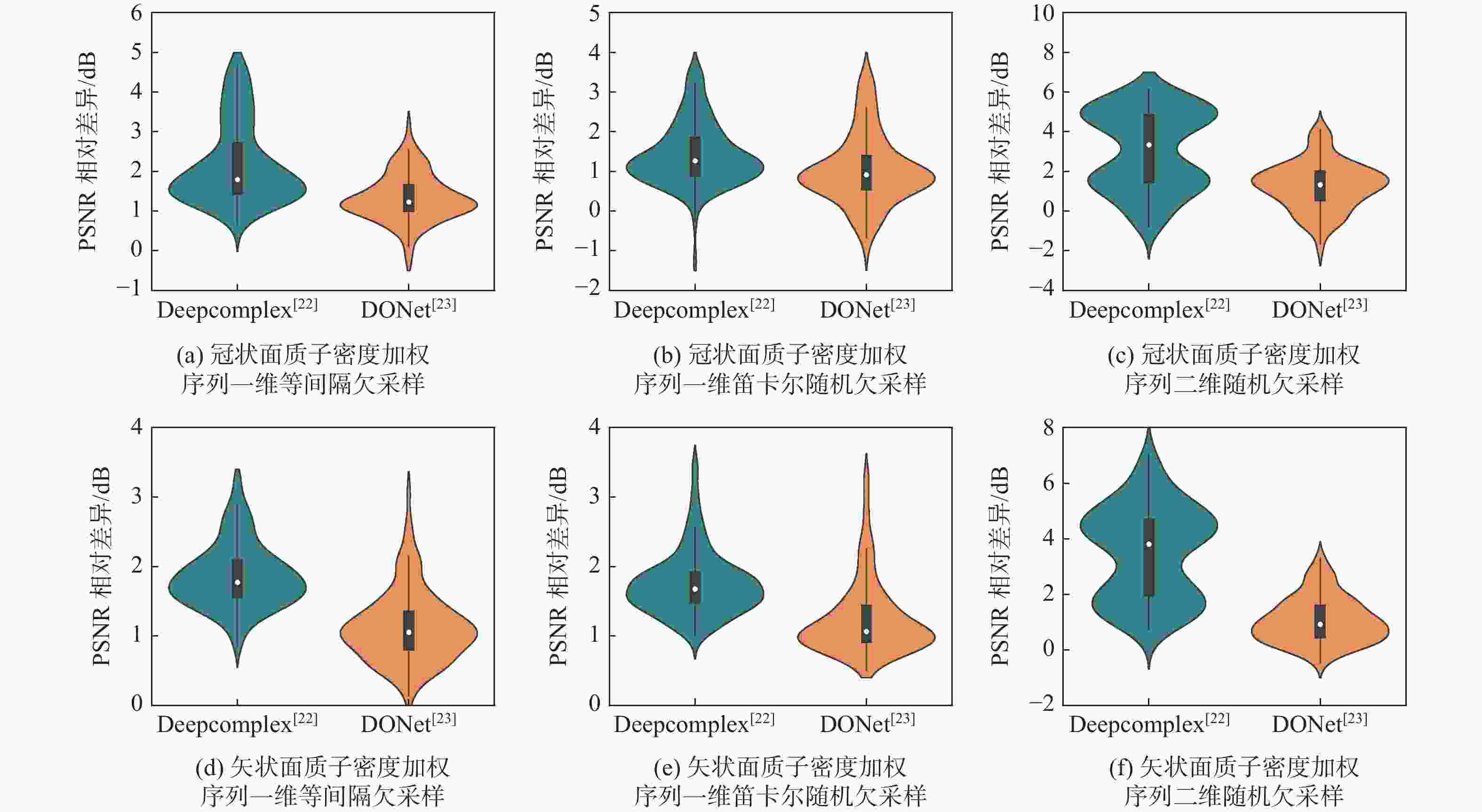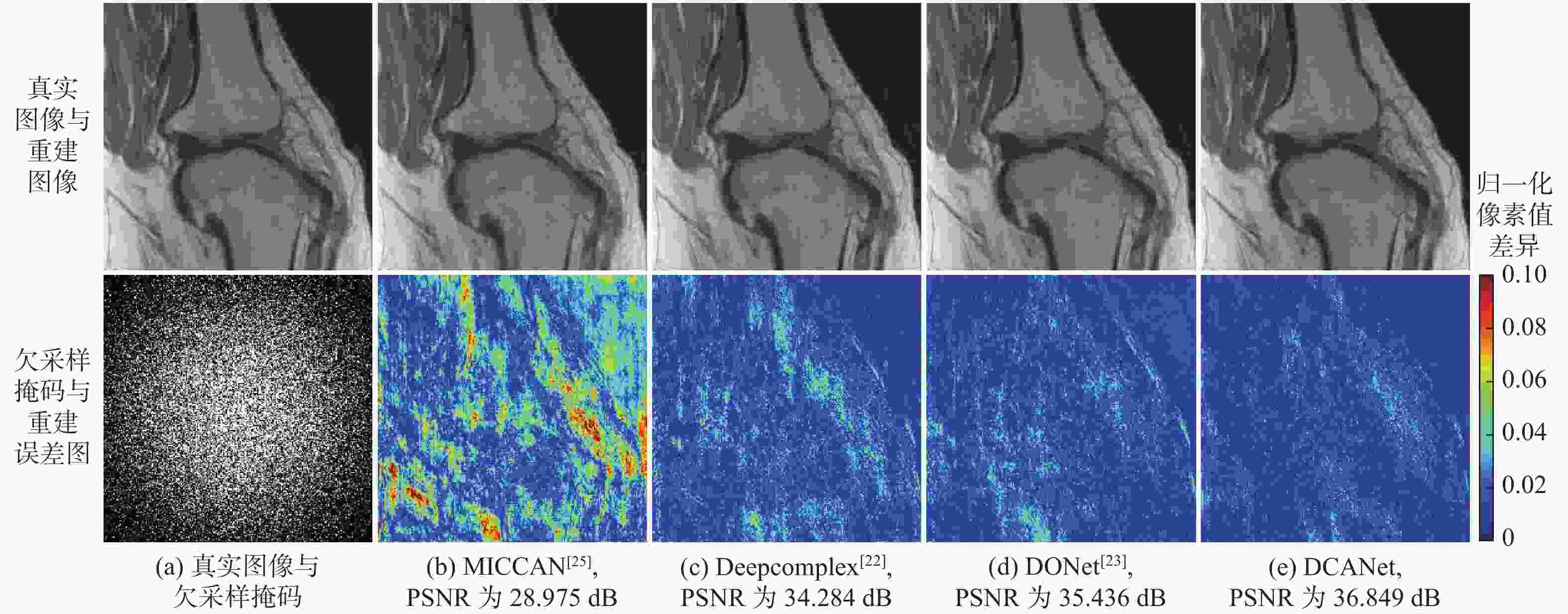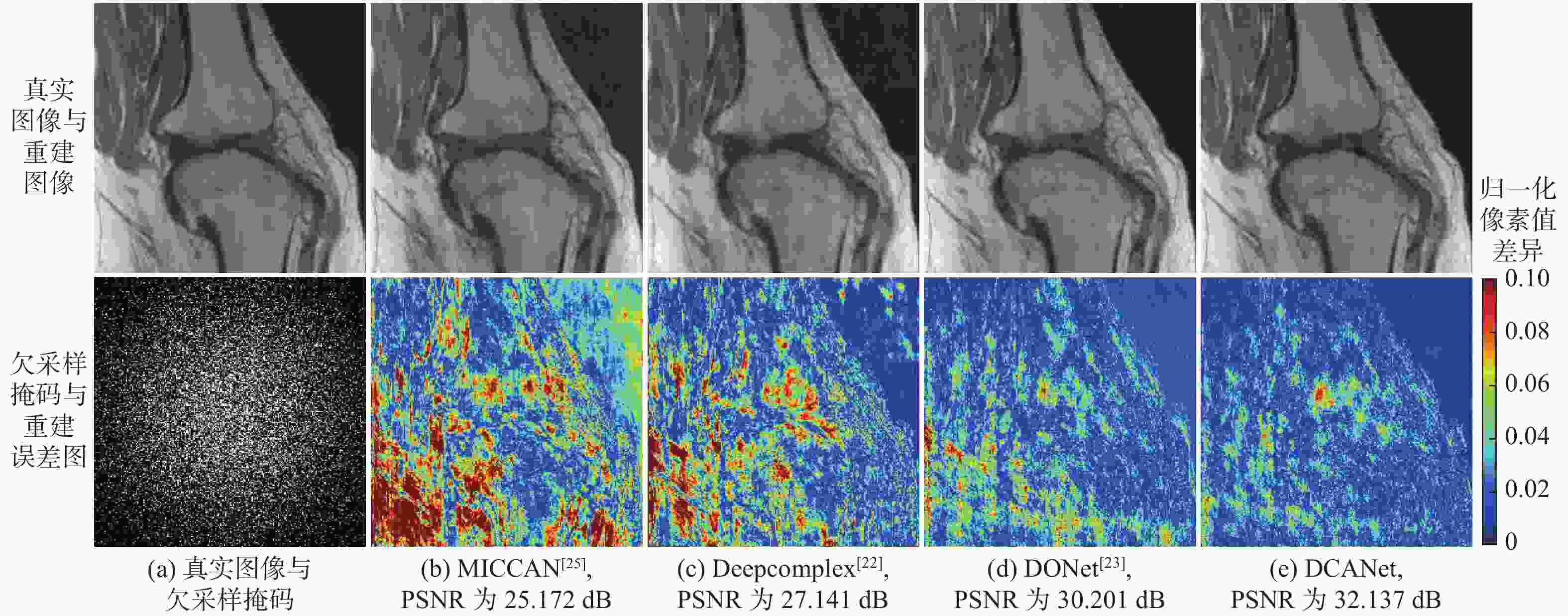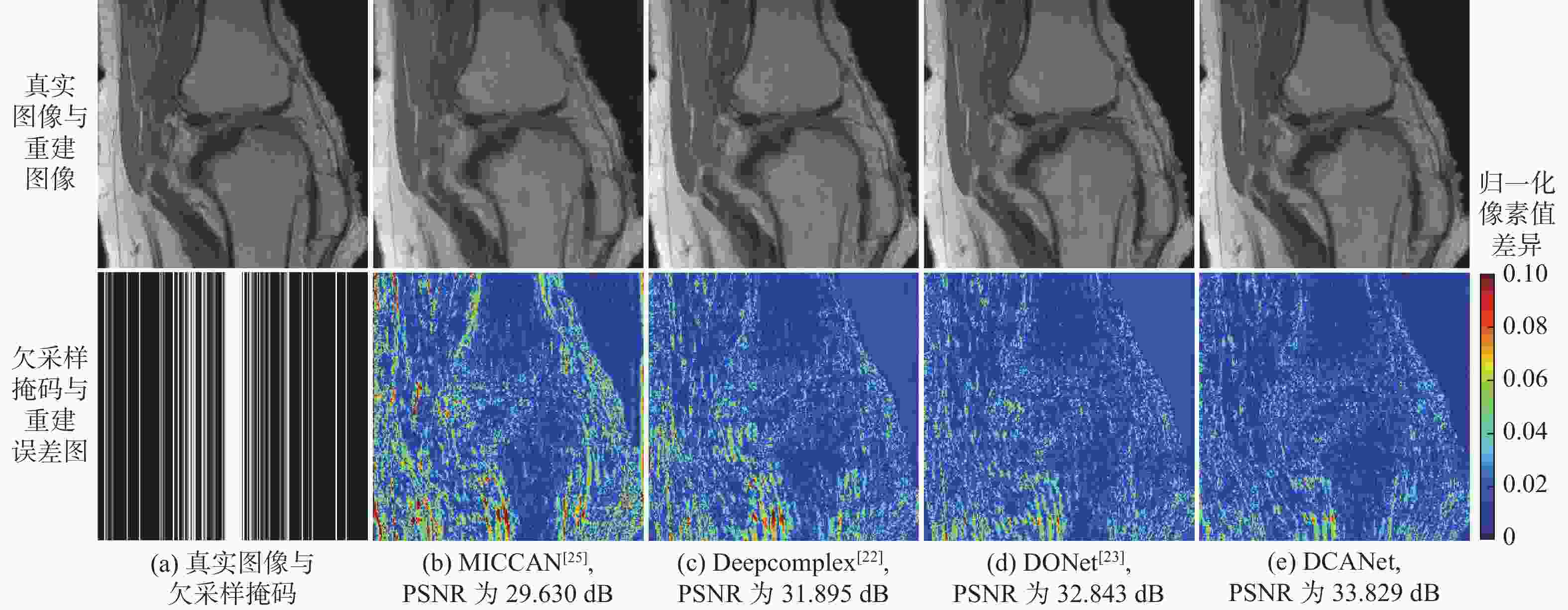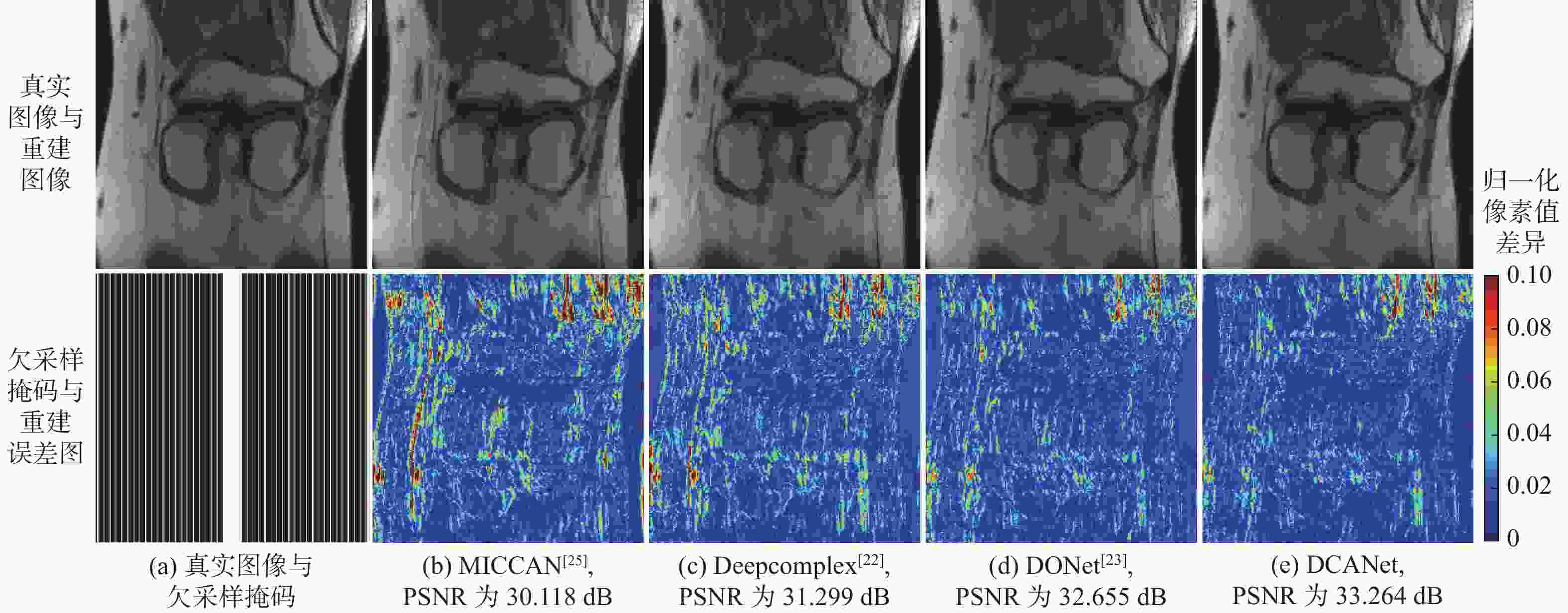欠采样模式 模型 PSNR/dB SSIM HFEN 3 5 3 5 3 5 一维等间隔欠采样 MICCAN[25] 31.695±0.899 29.973±0.895 0.831±0.016 0.773±0.020 0.385±0.062 0.485±0.058 Deepcomplex[22] 32.708±1.519 29.608±2.111 0.835±0.027 0.754±0.031 0.320±0.085 0.483±0.129 DONet[23] 33.308±1.347 30.693±1.427 0.846±0.025 0.776±0.024 0.303±0.073 0.438±0.107 DCANet 34.786±1.497 31.880±1.398 0.876±0.024 0.812±0.029 0.273±0.069 0.403±0.092 一维笛卡尔随机欠采样 MICCAN[25] 34.515±0.982 32.326±0.946 0.872±0.019 0.818±0.027 0.243±0.046 0.354±0.057 Deepcomplex[22] 35.586±1.385 33.039±1.243 0.880±0.021 0.818±0.029 0.193±0.041 0.299±0.072 DONet[23] 35.799±1.443 33.601±1.254 0.884±0.022 0.828±0.026 0.188±0.040 0.275±0.054 DCANet 36.791±1.298 34.687±1.206 0.899±0.019 0.855±0.028 0.181±0.040 0.266±0.062 二维随机欠采样 MICCAN[25] 30.446±2.190 25.881±2.826 0.876±0.021 0.783±0.034 0.193±0.043 0.322±0.073 Deepcomplex[22] 35.591±2.923 28.795±2.346 0.915±0.025 0.803±0.029 0.122±0.033 0.322±0.049 DONet[23] 36.094±2.560 31.847±2.716 0.920±0.026 0.855±0.031 0.113±0.029 0.206±0.057 DCANet 36.917±2.849 33.596±2.843 0.935±0.017 0.891±0.022 0.103±0.028 0.176±0.048 表 3 矢状面质子密度加权序列重建效果
