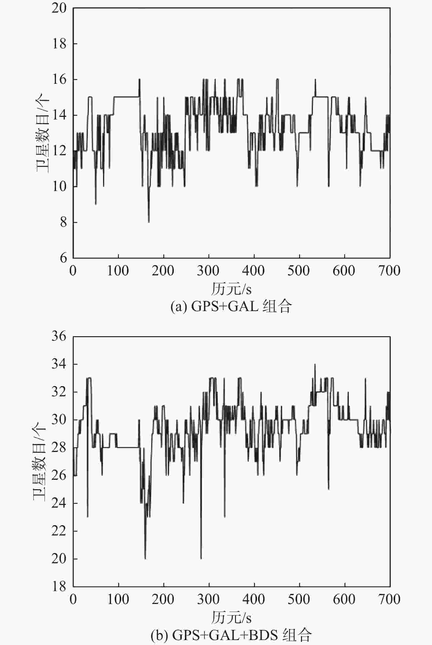 可用性/%提高率/% GPS+GAL 10 0.00 51.29 51.29 20 47.86 99.14 51.29 30 96.43 99.71 3.29 40 99.57 100.00 0.43 50 99.71 100.00 0.29 GPS+GAL+BDS 10 0.00 99.29 99.29 20 88.71 100.00 11.29 30 98.71 100.00 0.00 40 100.00 100.00 0.00 50 100.00 100.00 0.00 表 7 有遮挡场景下双星座和多星座组合的平均保护级优化率