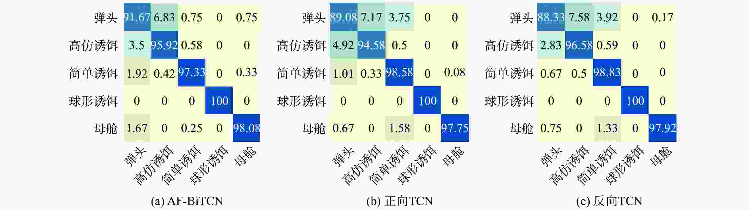 表 1 AF-BiTCN参数设置 Table 1. AF-BiTCN parameters setting 参数 数值 损失函数 交叉熵 优化器 Adam[24] 批量大小 256 学习率 0.000 3 一阶矩衰减率 0.9 二阶矩衰减率 0.999 滑窗窗长 32 滑窗间隔 16 迭代次数 400 卷积核 256,128,64,64 卷积核尺寸 1×3 膨胀系数 1,2,8,16 Dropout率 0.5 表 2 不同方法性能对比 Table 2. Performance comparison of different methods 模型 准确率/% 参数量 识别速度/μs AF-BiTCN 96.60 1.16×106 334 CNN-BiGRU 95.78 1.76×106 792 Attention-BiGRU 95.57 1.15×106 708 BiGRU 95.37 1.15×106 670 BiLSTM 94.70 1.52×106 884 SGRU 94.17 0.56×106 374 SLSTM 93.87 0.58×106 392 表 3 不同信噪比条件下鲁棒性对比实验的识别准确率 Table 3. Recognition accuracy of robustness comparison experiments under different signal-to-noise ratios % 信噪比/dB SLSTM SGRU BiLSTM BiGRU Attention-BiGRU CNN-BiGRU AF-BiTCN −10 56.69 56.08 54.00 56.11 56.22 55.58 56.88 −5 66.02 66.00 67.67 68.25 67.81 66.56 69.22 0 75.86 75.61 74.83 75.55 77.02 75.33 77.21 5 82.83 81.61 81.00 82.22 83.13 82.94 83.64 10 86.33 86.64 84.78 86.05 87.50 87.89 89.03 20 89.91 91.86 88.33 90.97 91.61 92.36 92.45 表 4 不同融合方法的性能对比 Table 4. Performance comparison of different fusion methods % 融合方法 弹道目标类别 准确率 精确率 召回率 F1分数 加性融合 弹头 91.60 92.74 91.74 92.24 高仿诱饵 95.92 93.04 95.91 94.46 简单诱饵 97.33 98.40 97.25 97.82 球形诱饵 100.00 100.00 100.00 100.00 母舱 98.08 98.90 98.08 98.49 同维度连接 弹头 89.75 93.24 89.82 91.50 高仿诱饵 94.33 93.16 94.33 93.74 简单诱饵 98.58 94.94 98.50 96.68 球形诱饵 100.00 100.00 100.00 100.00 母舱 97.92 99.23 97.91 98.57 乘性融合 弹头 87.42 95.01 87.48 91.09 高仿诱饵 95.75 92.28 95.75 93.98 简单诱饵 99.33 93.27 99.25 96.16 球形诱饵 100.00 100.00 100.00 100.00 母舱 97.58 99.82 97.58 98.69 表 5 AF-BiTCN消融实验结果 Table 5. Ablation experiments results of AF-BiTCN % 模型 准确率 召回率 精确率 F1分数 AF-BiTCN 96.60 96.62 96.60 96.60 正向TCN 96.00 96.00 96.01 95.98 反向TCN 96.33 96.33 96.38 96.31