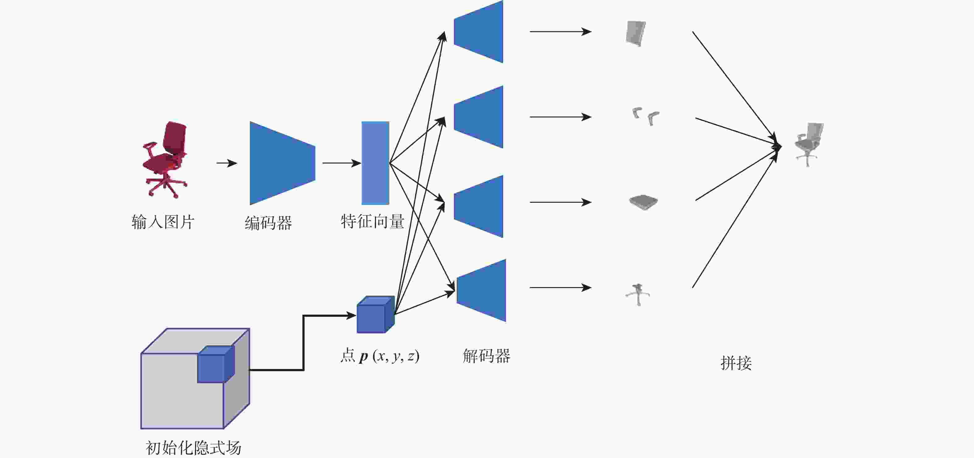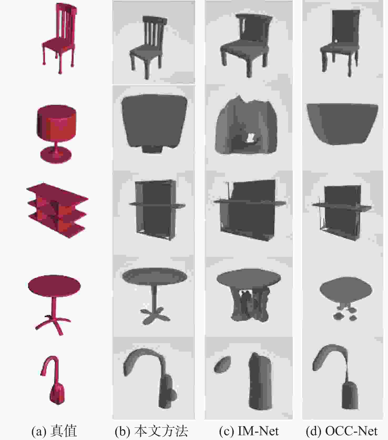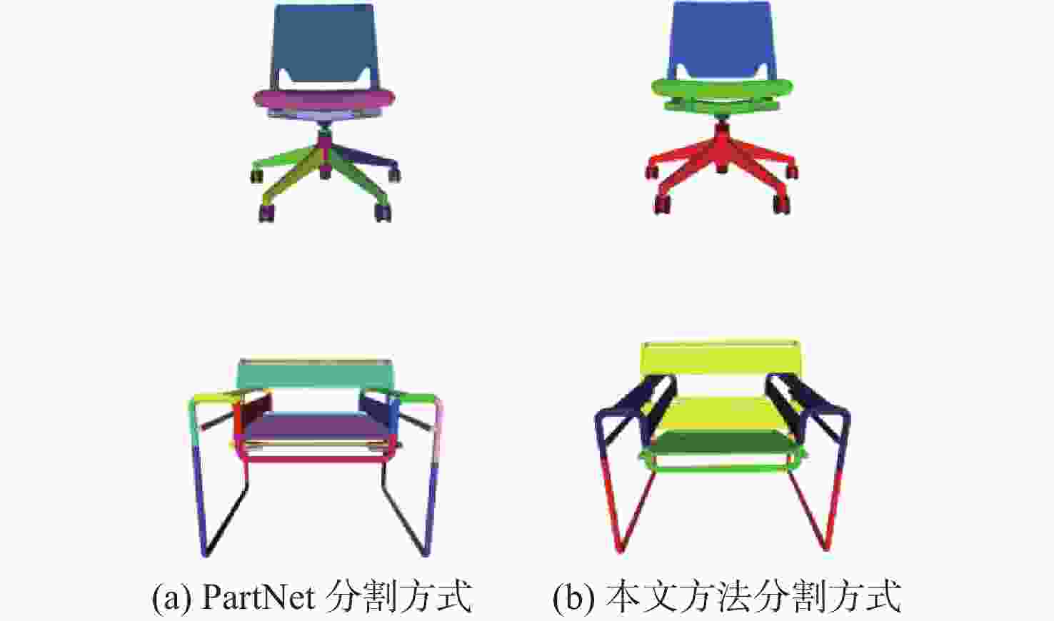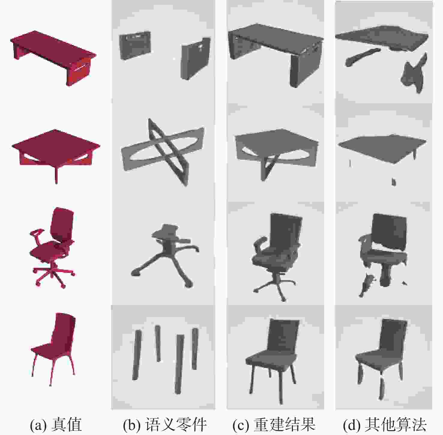 表 1 语义分割后模型平均零件数量 Table 1. Average number of parts in the model after segmentation 模型类别 PartNet 本文方法 椅子 18.33 3.36 桌子 5.24 2 台灯 11.35 2 水槽 13.02 2.66 储物柜 9.51 2 表 2 重建交并比结果 Table 2. Result of IoU 模型类别 IM-Net 本文方法 OCC-Net 椅子 41.57 46.56 42.05 桌子 58.71 62.37 59.15 台灯 38.33 39.12 39.10 水槽 37.17 39.15 34.98 储物柜 46.16 48.23 45.88 表 3 重建钱伯距离结果 Table 3. Result of rebuilding CD 模型类别 IM-Net 本文方法 OCC-Net 椅子 0.973 0.968 0.981 桌子 0.835 0.788 0.812 台灯 1.150 1.095 1.152 水槽 1.205 1.135 1.213 储物柜 1.011 0.983 1.001 表 4 重建时间及显存消耗 Table 4. Rebuild time and memory comparison 算法名称 重建时间/s 显存开销/GB 本文方法 10.3 2.9 IM-Net 5.6 3.2 OCC-Net 6.2 3.5