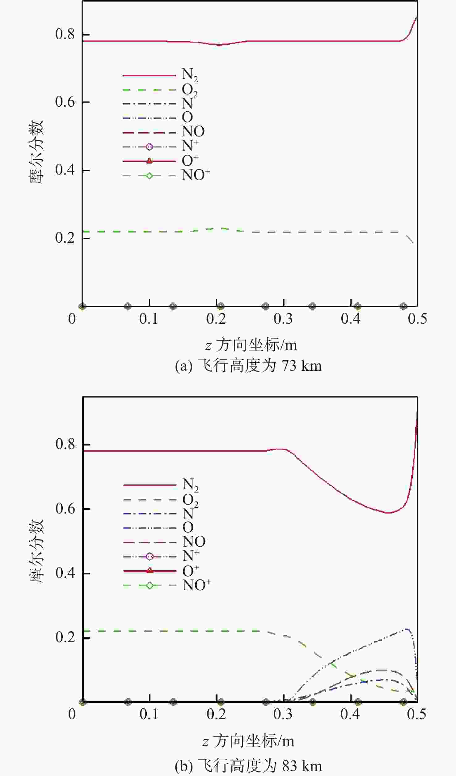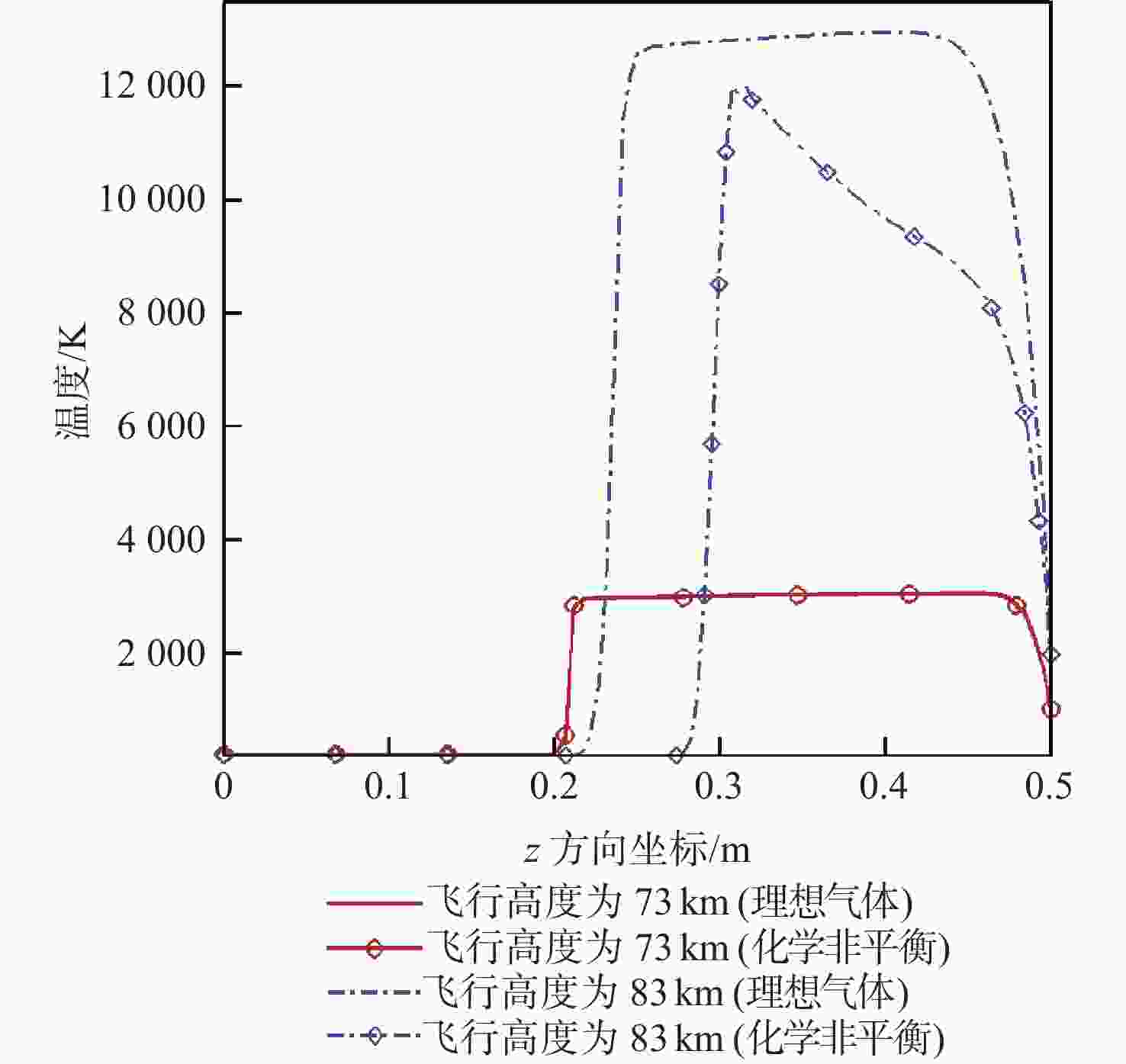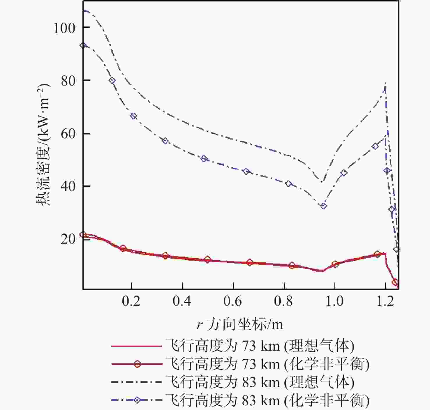 分别采用空气9组分化学非平衡模型和基于理想气体假设模型对充气式返回舱再入流场进行数值模拟,考察2种方法计算结果的差异,研究真实气体效应的表现形式,探究充气式返回舱真实气体效应与刚性返回舱真实气体效应存在差异的原因。研究结果表明:相比于理想气体假设,真实气体效应使激波位置更靠近壁面,激波后空气温度降低,壁面热流密度下降;在飞行高度为83 km处,激波后气体比热比高于1.4,空气发生解离反应,而在飞行高度为73 km处真实气体效应的作用较弱,激波后空气的比热比维持在1.4,空气仍以分子的形式存在;导致充气式返回舱与刚性返回舱在相同高度范围真实气体强弱差异的主要原因是充气式返回舱的阻重比相较于刚性返回舱更大,进入大气后速度下降更快,在相同高度速度更低。