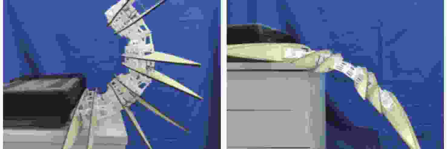 Abstract:Morphing aircraft is a new concept vehicle that changes its aerodynamic shape by a morphing mechanism to adapt to various flight environments and mission requirements, which has important application value in aerospace, military reconnoitre, and other fields and is the frontier and hot spot of future vehicle research. In response to the new development needs of wide airspace and wide speed domain of the morphing aircraft, a spanwise bending morphing wing mechanism with a multi-closed-loop space mechanism based on the equilateral Bennett mechanism was proposed. Firstly, the geometric characteristics of the equilateral Bennett mechanism were studied, and the design scheme of the multi-closed-loop morphing wing mechanism based on the equilateral Bennett mechanism was proposed. Secondly, the constrained spiral solution method was used to solve the degrees of freedom of the morphing wing mechanism, and the kinematic model was established based on the D-H coordinate transformation method. Then, the 3D model and virtual prototype of the mechanism were established, and the kinematic simulation was carried out to verify the above model. The prototype was made, and the experiment was carried out. The research results show that the proposed morphing wing mechanism needs only one power source to drive the mechanism movement, with a simple structure and high modularity rate, and the proposed morphing wing mechanism can realize the accurate connection between the parts and the expected spanwise bending action. The research results provide a reference for the basic research and engineering application of morphing wings for new types of morphing aircraft.