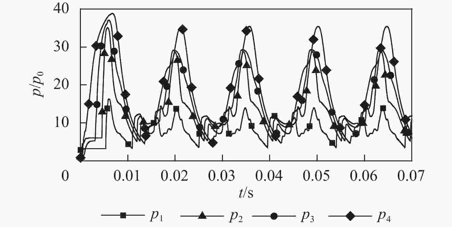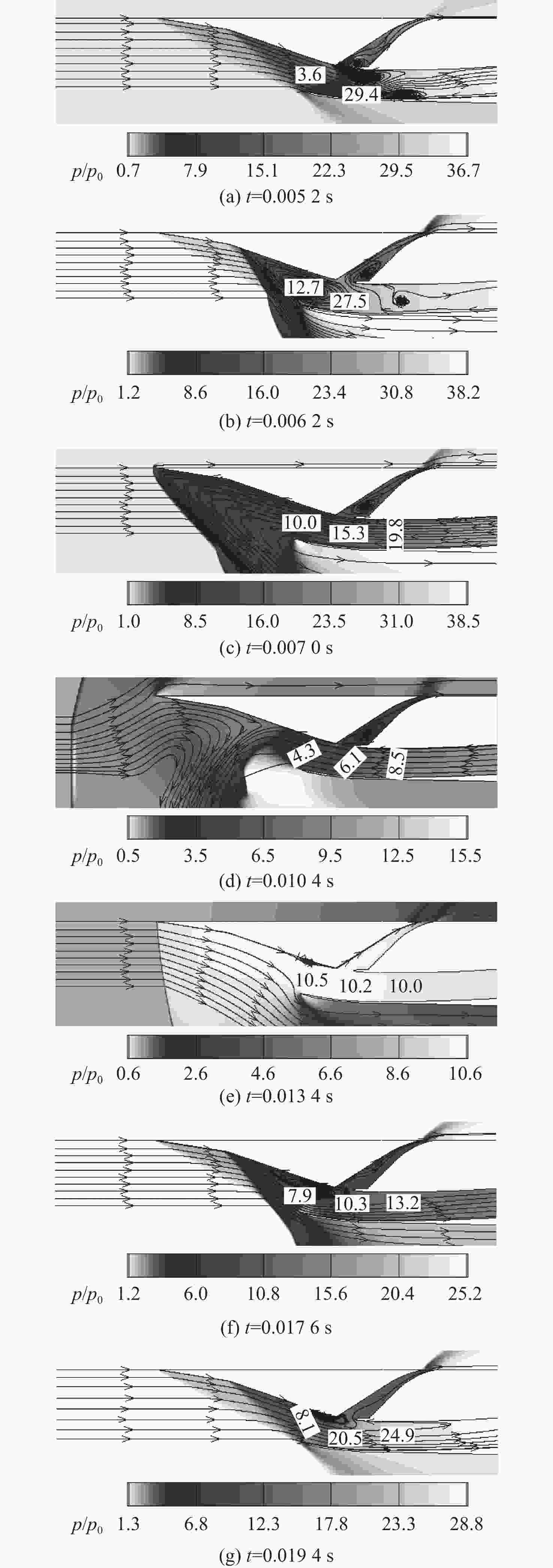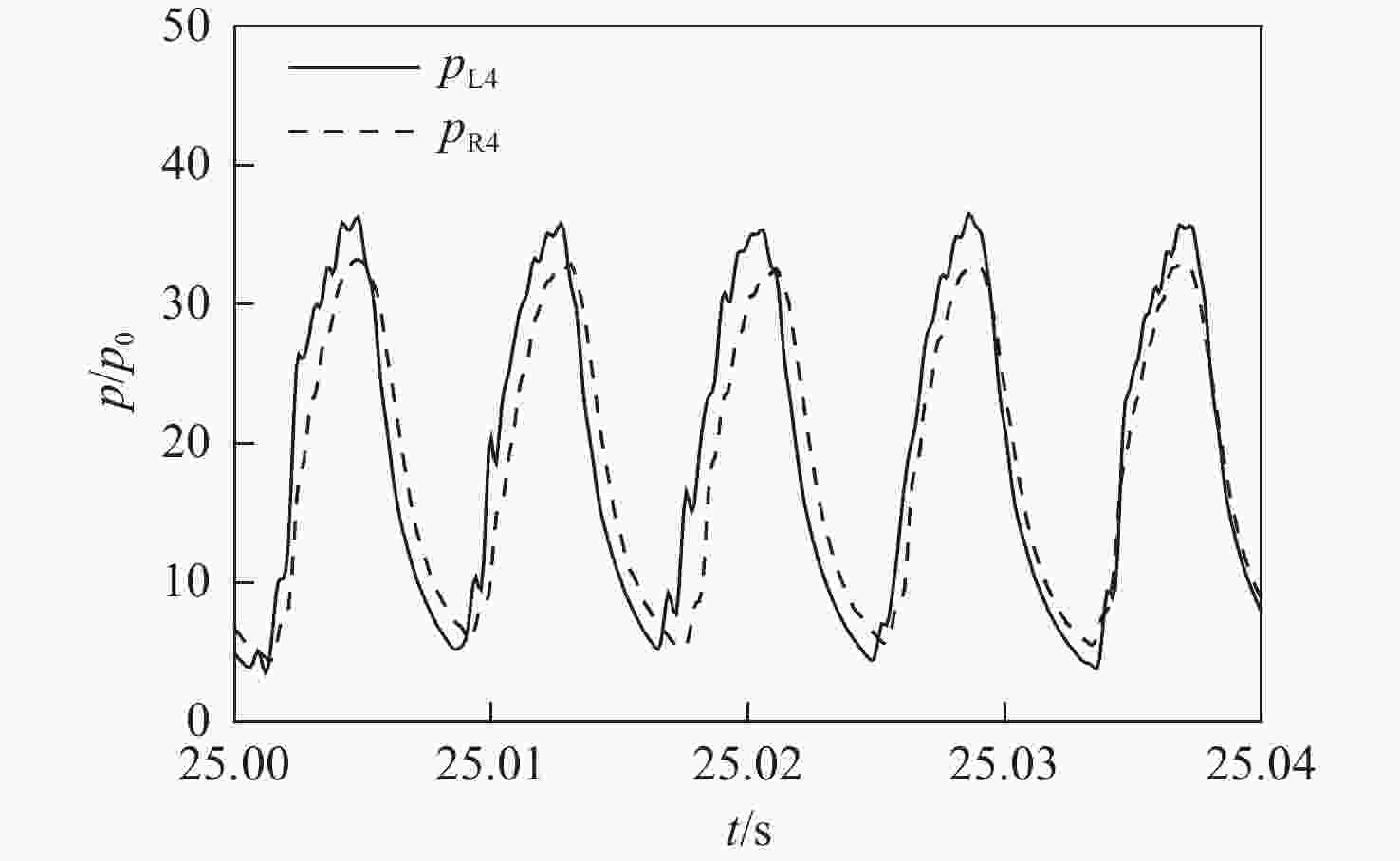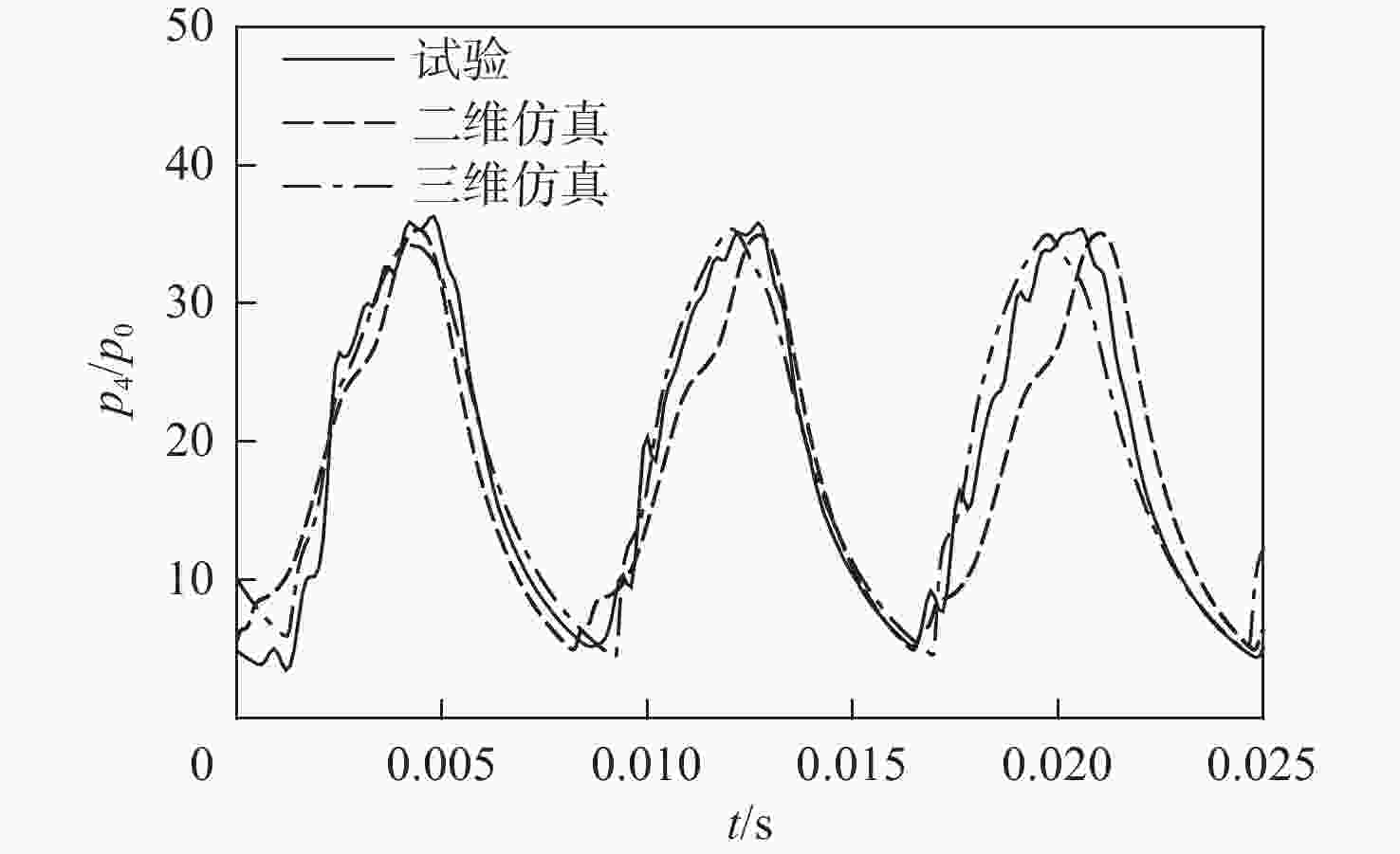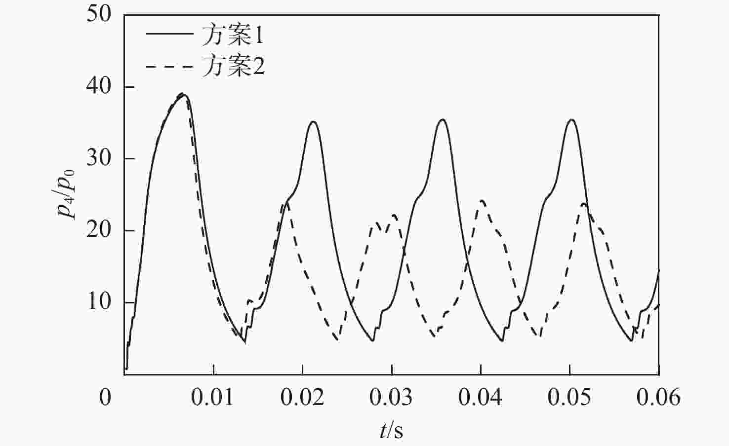误差/%2.6 0.608 0.304 295.07 71.03 69.08 2.75 2.8 0.580 0.290 295.07 71.69 68.44 4.53 3.0 0.556 0.278 295.07 72.22 69.00 4.07 表 7 不同方案进气道p4监测点的压强振荡峰值和频率对比