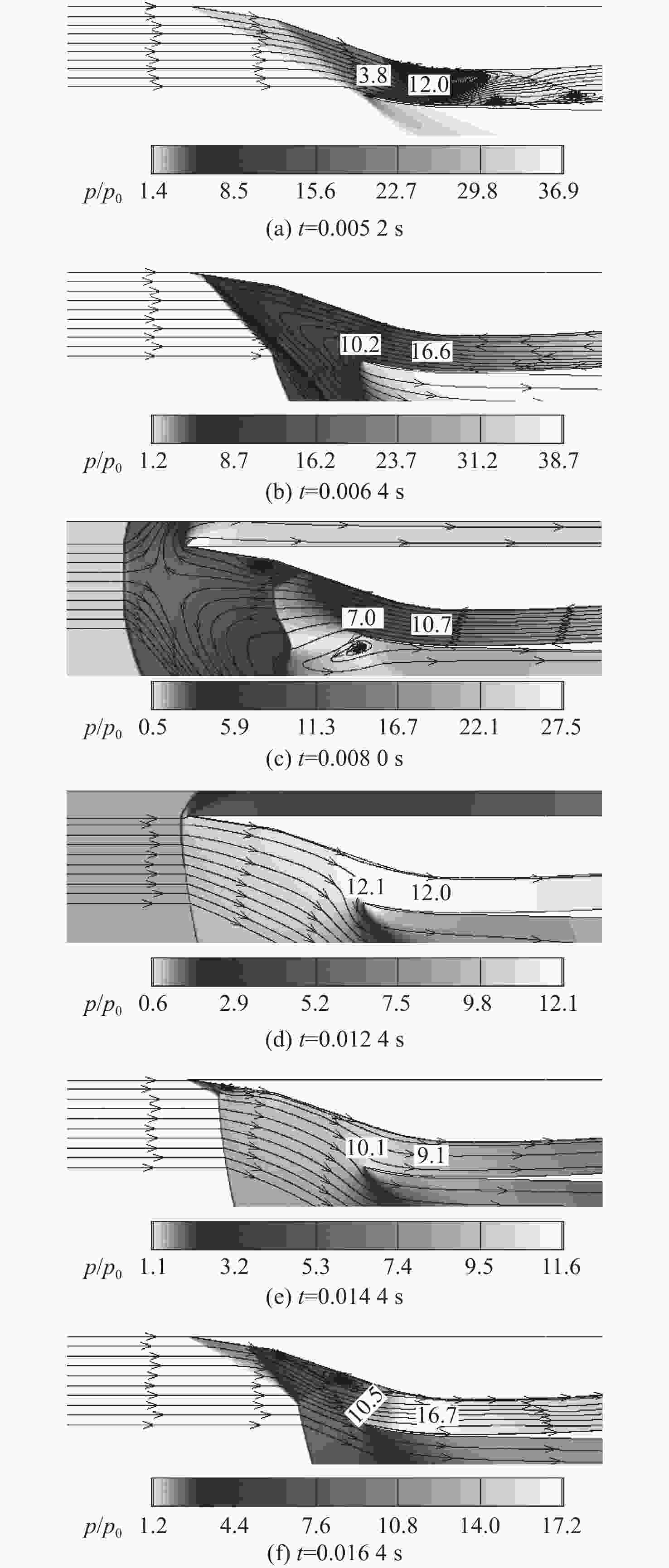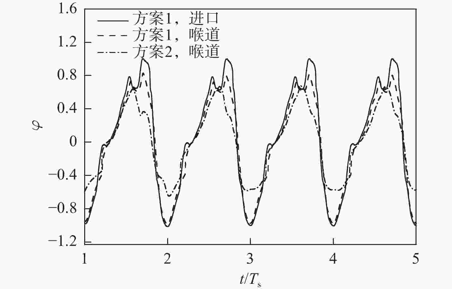 参数来源 f/Hz pmax/p0 Δf/% Δ(pmax/p0)/% 试验 122.00 36.06 二维仿真 120.47 35.40 −1.25 −1.83 三维仿真 121.99 34.87 −0.008 −3.30 表 4 方案1进气道进口前方的气流参数与来流参数对比(h=15 km)