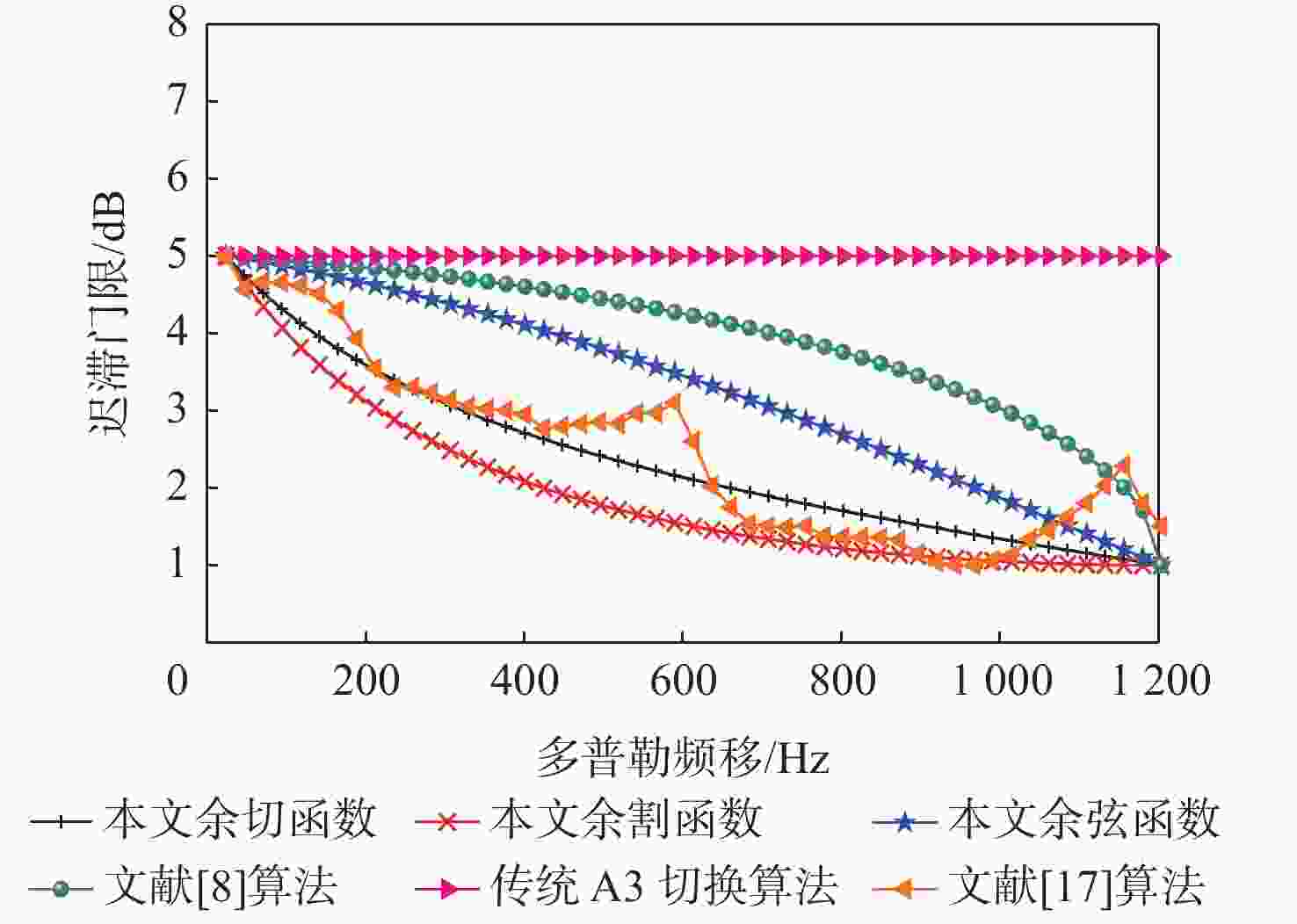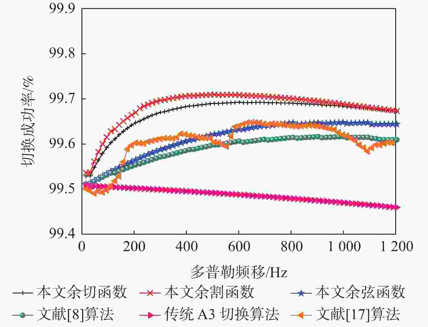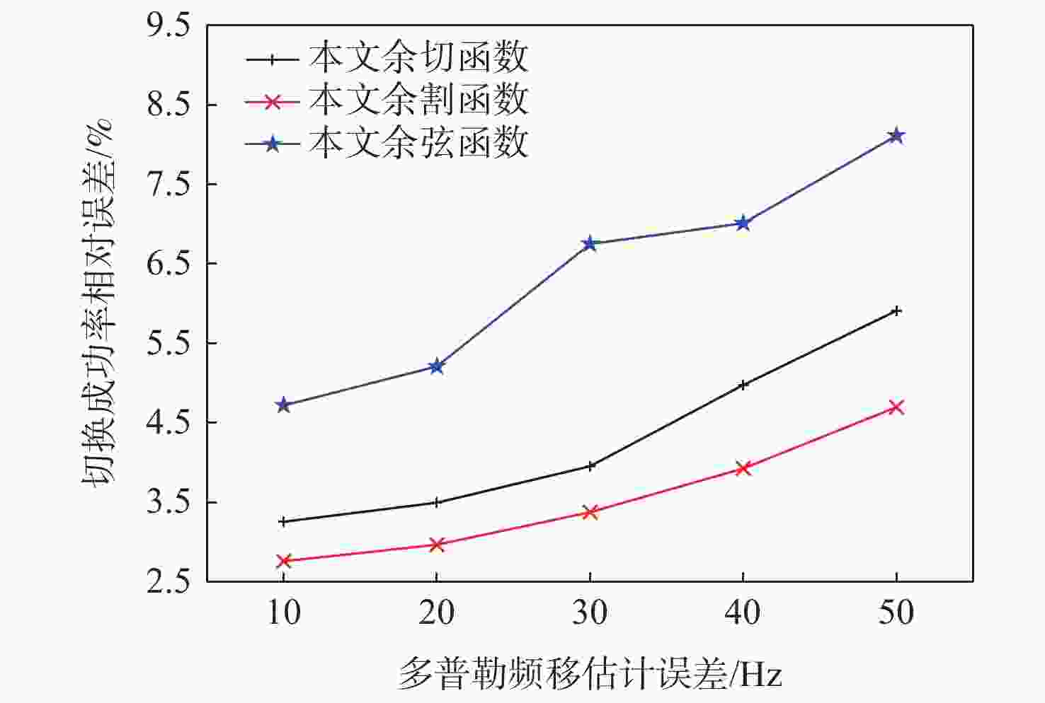 多普勒频移/Hz 未加入误差前切换成功率/% 加入误差扰动后切换成功率/% 本文余切函数 本文余割函数 本文余弦函数 本文余切函数 本文余割函数 本文余弦函数 200 99.6475 99.6698 99.5652 99.6456 99.6601 99.5649 400 99.6827 99.7063 99.6054 99.6819 99.7044 99.6046 600 99.6925 99.7088 99.6326 99.6917 99.7084 99.6317 800 99.6907 99.7008 99.6474 99.6902 99.7005 99.6447 1000 99.6840 99.6889 99.6481 99.6833 99.6807 99.6464 -