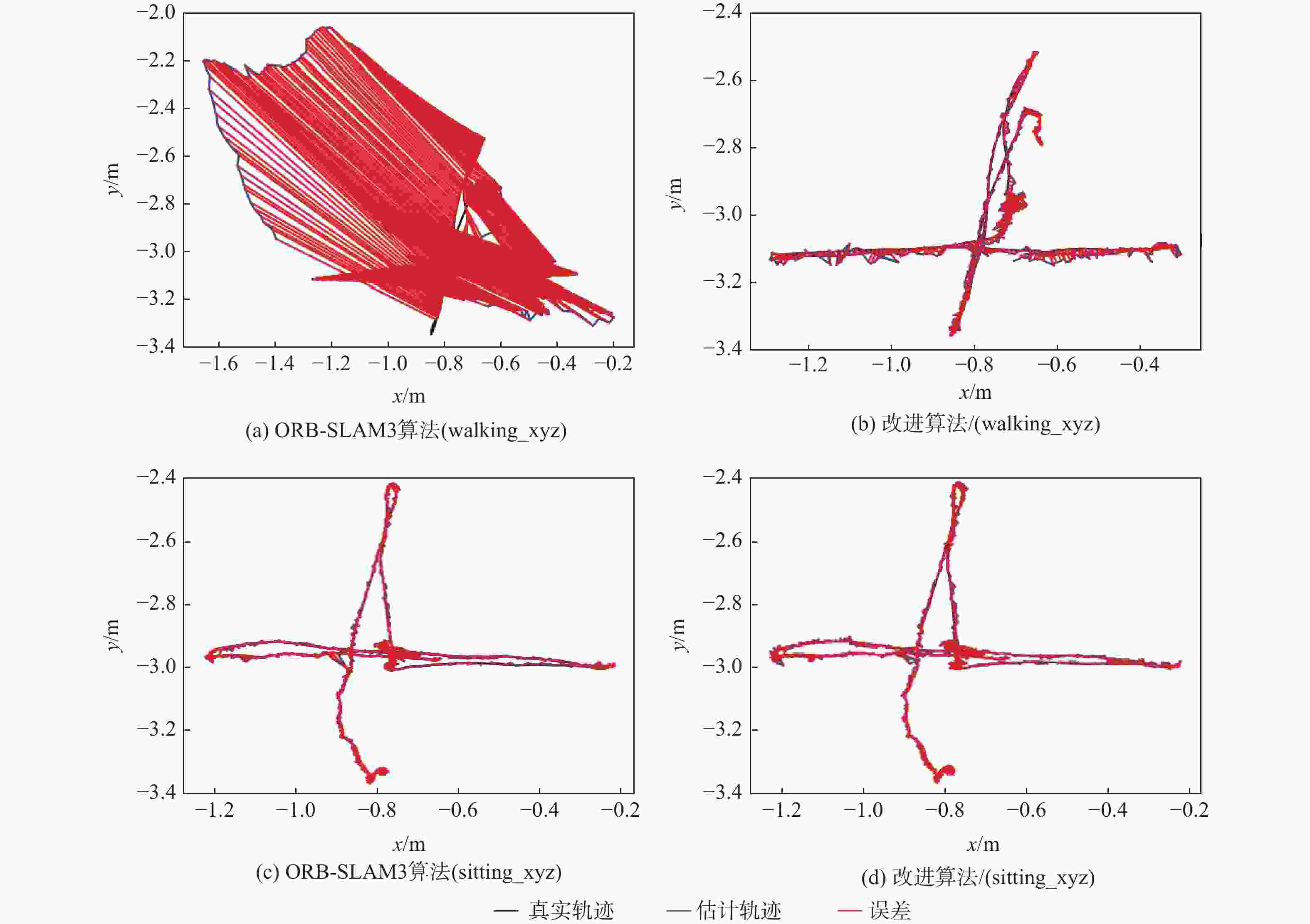 数据集 均方根误差/m 标准偏差/m 每帧耗时/s 策略1 策略2 策略1 策略2 策略1 策略2 sitting_staic 0.007 9 0.010 3 0.004 3 0.006 7 0.081 3 0.063 1 walking_halfsphere 0.019 6 0.020 4 0.009 8 0.010 7 0.078 1 0.066 4 表 4 ORB-SLAM3算法与改进算法的绝对轨迹误差对比分析
