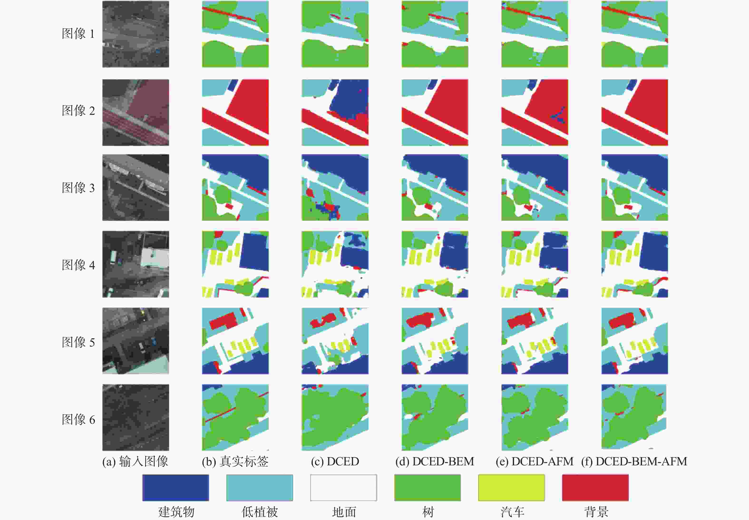 % 网络模型 IoU F1 mIoU PA 背景 植被 道路 水 建筑物 DCED 77.04 92.84 43.91 83.91 78.56 84.71 75.25 91.89 DCED-BEM 82.39 95.34 64.33 89.32 82.85 90.24 82.85 94.18 DCED-AFM 83.55 95.94 68.05 90.60 83.63 91.22 84.35 94.76 DCED-BEM-AFM 83.84 96.25 73.51 92.21 84.52 92.32 86.07 95.15 表 3 Potsdam数据集上对比实验结果