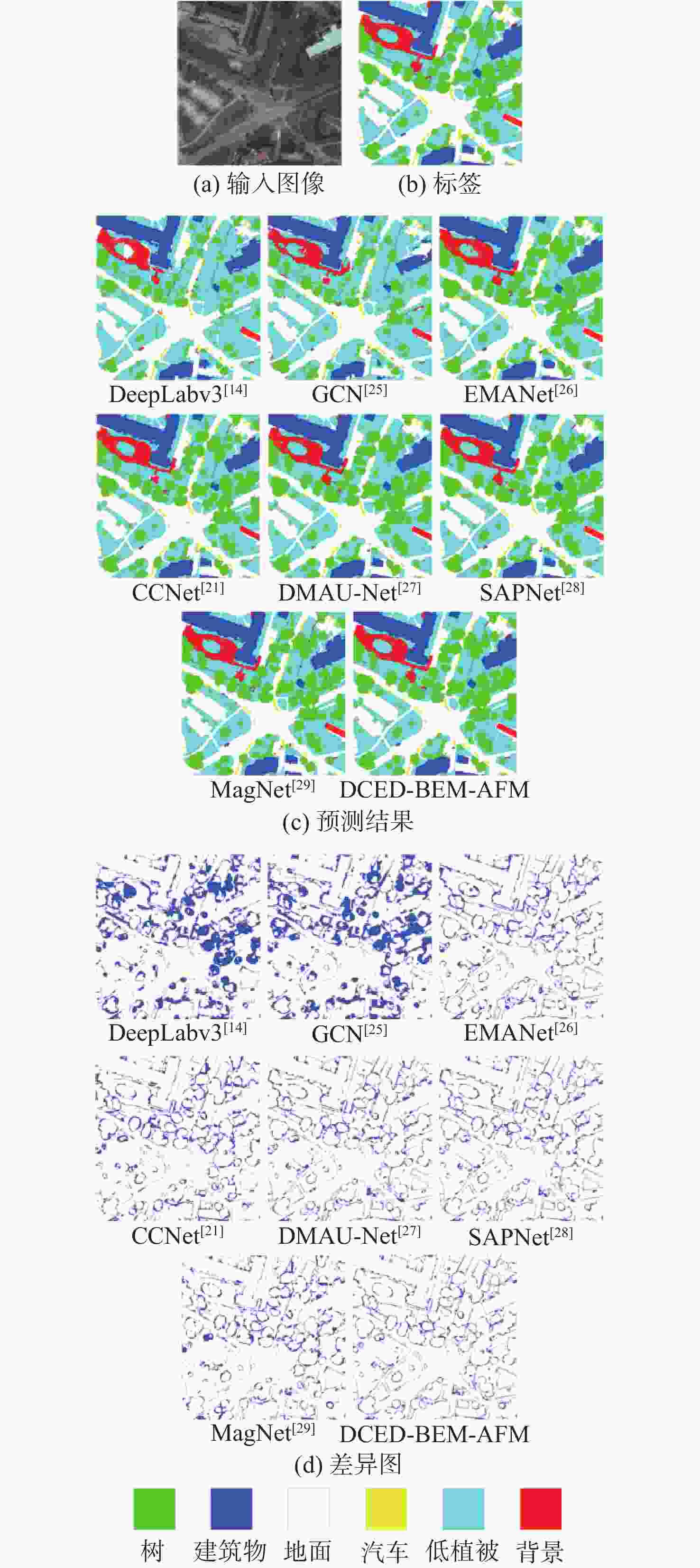 模型 IoU/% mIoU/% 背景 植被 道路 水 建筑物 SegNet[24] 61.42 91.44 45.42 87.27 66.58 70.43 PSPNet[15] 79.08 96.25 48.81 89.91 81.27 79.06 DeepLabv3[14] 80.83 95.27 56.51 88.67 78.66 79.99 GCN[25] 75.77 95.76 58.94 90.11 81.00 80.32 EMANet[26] 81.93 95.13 63.88 88.37 82.52 82.37 CCNet[21] 81.29 95.30 67.06 90.86 81.64 83.23 DMAU-Net[27] 82.02 95.55 67.79 89.77 82.20 83.47 MagNet[29] 82.37 95.70 70.47 91.31 82.78 84.53 SAPNet[28] 83.88 96.07 68.37 91.10 84.58 84.80 DCED-BEM-AFM 83.84 96.25 73.51 92.21 84.52 86.07 -