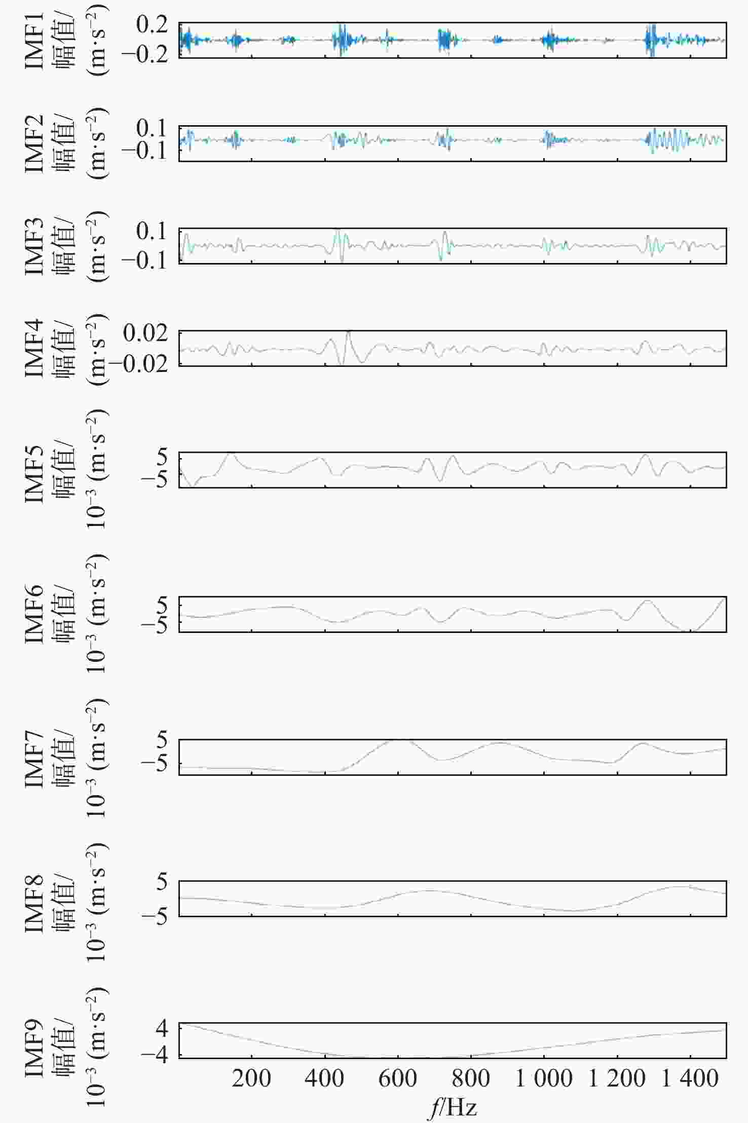 分量 综合指标P 分量 综合指标P 分量 综合指标P IMF1 30.614 IMF4 4.906 IMF7 2.534 IMF2 21.787 IMF5 5.401 IMF8 2.407 IMF3 4.825 IMF6 3.149 IMF9 1.557 表 5 试验轴承信号2EMD分解分量峭度参数