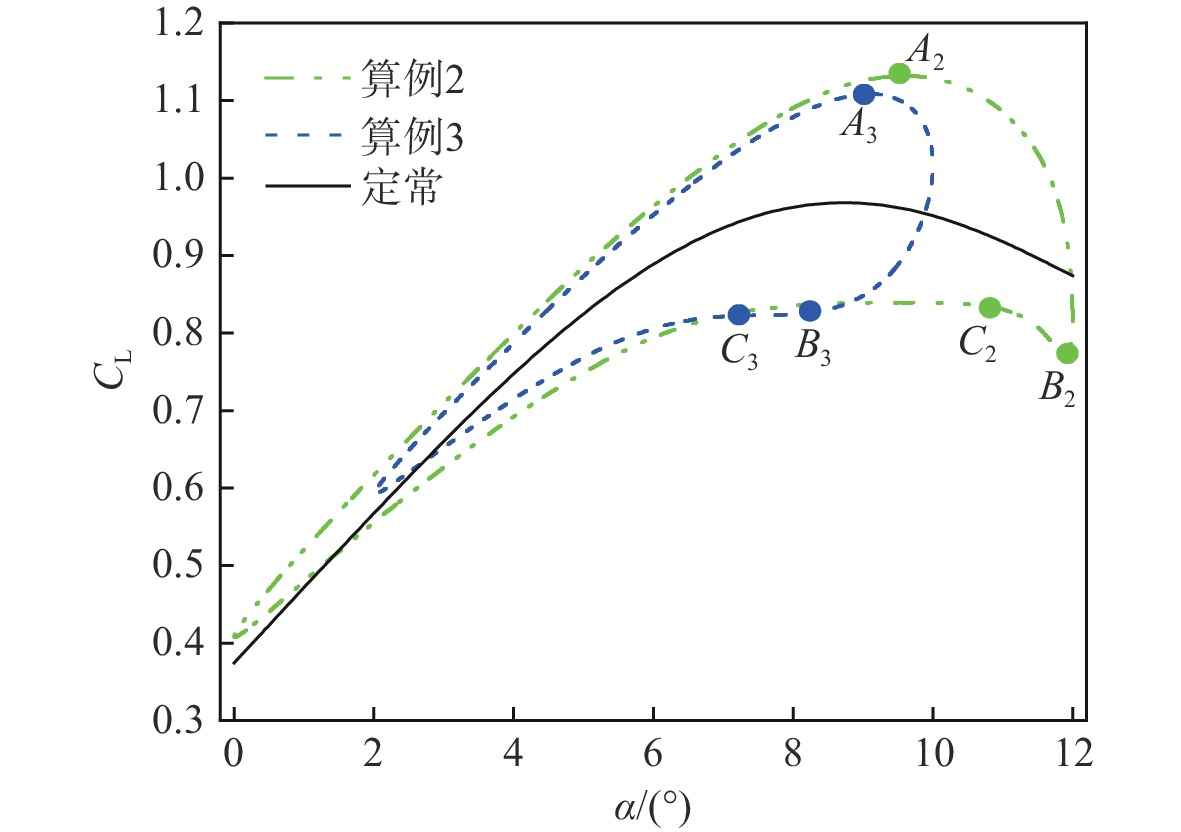缩减频率/K 最大升力系数CLmax ΔCLmax/% 0(定常) 0.977 0.003 0.986 0.9 0.007 0.999 2.2 0.009 1.003 2.7 0.01 1.005 2.9 0.015 1.021 4.5 0.02 1.038 6.3 0.03 1.073 9.8 0.051 1.132 15.9 -