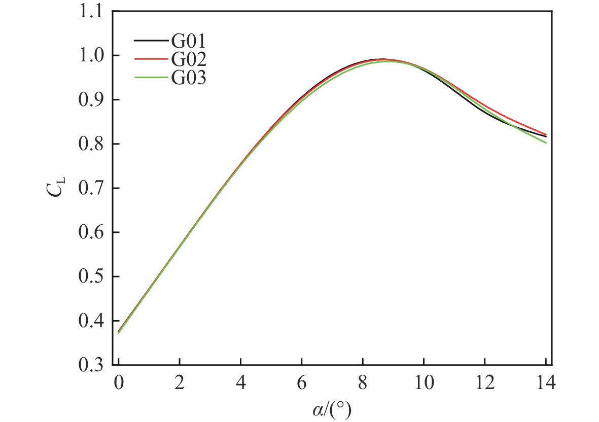 总数G01 10−5 200 1.15 2.3×104 G02 10−5 250 1.1 3.7×104 G03 10−5 300 1.05 4.9×104 表 3 最大升力系数随缩减频率变化的计算数据