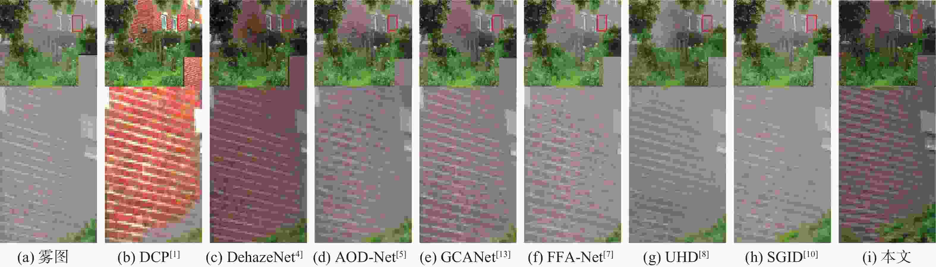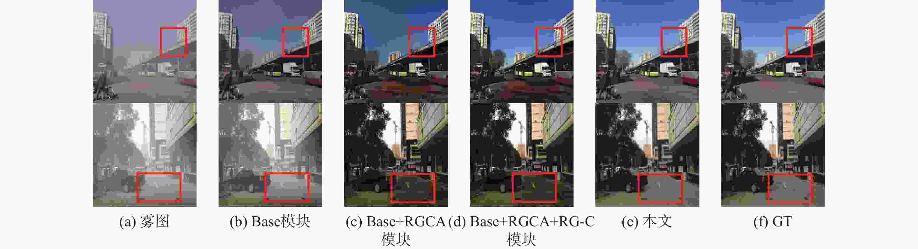 模块 PSNR/dB SSIM Base 27.25 0.9562 Base+RGCA 28.89 0.9619 Base+RGCA+RG-C 28.85 0.9761 Base+RG-C+LHFF 31.17 0.9792 Base+RGCA+LHFF 30.61 0.9780 本文 33.08 0.9814 -