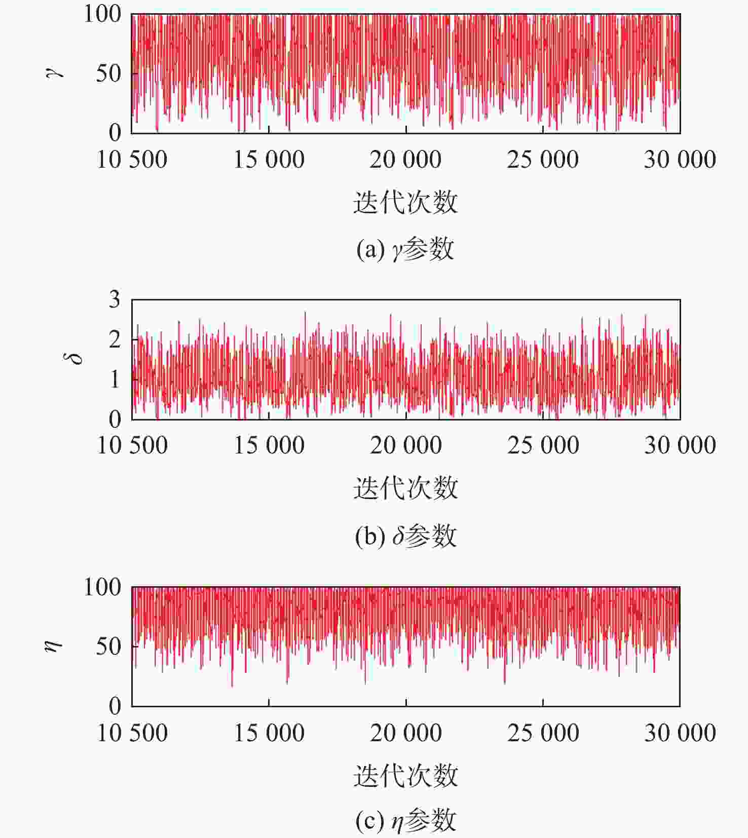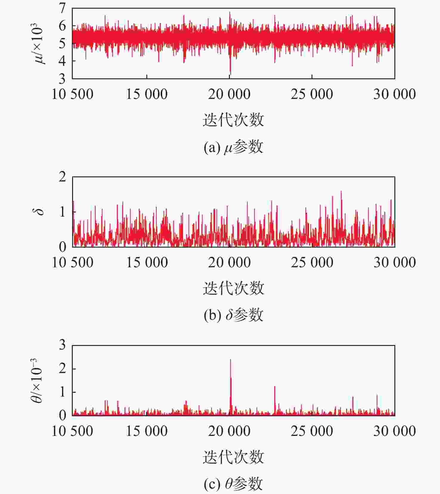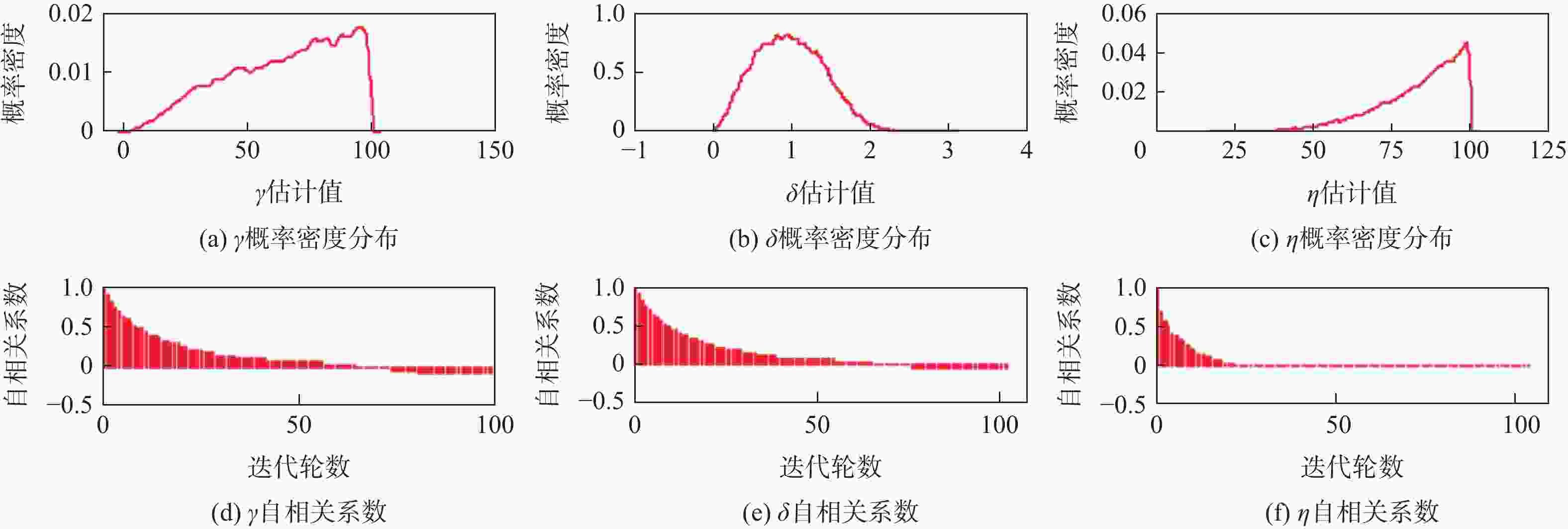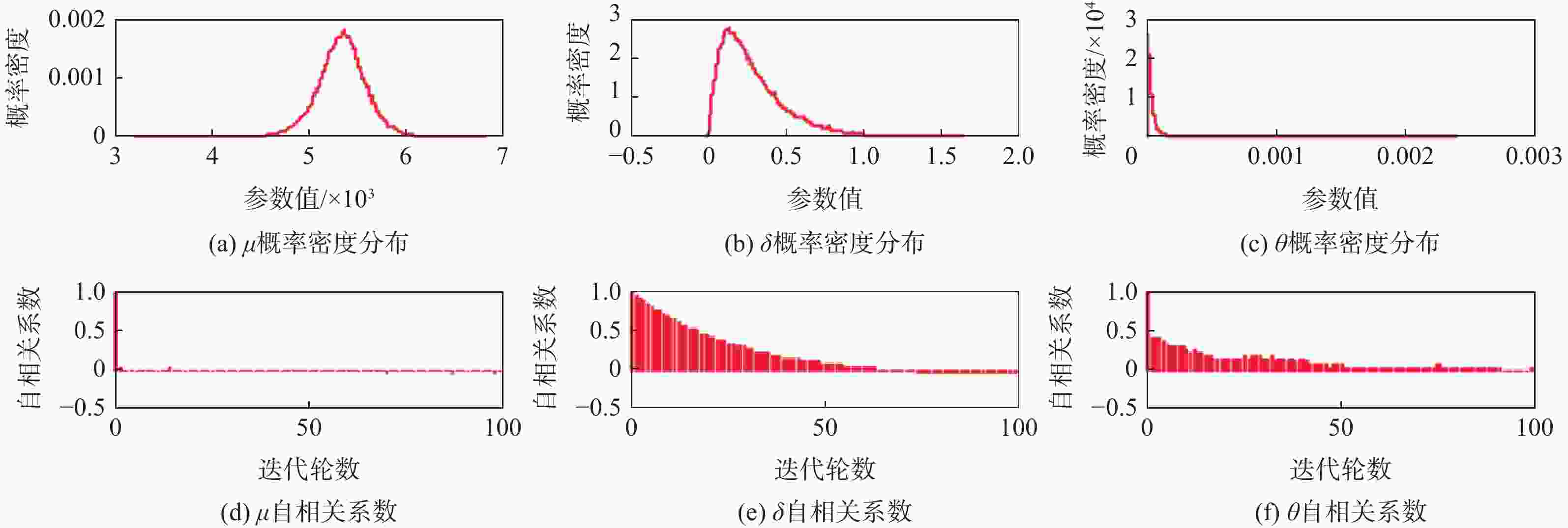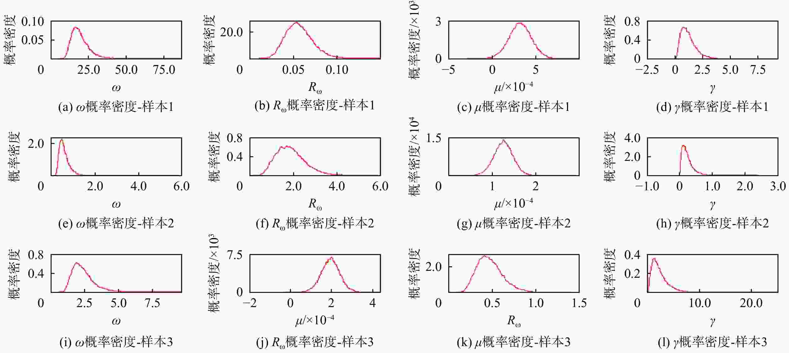 参数 均值 标准差 MCMC误差 95%置信区间 ω(样本1) 19.3 5.87 0.06595 [11.09,33.54] ω(样本2) 0.6146 0.2624 0.003225 [ 0.2946 ,1.2570 ]ω(样本3) 2.366 0.8213 0.007614 [1.238,4.403] Rω(样本1) 0.05616 0.01554 1.677×10−4 [ 0.02981 ,0.09016 ]Rω(样本2) 1.871 0.6728 0.00691 [ 0.7952 ,3.3940 ]Rω(样本3) 0.4692 0.1487 0.001214 [ 0.2271 ,0.8075 ]μ(样本1) 3.286×10−4 1.32×10−4 9.051×10−7 [6.723×10−5,5.883×10−4] μ(样本2) 1.252×10−4 2.279×10−5 1.668×10−7 [8.0×10−5,1.702×10−4] μ(样本3) 1.922×10−4 4.661×10−5 2.767×10−7 [9.719×10−5,2.848×10−4] δ 0.2314 0.1796 0.002692 [ 0.02694 ,0.70420 ]γ 1.242 0.7701 0.01149 [ 0.2735 ,3.1560 ]θ 2.284 1.672 0.01465 [0.334,6.557] -