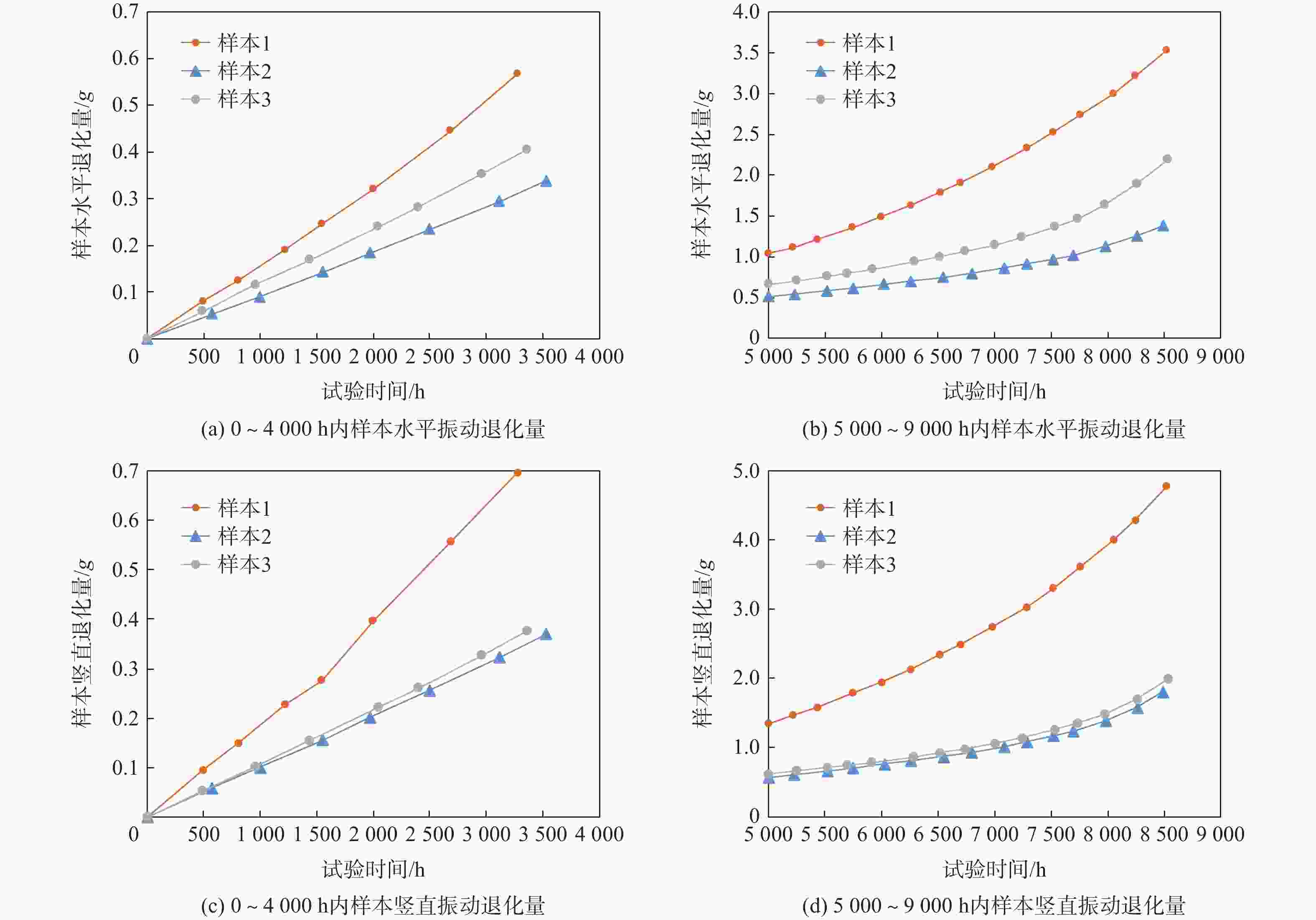 时间/h 水平退化/g 竖直退化/g 时间/h 水平退化/g 竖直退化/g 时间/h 水平退化/g 竖直退化/g 0 0 0 0 0 0 0 0 0 493 0.080 0.095 574 0.053 0.059 488 0.058 0.053 806 0.125 0.150 996 0.090 0.101 958 0.116 0.103 1 218 0.190 0.227 1 554 0.143 0.156 1 439 0.169 0.155 1 544 0.246 0.276 1 972 0.184 0.202 2 044 0.240 0.222 1 998 0.320 0.396 2 498 0.234 0.257 2 399 0.282 0.261 2 685 0.446 0.556 3 115 0.294 0.323 2 961 0.353 0.327 3 279 0.569 0.696 3 529 0.338 0.370 3 362 0.405 0.377 表 2 伺服驱动单元后期试验退化数据