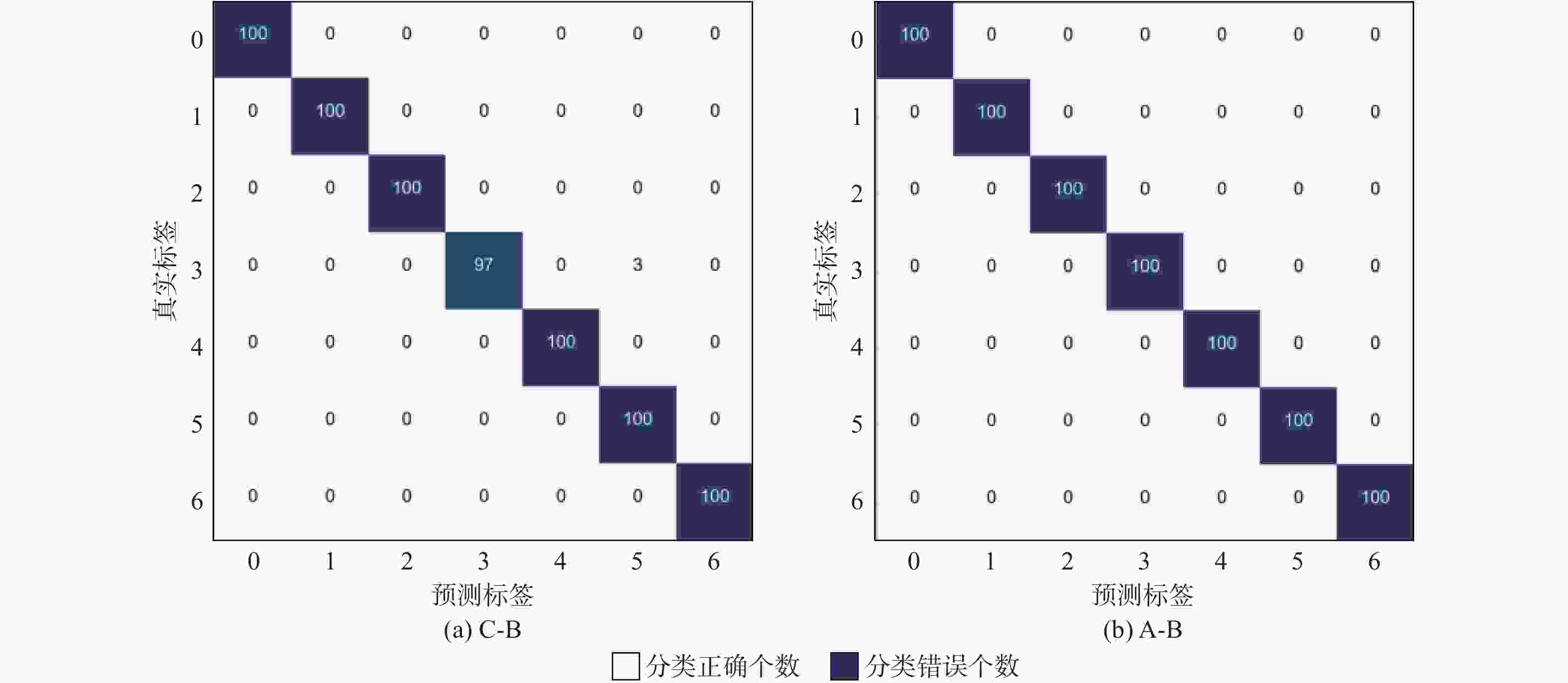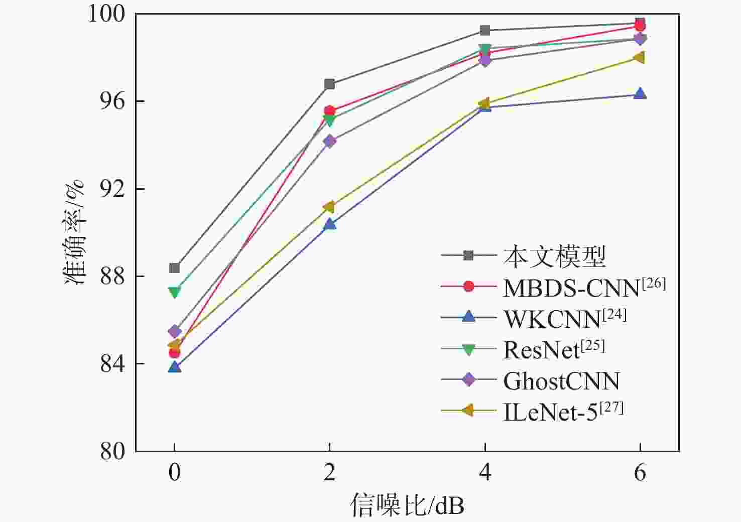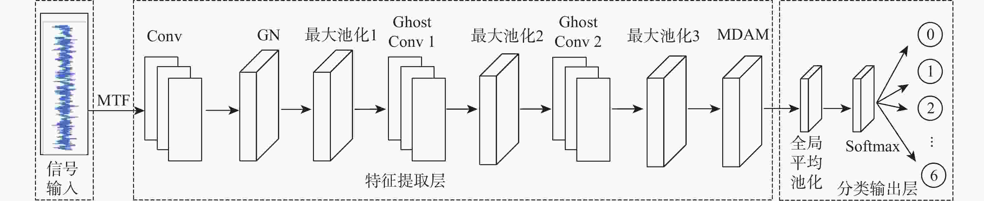 特征层 卷积核数量 卷积核大小 输出大小 输入 (128,128,1) 卷积层 32 5×5 (128,128,32) GN (128,128,32) 最大池化1 32 2×2 (64,64,32) Ghost Conv 1 32 3×3 (64,64,32) GN (64,64,32) 最大池化2 32 2×2 (32,32,32) Ghost Conv 2 32 3×3 (32,32,32) GN (32,32,32) 最大池化3 2×2 (16,16,32) MDAM (16,16,32) 全局平均池化 (1,1,32) 分类器 7 (7) 损伤位置 标签 损伤直径/mm 样本数量 数据集A 数据集B 数据集C 训练集 测试集 训练集 测试集 训练集 测试集 正常 0 0 240 100 240 100 240 100 内圈 1 0.18 240 100 240 100 240 100 2 0.36 240 100 240 100 240 100 外圈 3 0.18 240 100 240 100 240 100 4 0.36 240 100 240 100 240 100 滚动体 5 0.18 240 100 240 100 240 100 6 0.36 240 100 240 100 240 100 表 3 不同模型参数量和训练时间