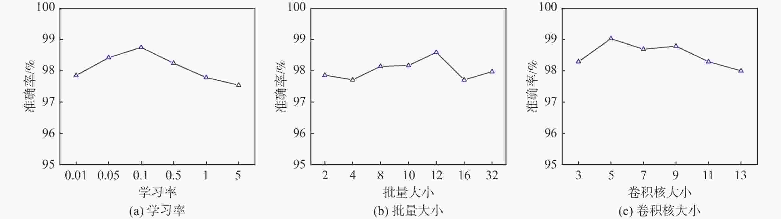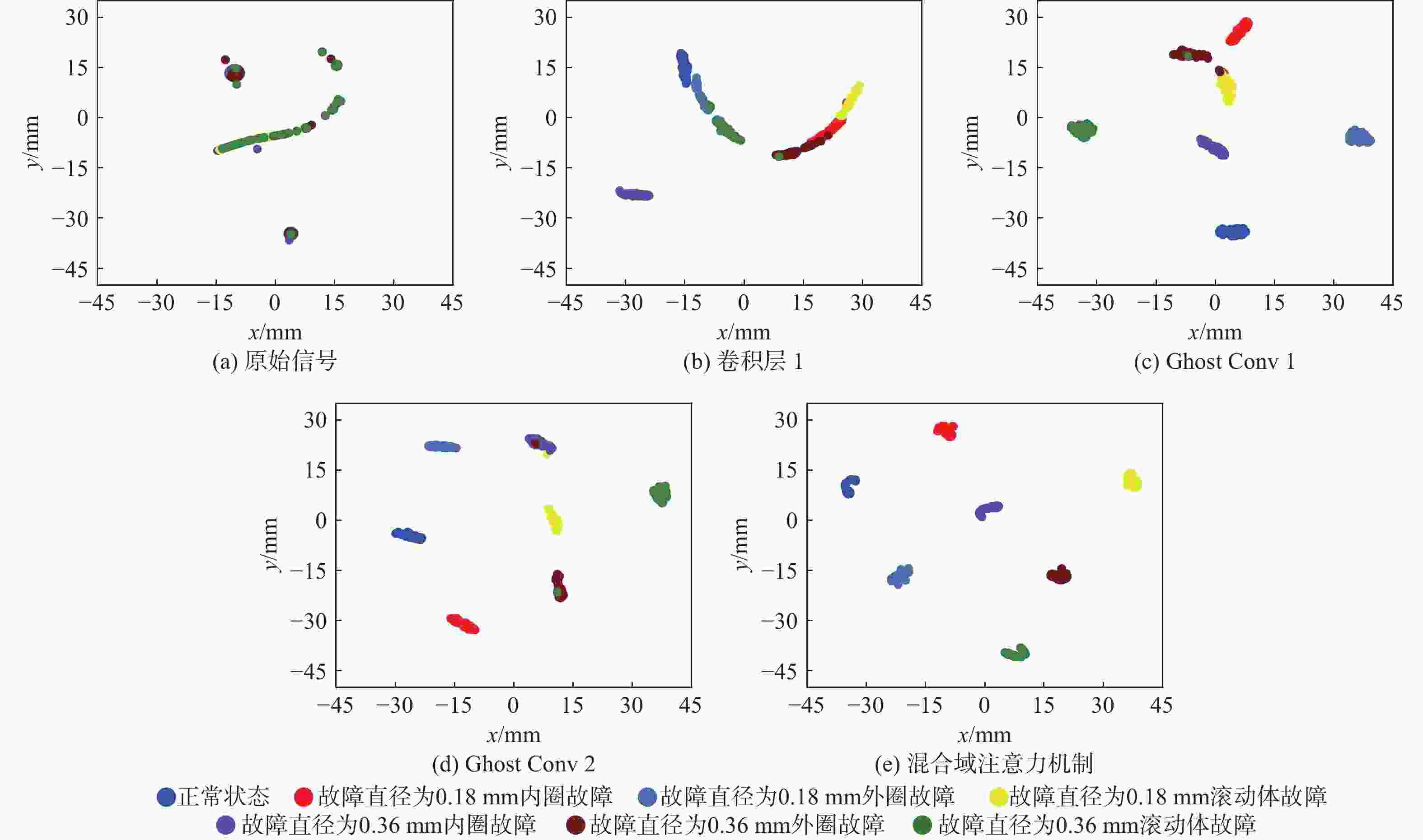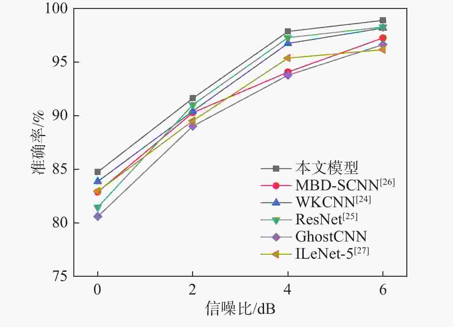 特征层 卷积核数量 卷积核大小 输出大小 输入 (128,128,1) 卷积层 32 5×5 (128,128,32) GN (128,128,32) 最大池化1 32 2×2 (64,64,32) Ghost Conv 1 32 3×3 (64,64,32) GN (64,64,32) 最大池化2 32 2×2 (32,32,32) Ghost Conv 2 32 3×3 (32,32,32) GN (32,32,32) 最大池化3 2×2 (16,16,32) MDAM (16,16,32) 全局平均池化 (1,1,32) 分类器 7 (7) 损伤位置 标签 损伤直径/mm 样本数量 数据集A 数据集B 数据集C 训练集 测试集 训练集 测试集 训练集 测试集 正常 0 0 240 100 240 100 240 100 内圈 1 0.18 240 100 240 100 240 100 2 0.36 240 100 240 100 240 100 外圈 3 0.18 240 100 240 100 240 100 4 0.36 240 100 240 100 240 100 滚动体 5 0.18 240 100 240 100 240 100 6 0.36 240 100 240 100 240 100 表 3 不同模型参数量和训练时间