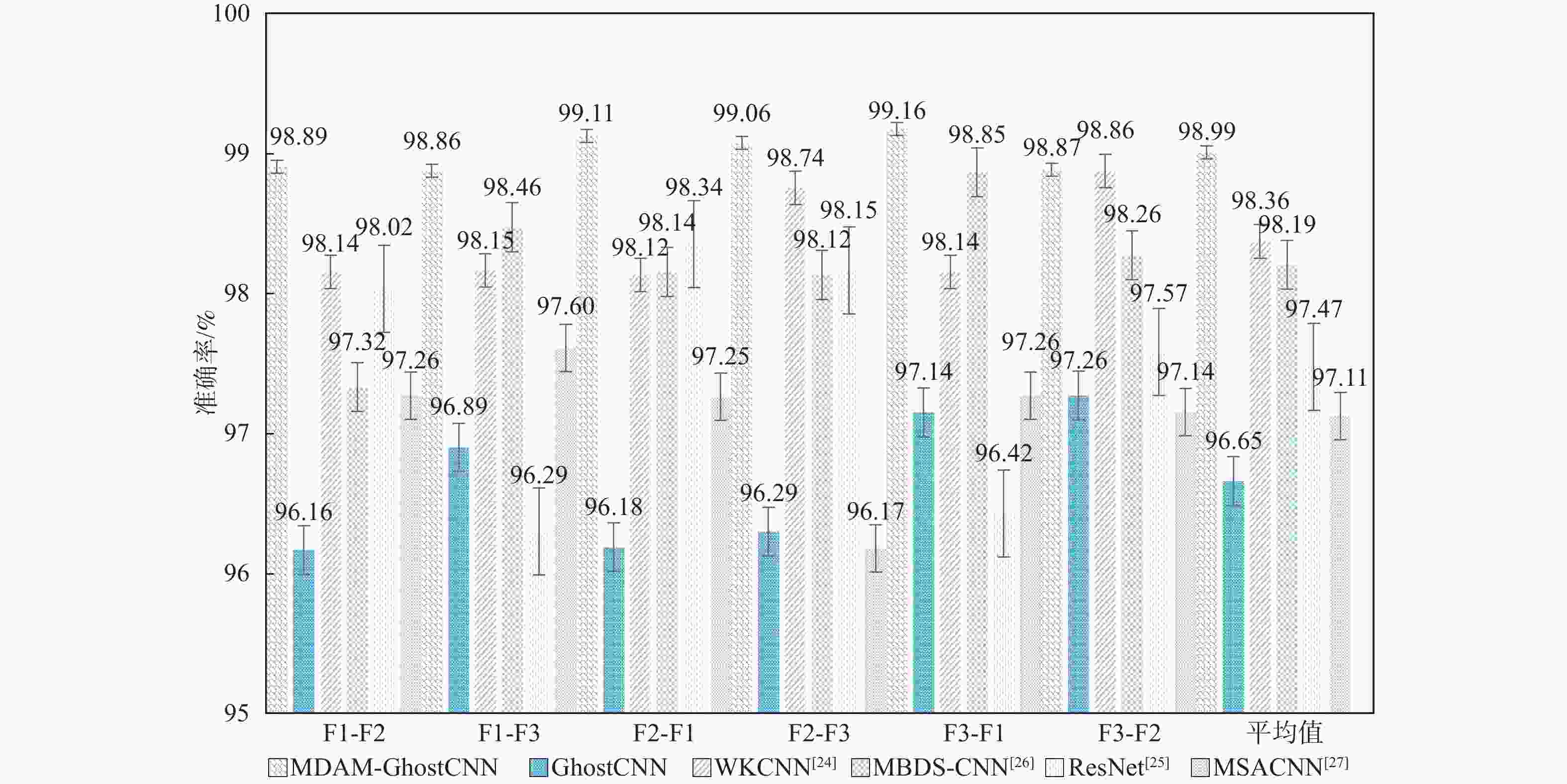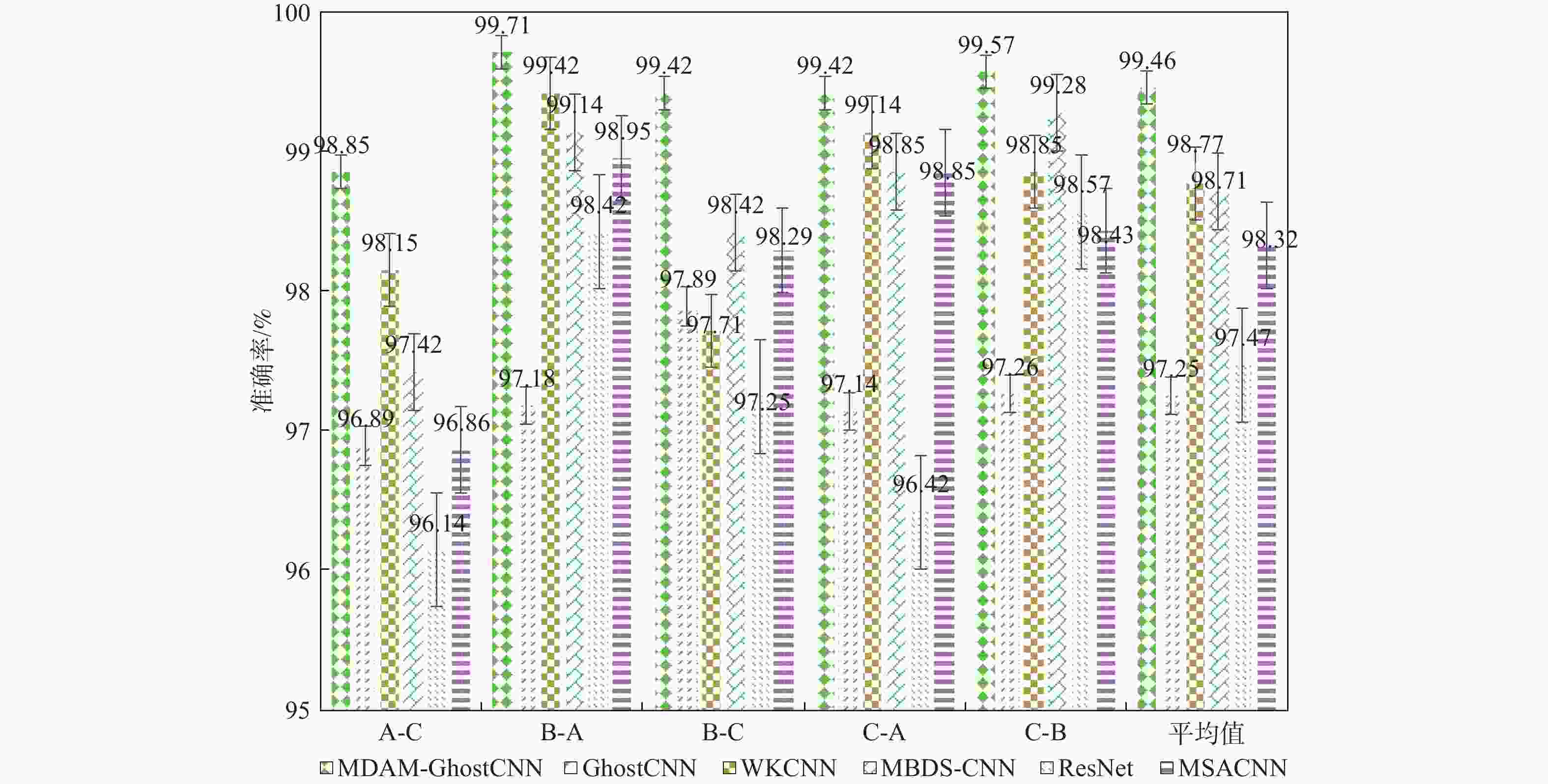 针对传统故障诊断方法特征提取不充分、计算复杂及在变工况下识别准确率低的问题,提出一种基于混合域注意力机制(MDAM)-GhostCNN的滚动轴承故障诊断方法。采用马尔可夫转移场(MTF)将轴承振动信号转化为具有时间相关性的二维特征图;利用Ghost卷积计算精简的优点,构造出GhostCNN;设计一种MDAM,使网络从通道和空间2个维度充分捕获特征信息,实现特征通道间相互依赖的同时让网络有效关注特征空间信息。由此,构建出MDAM-GhostCNN模型。将MTF二维特征图输入到MDAM-GhostCNN模型中进行训练并输出诊断结果。采用凯斯西储大学和江南大学(JNU)轴承数据集进行实验验证,并对其数据集进行加噪处理。结果表明:在变工况下,所建模型有着更高的识别准确率、抗噪性能和泛化性能。