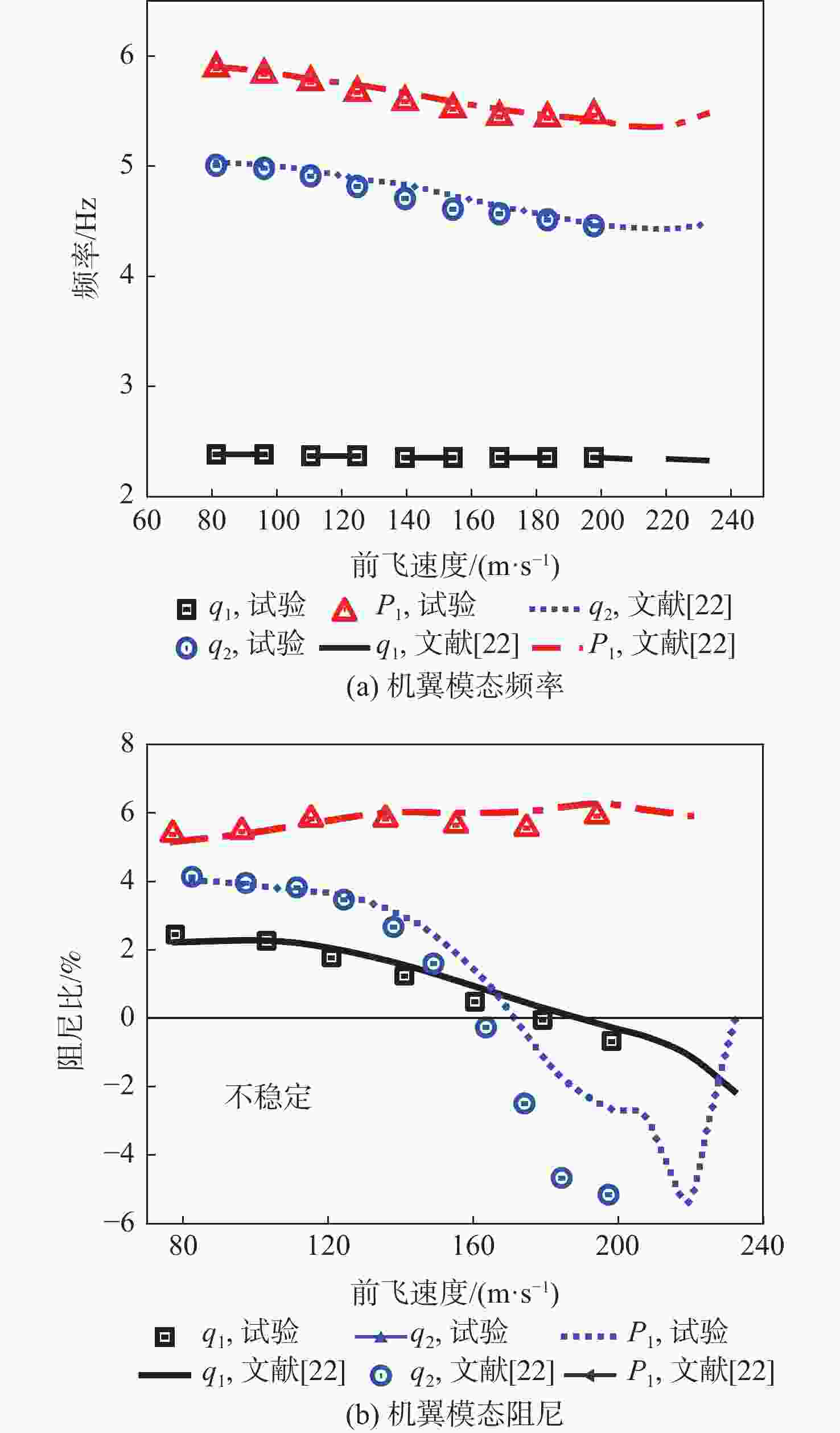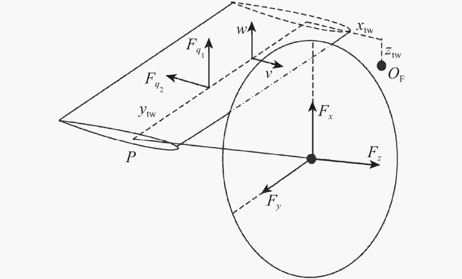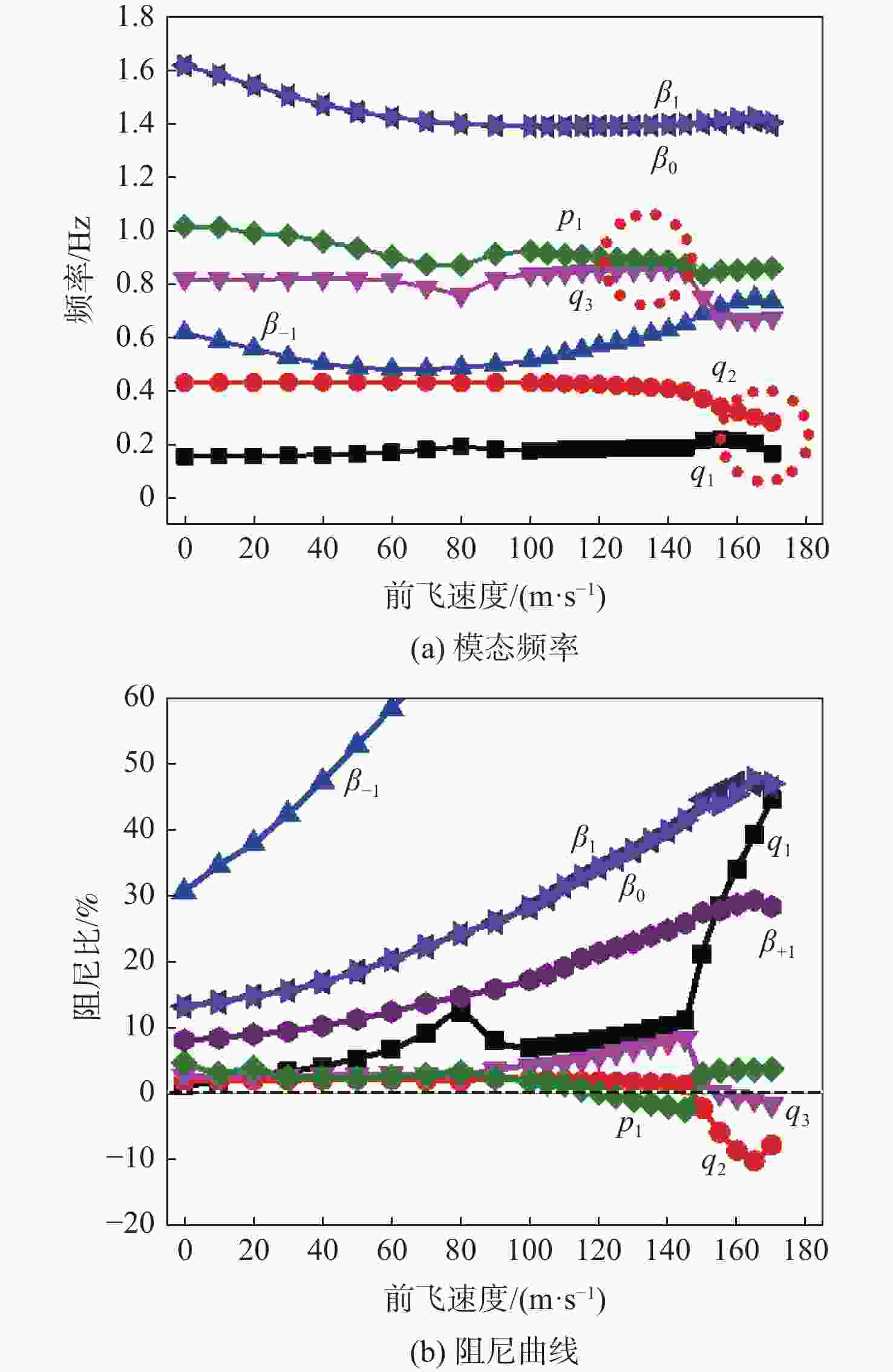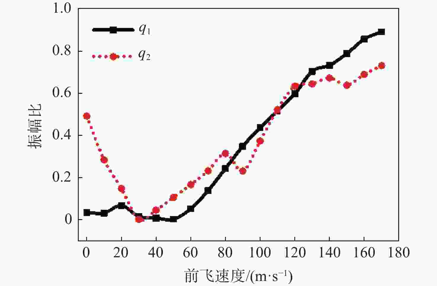 部件 参数 数值 旋翼 片数 3 洛克数 3.83 半径/m 3.82 预锥角/(º) 2.5 转速/(r·min−1) 458 机翼/短舱 一阶垂向弯曲频率q1/Hz 2.4 一阶弦向弯曲频率q2/Hz 5.1 一阶扭转频率p1/Hz 5.9 表 2 耦合系统主要动力学参数
