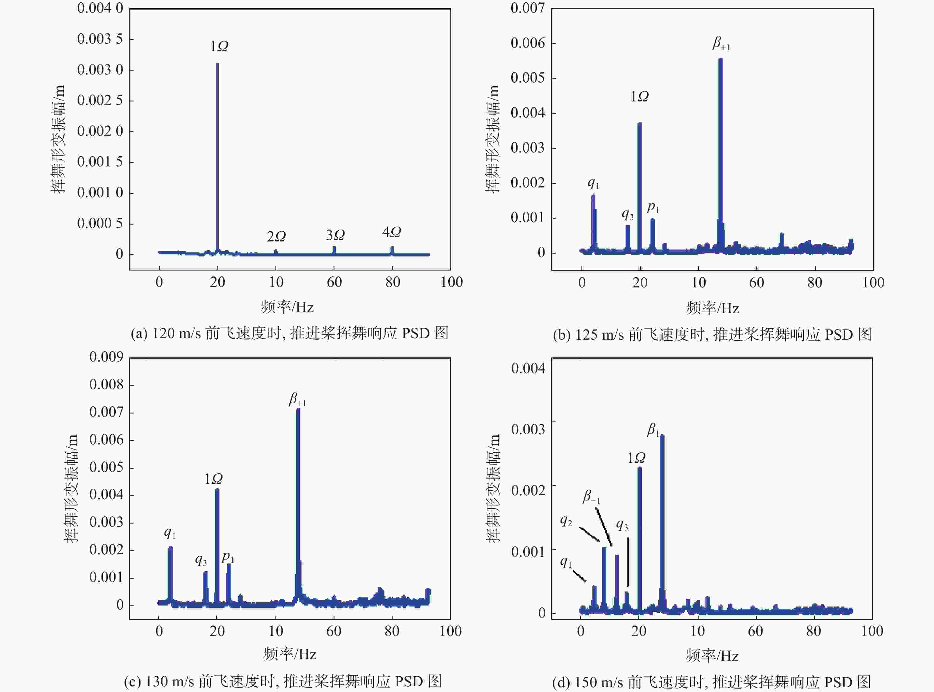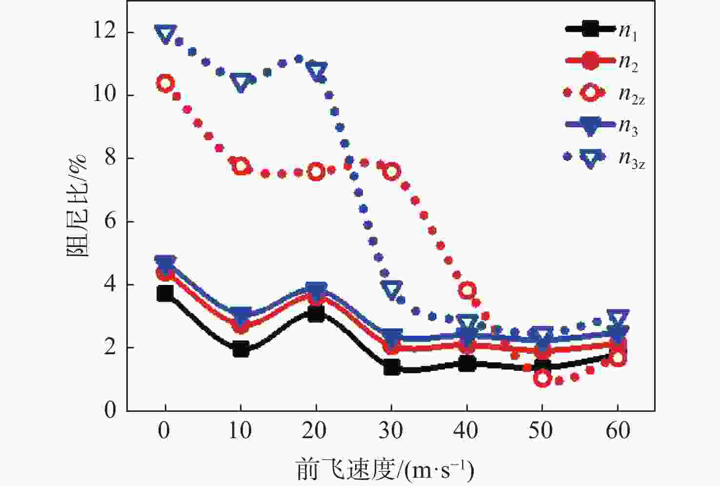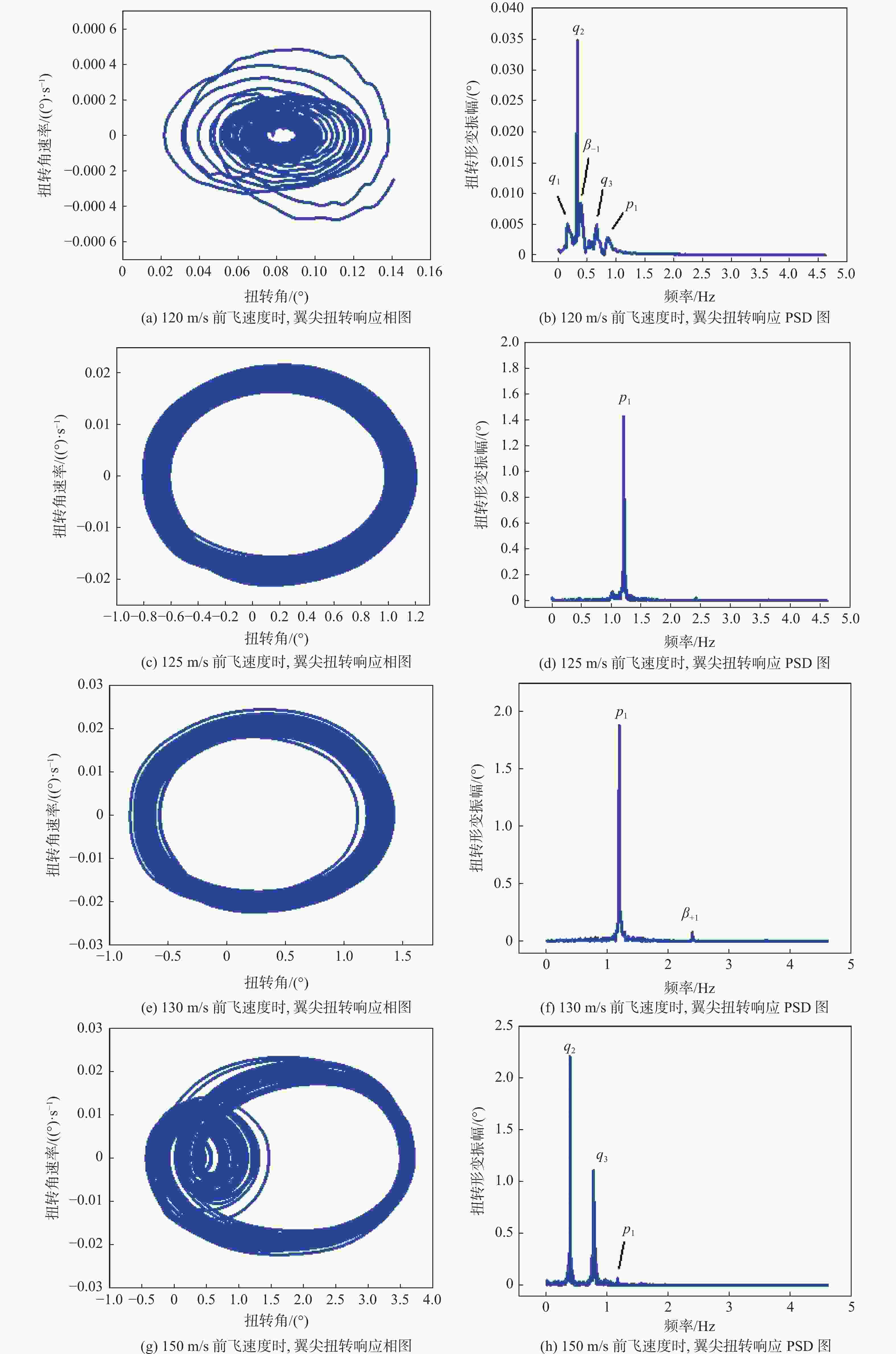 部件 参数 数值 旋翼 片数 3 洛克数 3.83 半径/m 3.82 预锥角/(º) 2.5 转速/(r·min−1) 458 机翼/短舱 一阶垂向弯曲频率q1/Hz 2.4 一阶弦向弯曲频率q2/Hz 5.1 一阶扭转频率p1/Hz 5.9 表 2 耦合系统主要动力学参数