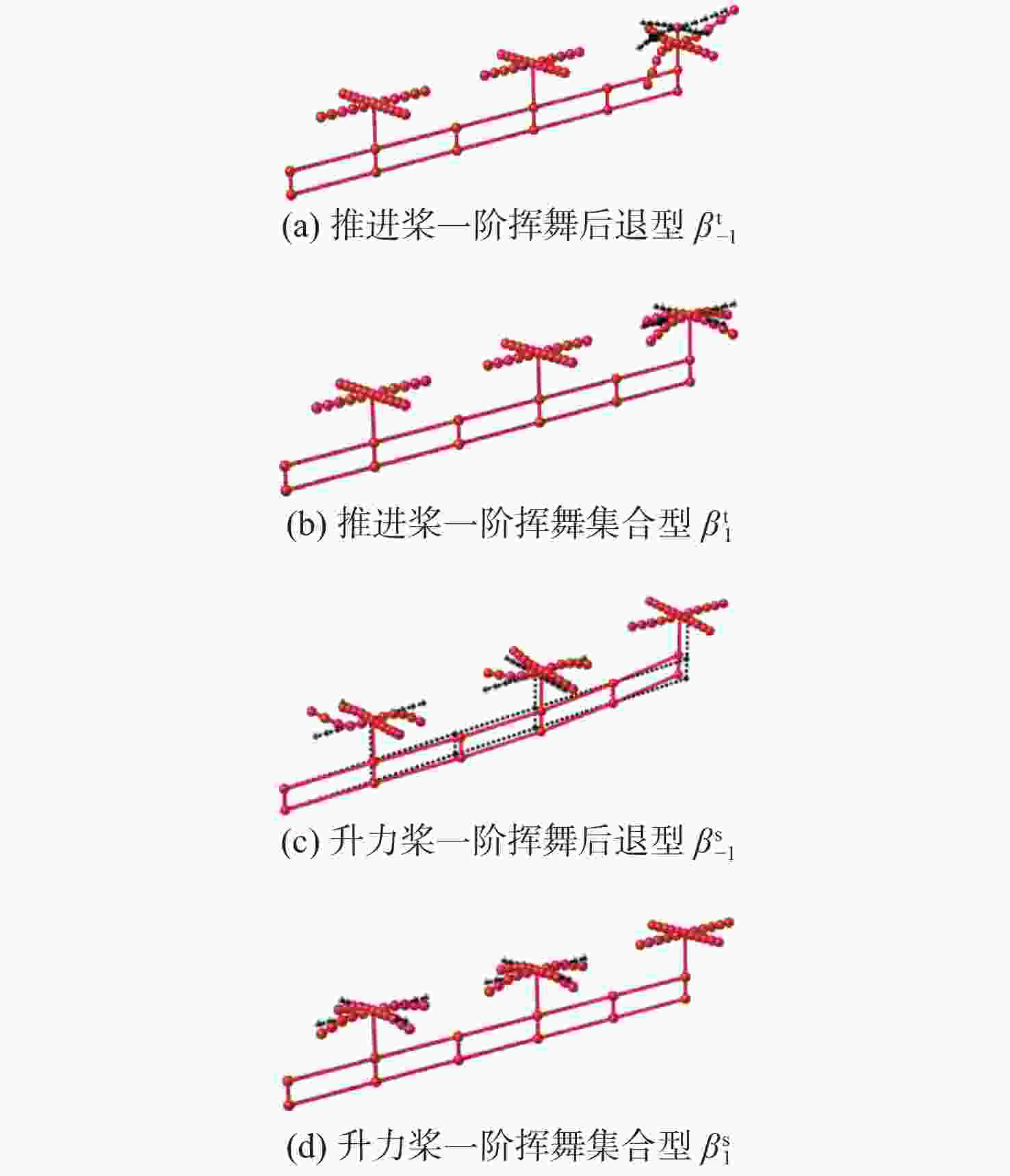 参数 数值 旋翼半径R/m 0.7 旋翼片数 4 额定转速Ω /(r·min−1) 1300 短舱质量mp/kg 3.8 短舱长度h/m 0.35 机翼半展长RW/m 4 推进桨一阶挥舞$\beta^{\;t}_{1} $频率/Hz 33.75 升力桨一阶挥舞$\beta^{\;{\mathrm{s}}}_{1} $频率/Hz 42.25 一阶垂向弯曲q1耦合频率/Hz 3.68 一阶弦向弯曲q2耦合频率/Hz 9.97 二阶垂向弯曲q3耦合频率/Hz 19.07 一阶扭转p1耦合频率/Hz 25.91 表 3 半展系统固有频率