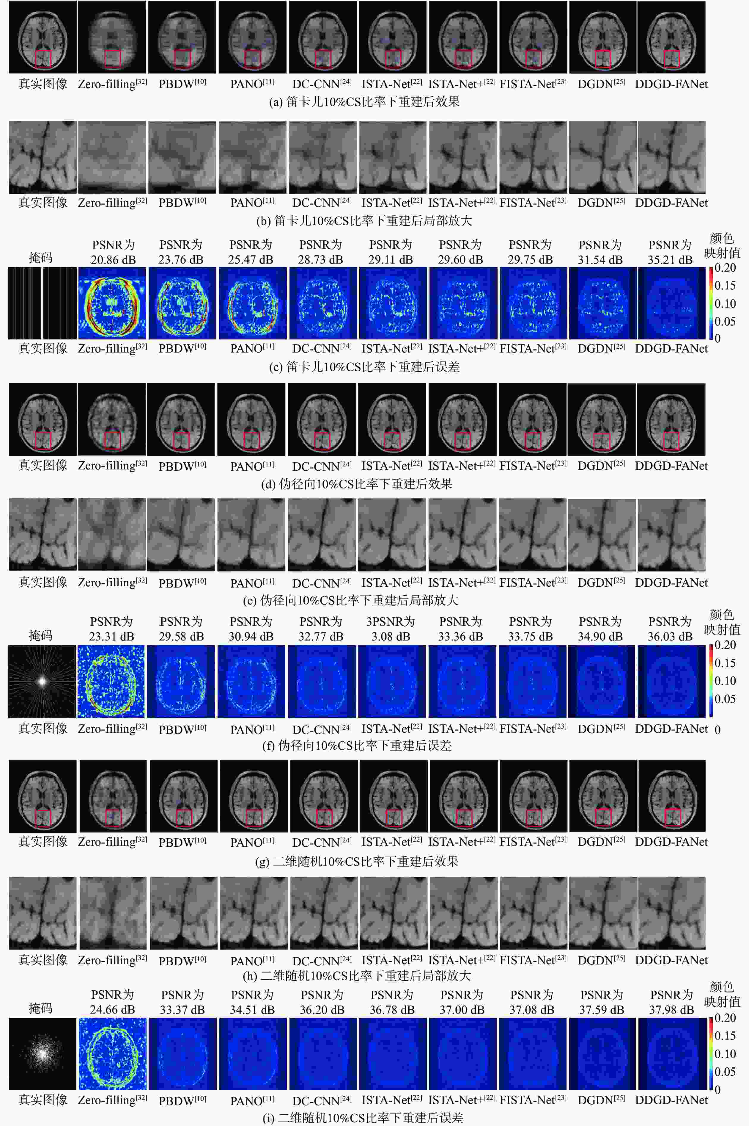 掩码类型 方法 PSNR/dB SSIM CS比率为10% CS比率为20% CS比率为30% CS比率为10% CS比率为20% CS比率为30% Zero-filling[32] 23.84 26.40 31.14 0.574 3 0.661 1 0.786 5 PBDW[10] 26.82 32.41 35.05 0.735 5 0.866 0 0.911 6 PANO[11] 28.98 34.62 36.75 0.789 7 0.893 3 0.922 2 DC-CNN[24] 30.04 35.75 38.48 0.823 5 0.920 5 0.949 3 笛卡儿 ISTA-Net[22] 30.28 36.58 39.17 0.825 6 0.933 4 0.956 8 ISTA-Net+[22] 30.86 37.03 39.63 0.845 5 0.935 5 0.959 7 FISTA-Net[23] 31.06 37.29 39.86 0.844 4 0.939 6 0.960 7 DGDN[25] 32.53 38.31 40.61 0.886 3 0.949 9 0.965 6 DDGD-FANet 35.87 39.55 41.41 0.932 0 0.959 3 0.970 1 表 2 不同CS比率伪径向和二维随机采样模式下大脑数据集建效果对比