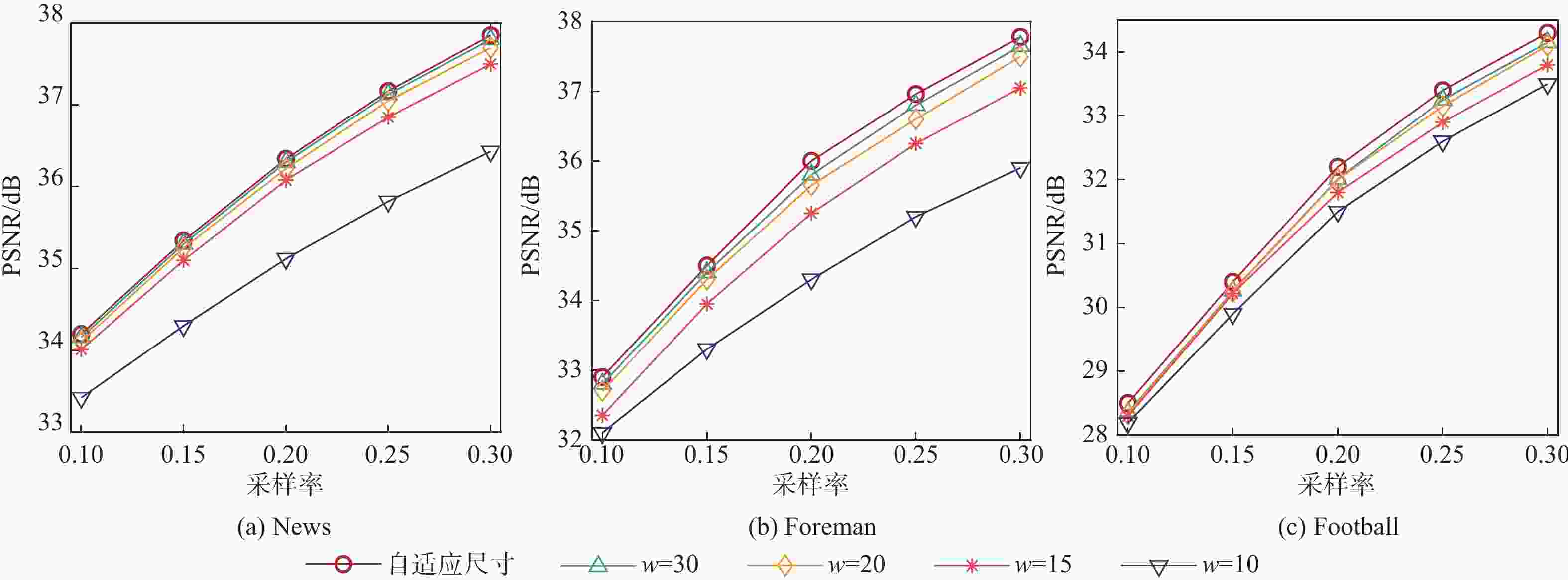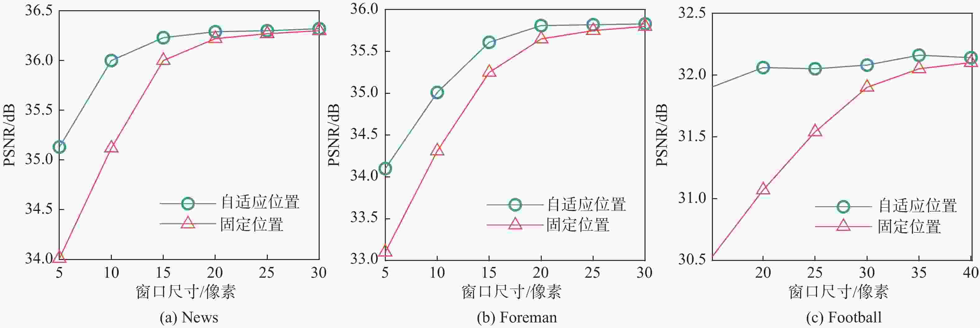 为0.3010 33.5 37.5 42.3 45.2 47.3 20 49.3 52.3 57.3 64.3 74.6 30 70.2 76.4 82.4 86.6 95.3 自适应尺寸 42.2 46.9 51.6 59.1 63.1 表 2 不同运动程度视频序列上不同算法的PSNR