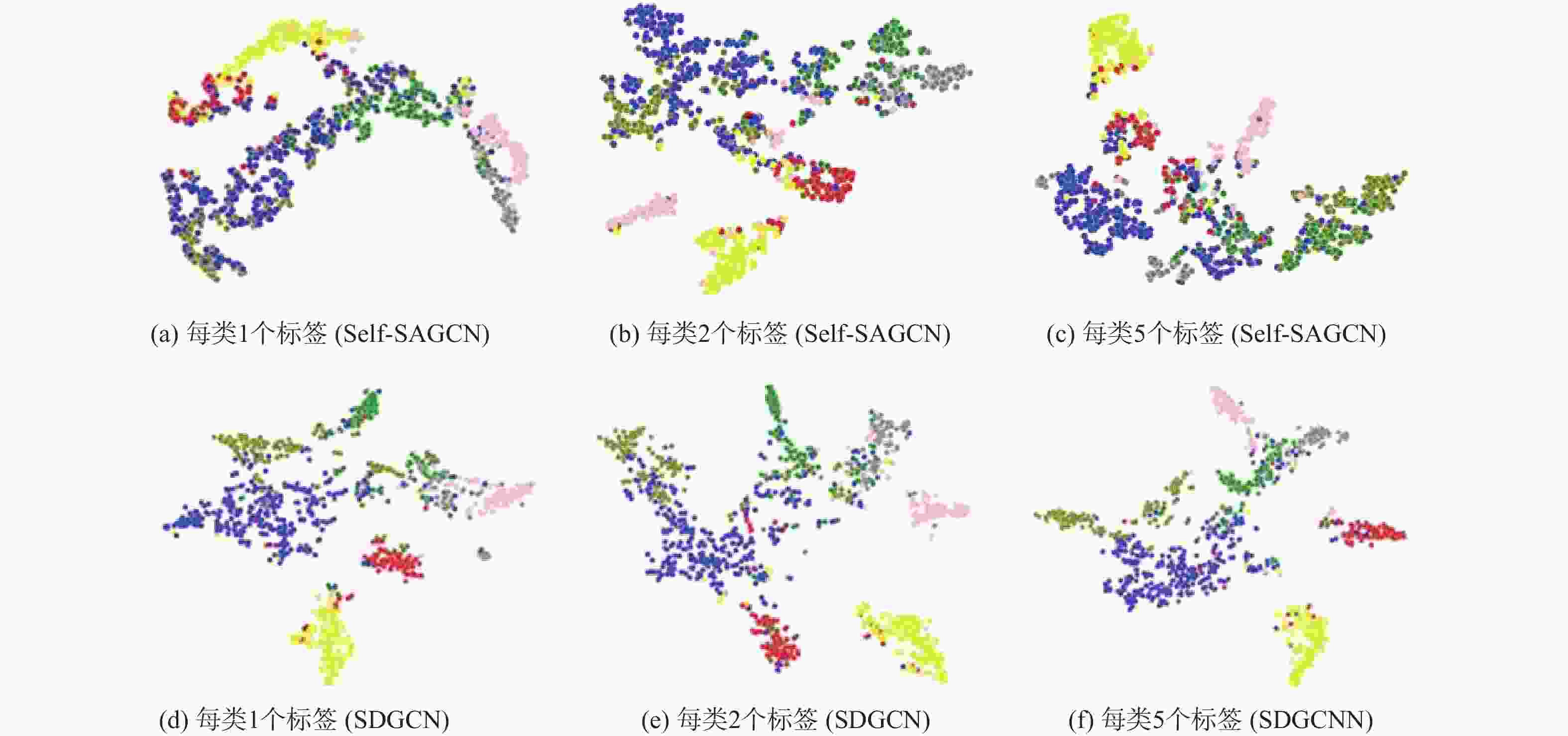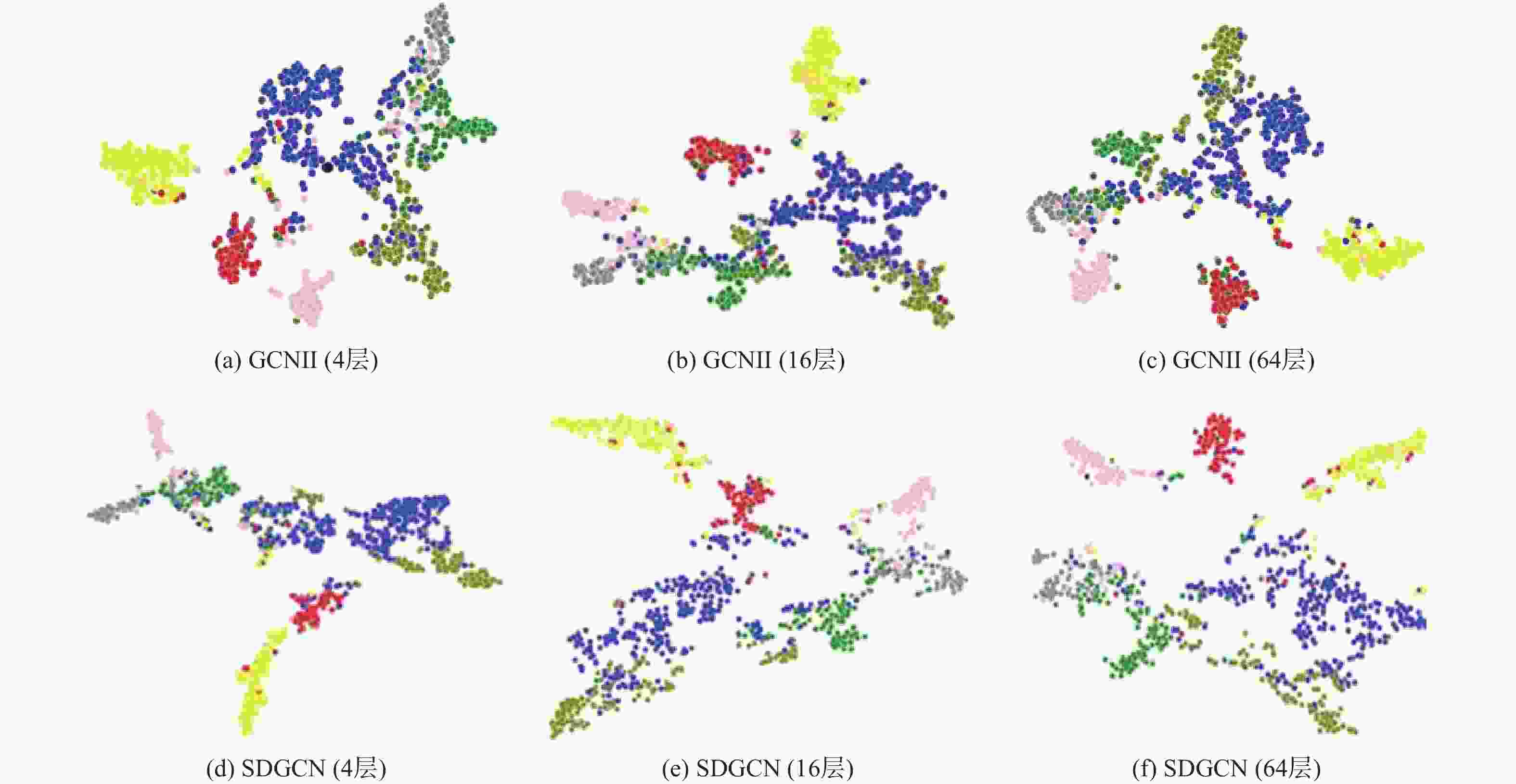 % 模型 每类1个标签 每类2个标签 每类5个标签 Cora Citeseer PubMed Cora Citeseer PubMed Cora Citeseer PubMed MLP 42.5 27.9 49.5 48.9 33.6 55.9 59.9 43.2 65.1 GCN[12] 43.2 33.6 51.9 50.1 41.8 54.9 69.0 53.2 68.1 GAT[13] 44.6 33.9 52.1 59.6 44.1 58.6 70.6 54.3 68.8 DAGNN[39] 59.1 44.3 56.3 64.2 53.8 64.8 71.2 54.7 70.6 Self-SAGCN[25] 61.2 56.8 63.2 70.8 63.9 68.8 75.1 66.9 71.9 SDGCN 63.8 57.8 65.3 71.5 64.4 70.9 78.6 68.1 73.5 表 3 在不同模型深度条件下模型聚类精度对比