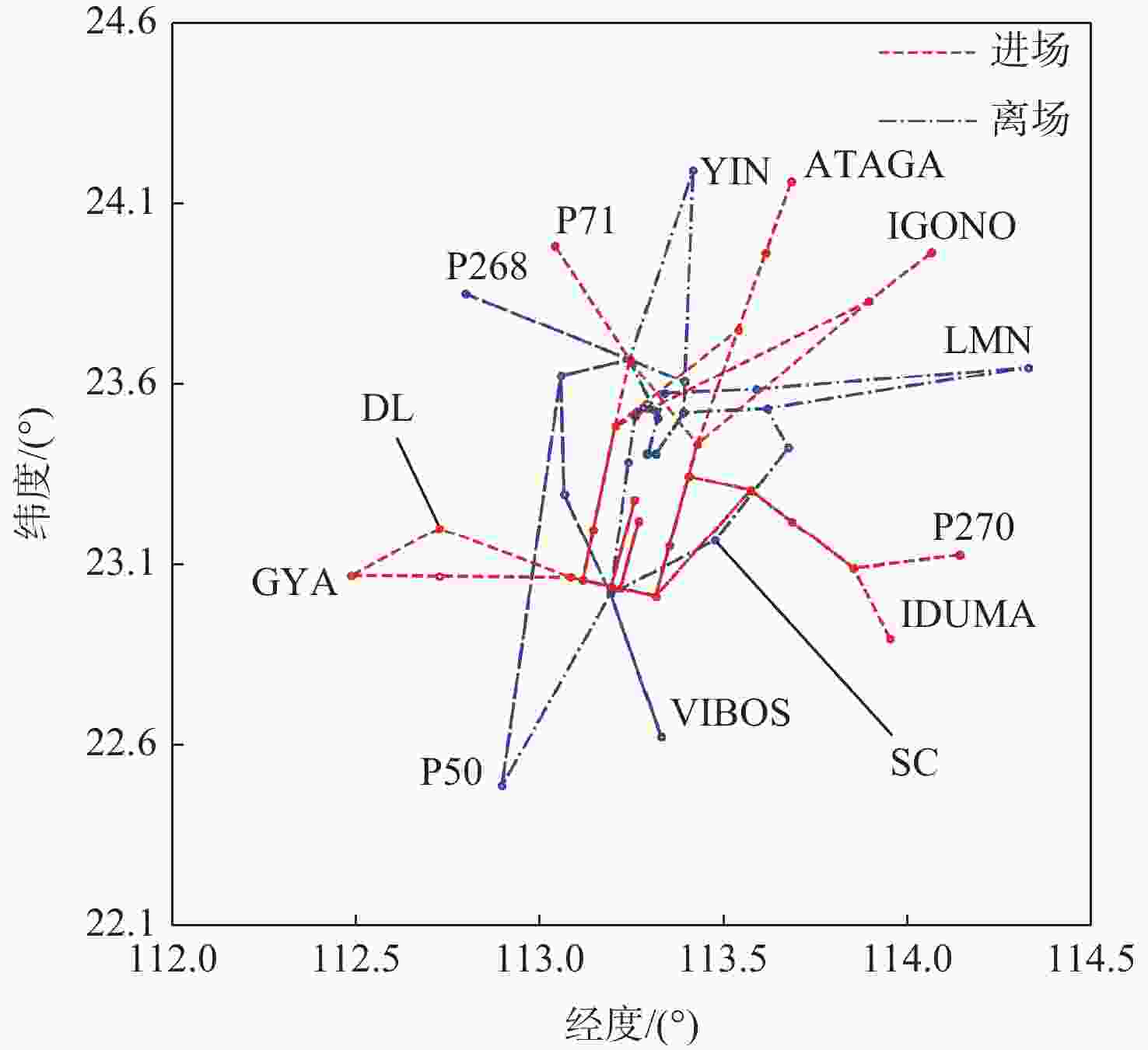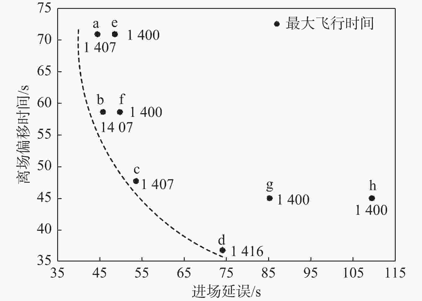 参数组合 进场路径 平均进场延误/s 平均离场偏离/s 最大飞行时间/s 平均飞行时间/s 无法调度/架 1 STAR 66.8 21.8 1 512.0 1 200.9 2 2 STAR 67.7 40.0 1 444.0 1 203.9 7 1 GYA-DL 86.3 21.8 1 549.0 1 223.9 0 2 GYA-DL 112.6 36.4 1 602.0 1 241.5 5 2 GYA-DL